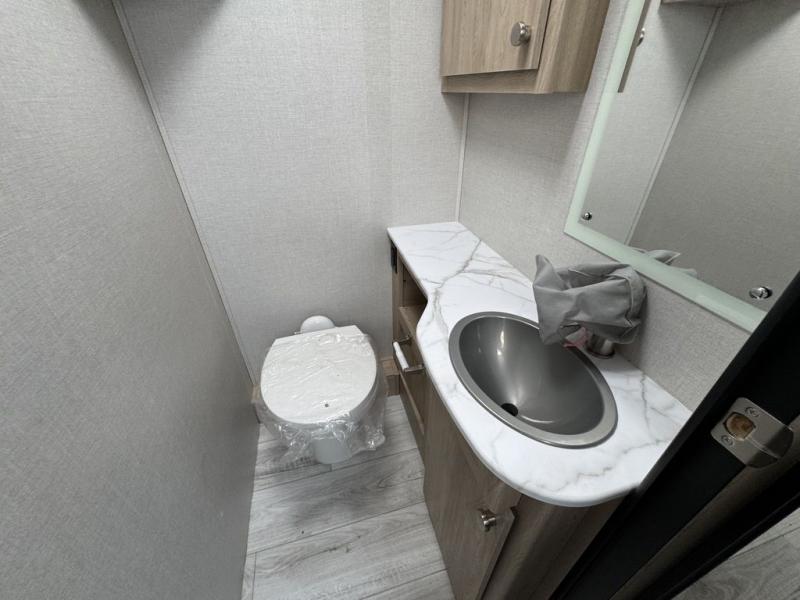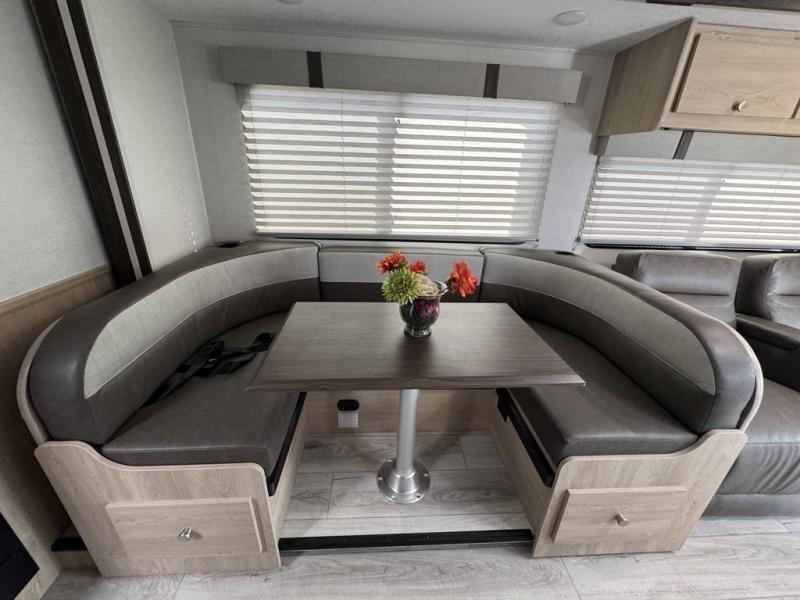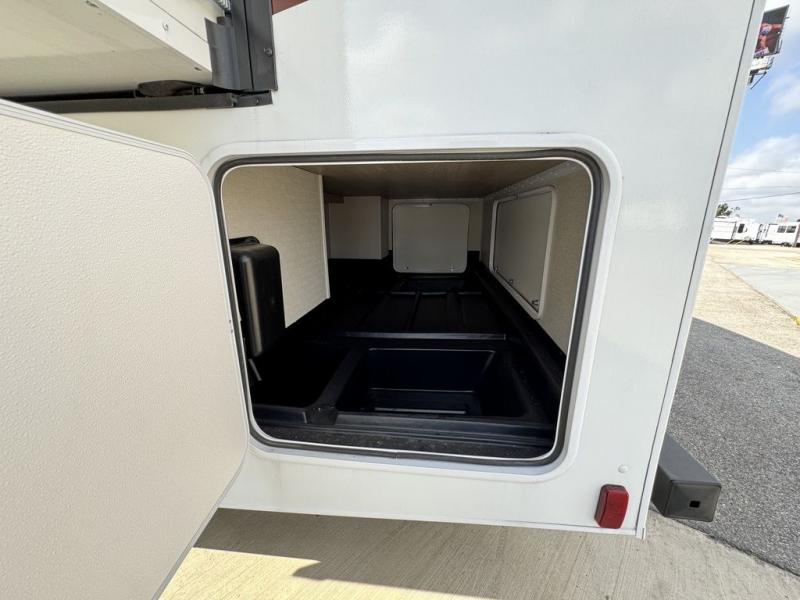 You'll have the time of your life in this Leprechaun Class C gas motorhome! There is a rear private bedroom with a queen-size bed and a wardrobe slide, and the bedroom is right next to the bathroom for convenience. Here you'll find a private toilet and sink with the shower right across the hall, and you can close off this space to make one big bathroom if you want! Out in the main living area, there is a large slide that holds the U-shaped dinette and sofa. These pieces of furniture sit directly across from the kitchen so that you can chat with the chef while preparing meals on the three-burner range or in the microwave. If you enjoy cooking outdoors, you might want to choose the optional camp kitchen!