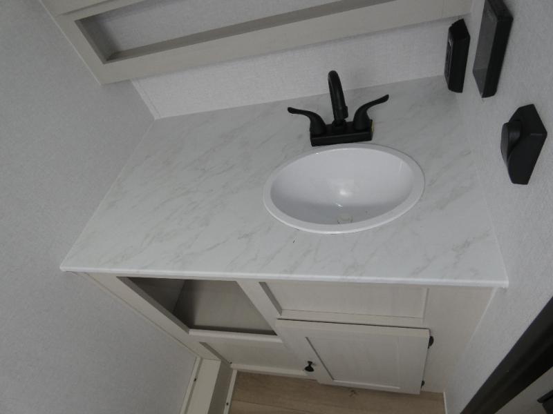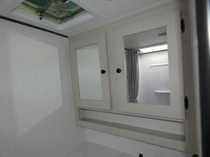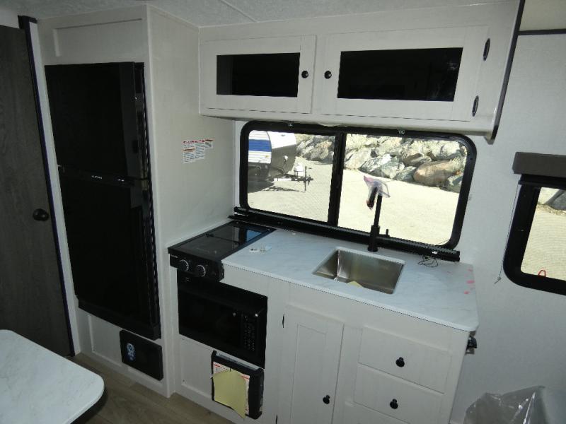 Enjoy fun camping experiences in this cozy camper for two to four depending on size! You will love the full rear bath with a nice vanity and sink including a medicine cabinet, toilet, and shower. There is a booth dinette for dining and games, and it can also be transformed into sleeping for one or two depending on size. Opposite the dinette, you will find your functional kitchen with a refrigerator, cooktop, and round single sink. Overhead cabinets plus drawers and cupboards below allow for ample storage of your dishes and dry goods. In front, there is a comfortable bed for two with wardrobes on either side and overhead cabinets for your personal belongings. There is also storage beneath the bed for larger items like extra blankets or your suitcases. There is also an exterior pass-thru storage compartment in front for your camp chairs and games!