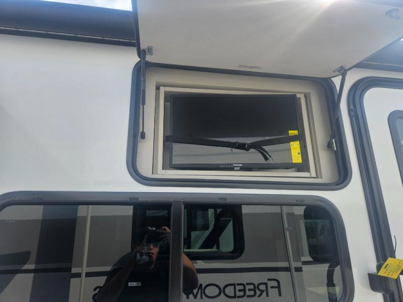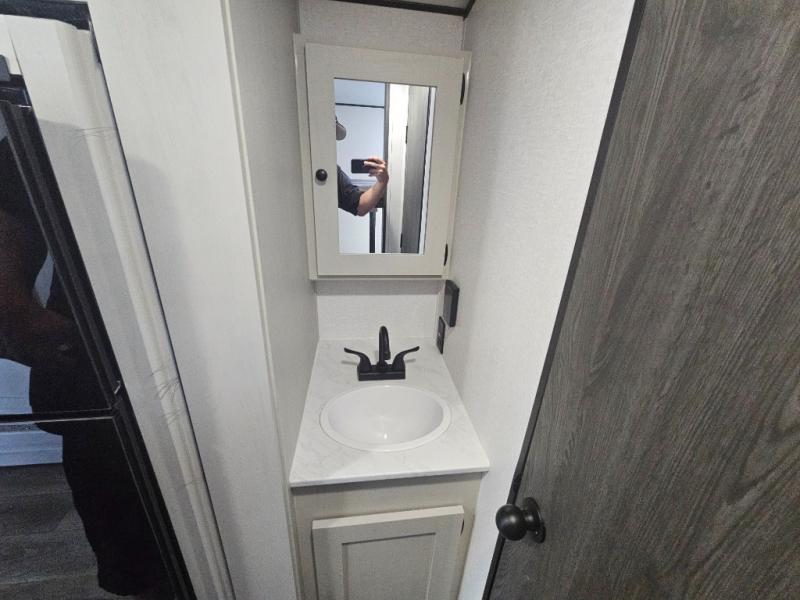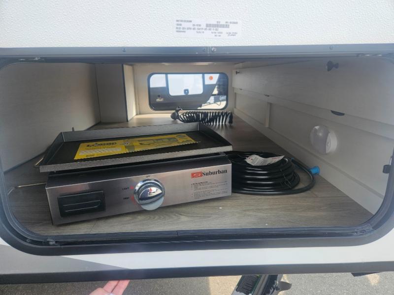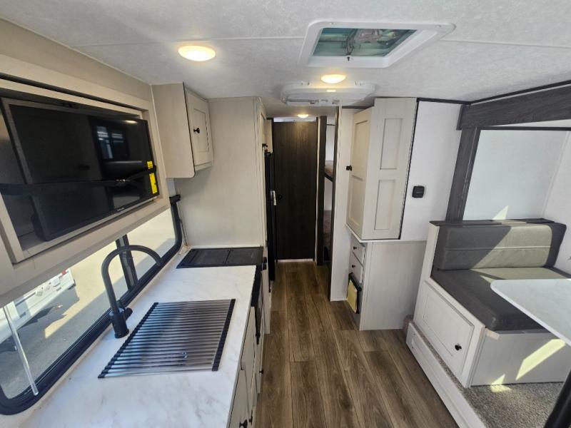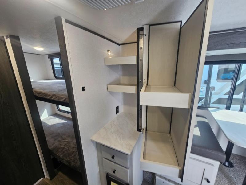 The Family Friendly 19BHB features our Popular Spinning Inside / Outside Refrigerator, Inside / Outside TV, a Coffee Bar Pullout Pantry, Under Bunk Storage with a Cargo Door, and a Slideout with a Booth Dinette.