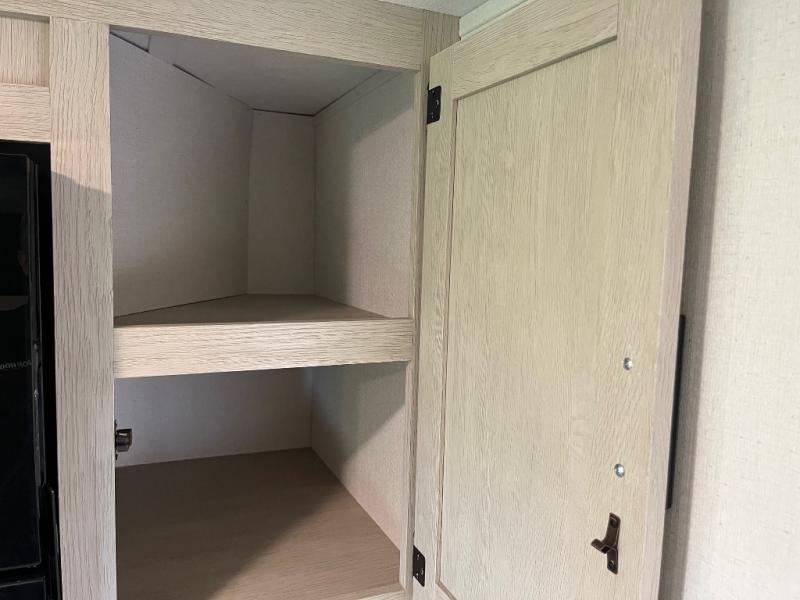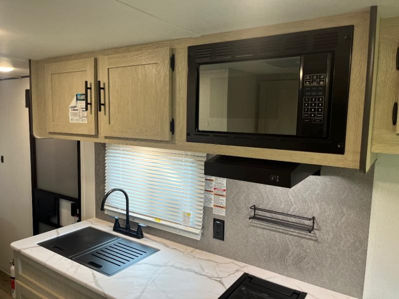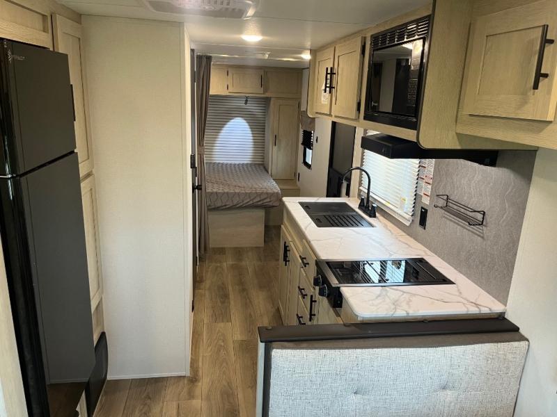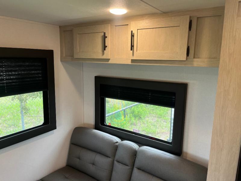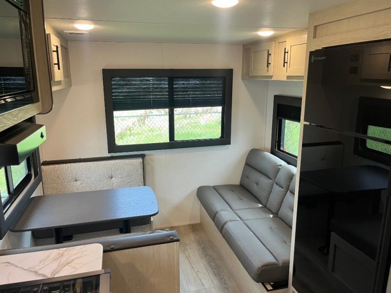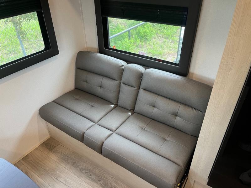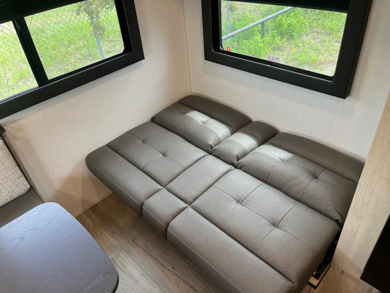 This non-slide trailer features everything you need for a cozy weekend away a a couples unit or small family of three or four. The rear of the unit features ample seating with opposing sofa and booth dinette. Each can accommodate a tired camper at night if needed. The kitchen is fully equipped for your camping trips featuring a three burner cooktop, a microwave cabinet, a large sink, plus a pantry and residential style refrigerator for food storage. In the front of this unit, a 60" x 74" RV queen bed provides a comfortable night's rest after a full day of fun. Outside, enjoy a nice pass-through storage compartment to easily access all of your outdoor camping gear plus more.