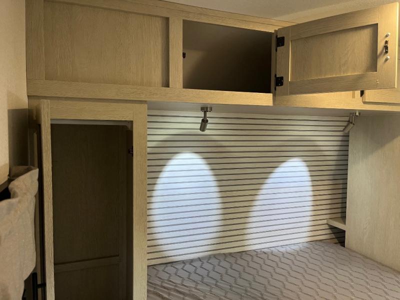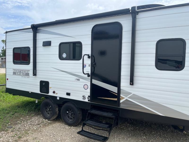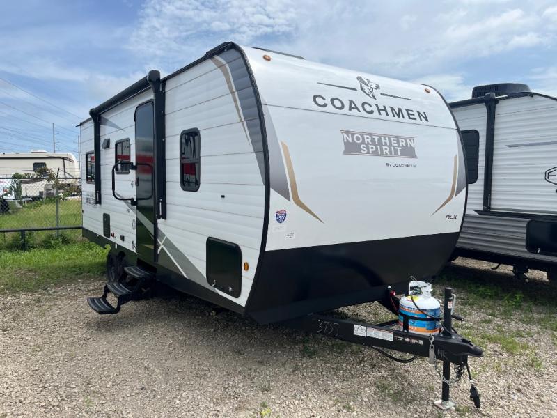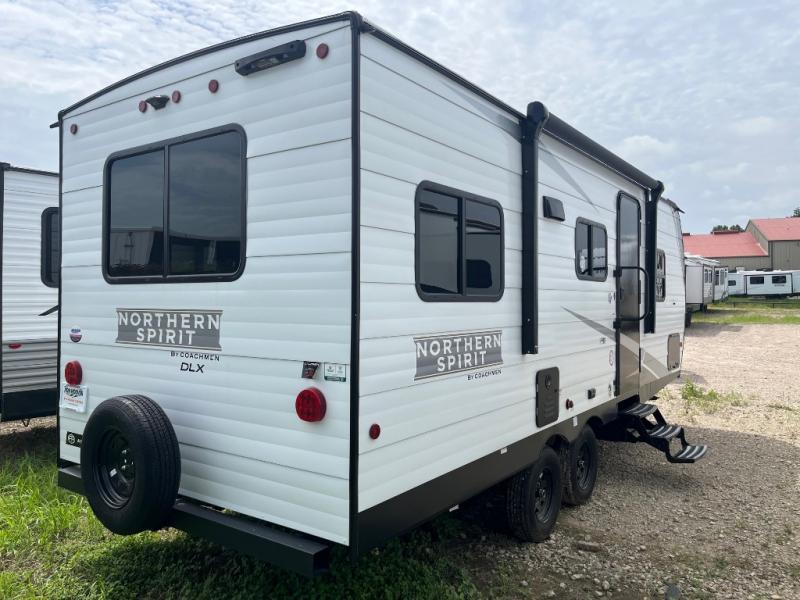 In any Northern Spirit DLX travel trailer by Coachmen, you will find quality craftsmanship along with an affordable price tag. These units each feature four stabilizer jacks to make setting up easier and an enclosed underbelly for added protection as you travel. The Base Camp Package provides each unit with black tank flush, a monitor panel for quick access to the functions of your unit, a 13.5K A/C unit, and a tankless water heater for added convenience. Inside, you'll find seamless countertops, sink covers, a portable Bluetooth speaker, and more comforts!