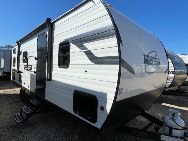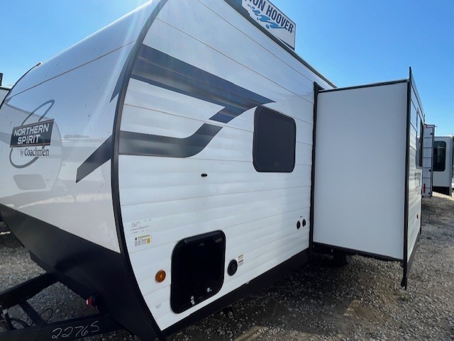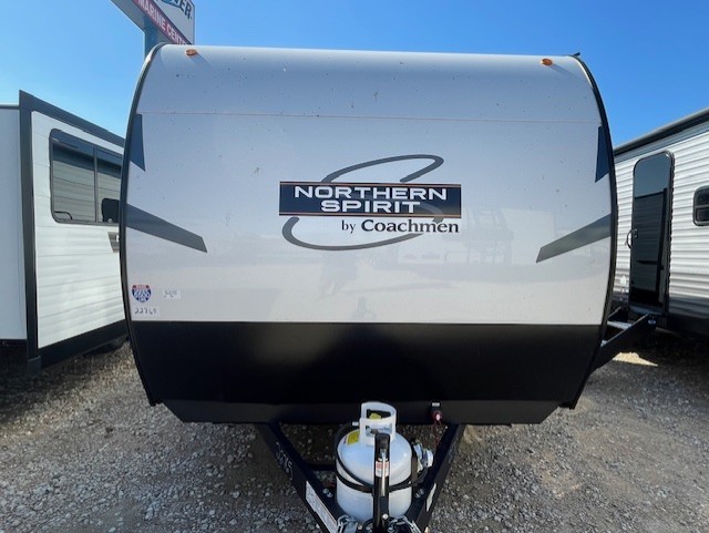 In any Northern Spirit DLX travel trailer by Coachmen, you will find quality craftsmanship along with an affordable price tag. These units each feature four stabilizer jacks to make setting up easier and an enclosed underbelly for added protection as you travel. The Base Camp Package provides each unit with black tank flush, a monitor panel for quick access to the functions of your unit, a 13.5K A/C unit, and a tankless water heater for added convenience. Inside, you'll find seamless countertops, sink covers, a portable Bluetooth speaker, and more comforts!