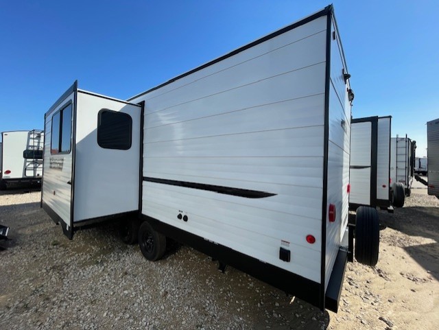 Enjoy camping with family and friends in this bunk model! There are double-size bunks in the rear roadside corner and a full bath with a shower, vanity, and toilet in the opposite rear corner. There is ample counter space in the kitchen, plus there is an outside kitchen when you want to cook outdoors. You will also love the pantry in this unit that is washer/dryer ready if you want to add those appliances. A booth dinette within the large slide will provide a place to dine and play games together, and there is a TV mount across the room if you want to add entertainment. You'll love having a front bedroom with a 60" x 74" bed and dual wardrobes to keep your things picked up!