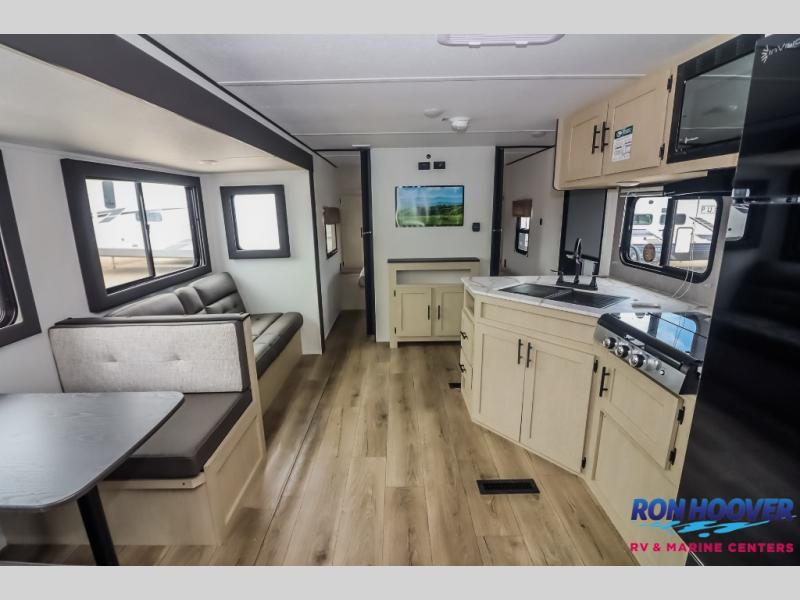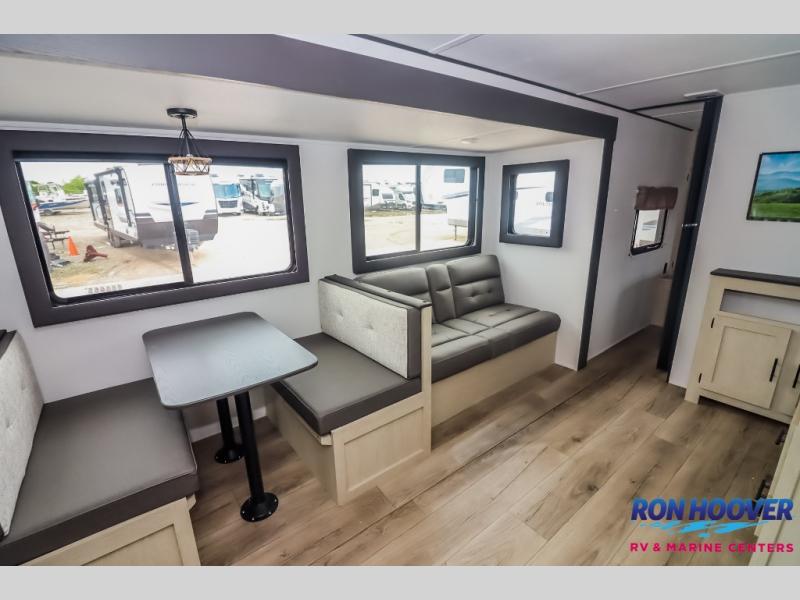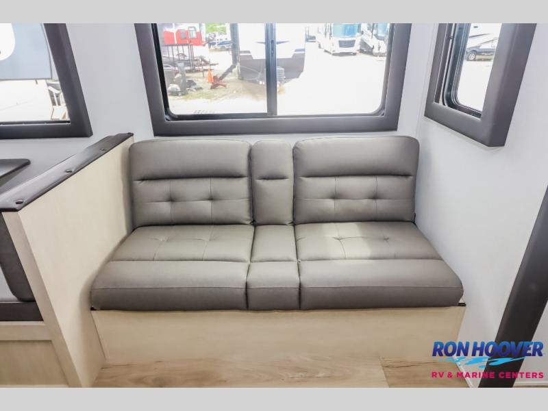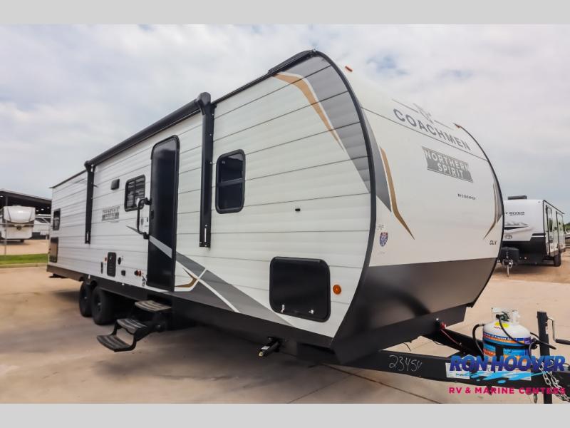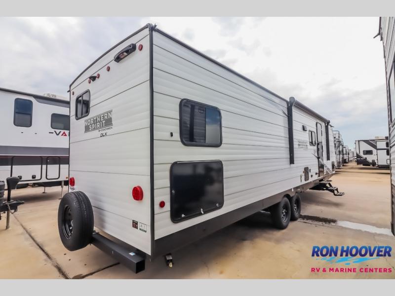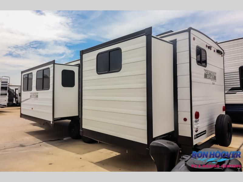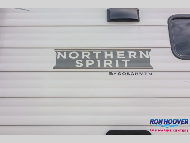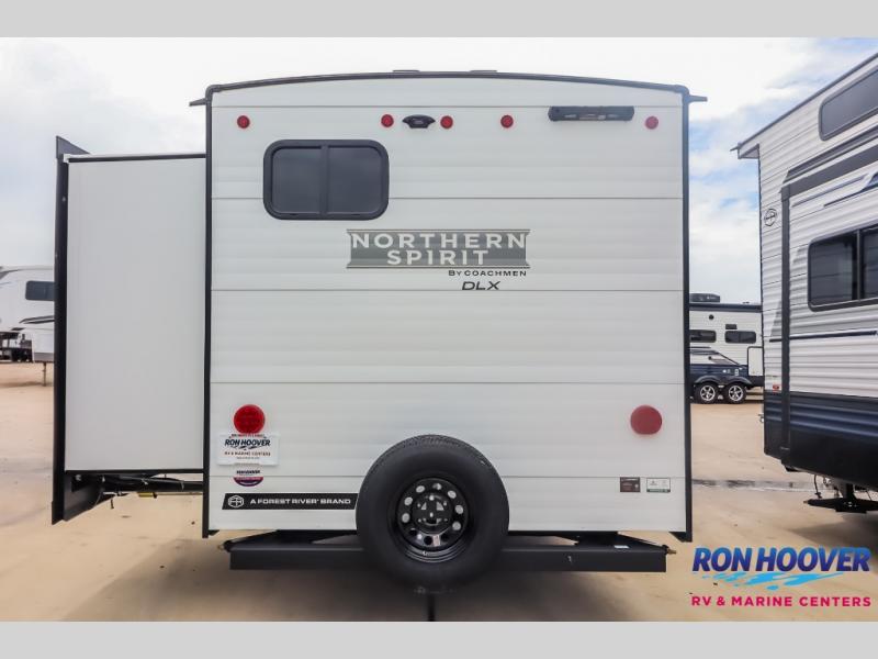 In any Northern Spirit DLX travel trailer by Coachmen, you will find quality craftsmanship along with an affordable price tag. These units each feature four stabilizer jacks to make setting up easier and an enclosed underbelly for added protection as you travel. The Base Camp Package provides each unit with black tank flush, a monitor panel for quick access to the functions of your unit, a 13.5K A/C unit, and a tankless water heater for added convenience. Inside, you'll find seamless countertops, sink covers, a portable Bluetooth speaker, and more comforts!