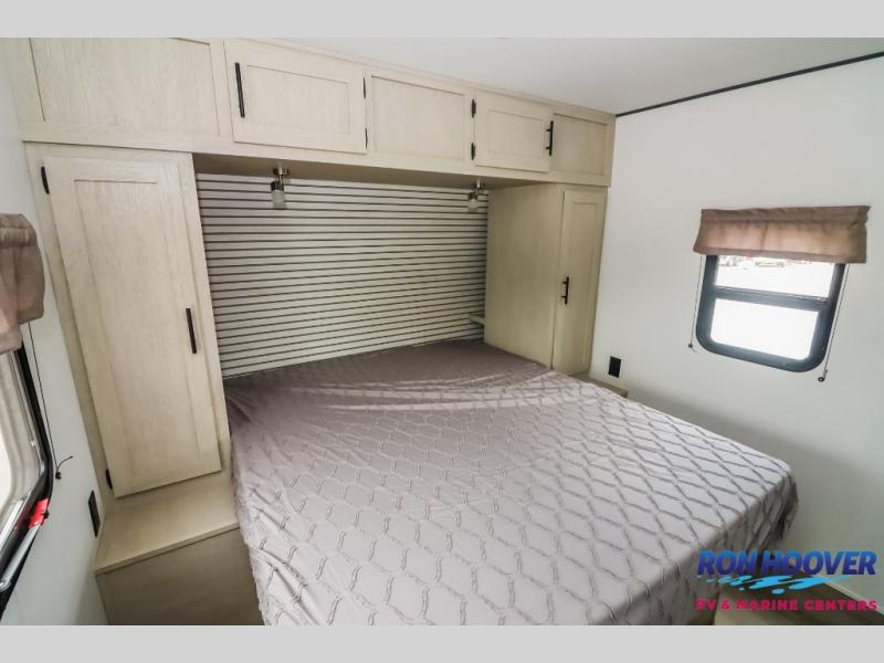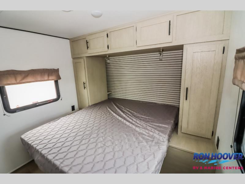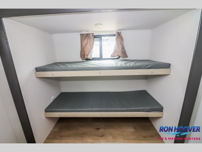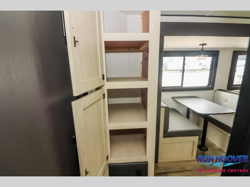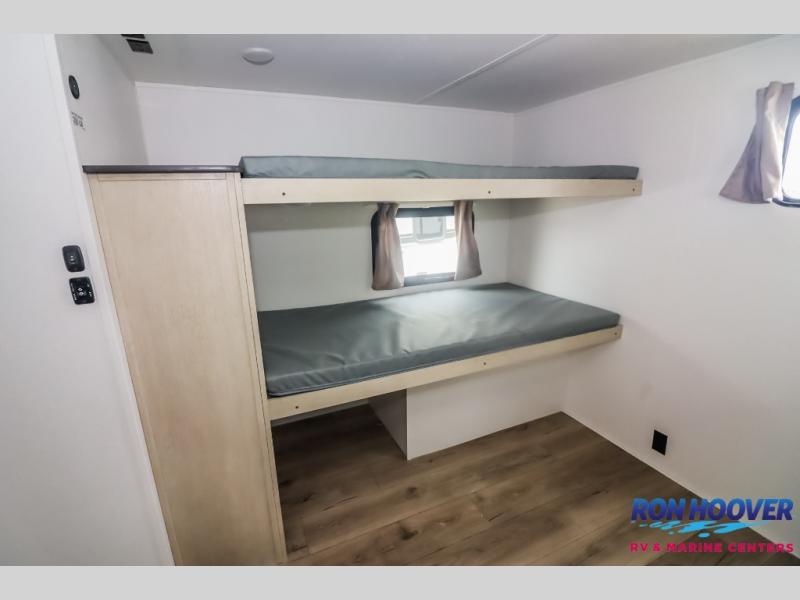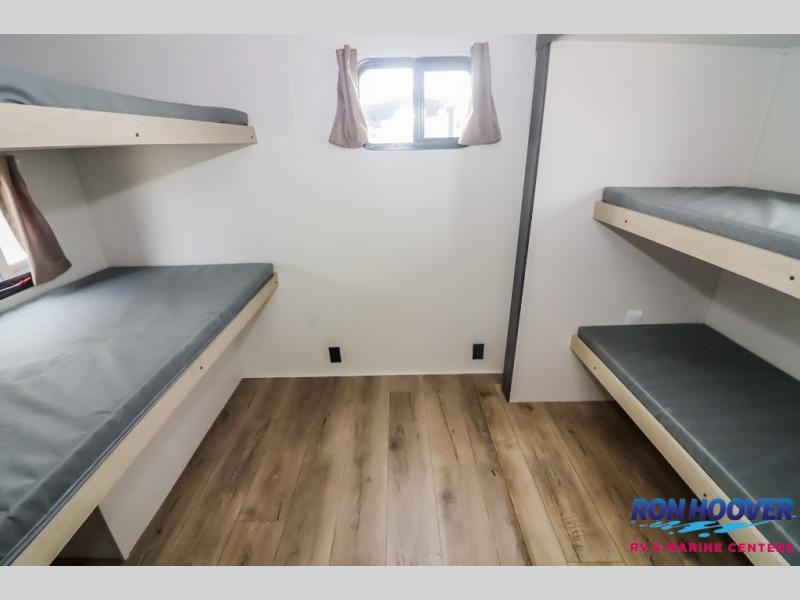 There are a set of 38" x 74" bunks and a set of 26" x 74" bunks in this trailer for lots of sleeping space! This bunkroom also includes a slide out for more space, and you can choose the optional double suite with a 54" x 74" bed if you don't need the bunks. The kitchen is fully equipped for your camping trips featuring a three burner cooktop, an overhead microwave oven, a large sink, and plenty of storage space. You will also love the pantry for all of your canned goods and snacks. The bath features a 24" x 40" shower, toilet, and vanity/sink. In the front of this unit, a private bedroom provides a quiet retreat from the rest of the unit with dual entry doors, and you'll appreciate having dual bedroom wardrobes to keep your clothes organized. Outside, enjoy pass-through storage for all of your outdoor camping gear plus more.