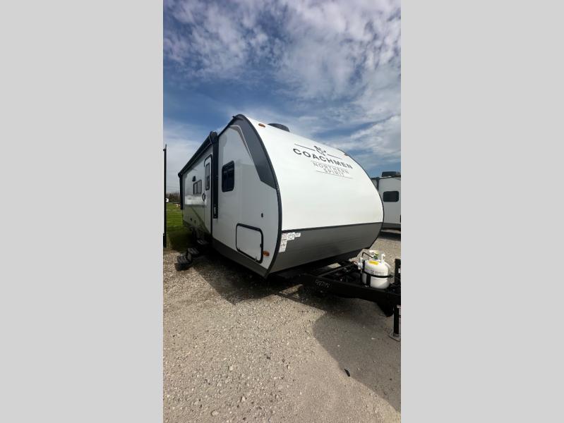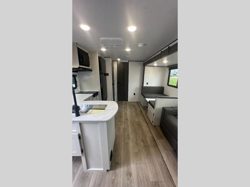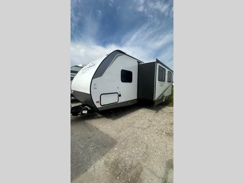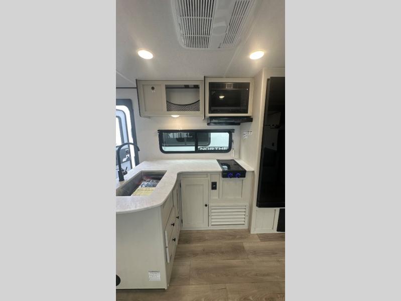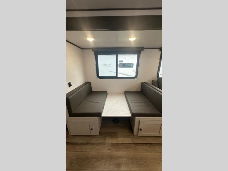 In any Northern Spirit DLX travel trailer by Coachmen, you will find quality craftsmanship along with an affordable price tag. These units each feature four stabilizer jacks to make setting up easier and an enclosed underbelly for added protection as you travel. The Base Camp Package provides each unit with black tank flush, a monitor panel for quick access to the functions of your unit, a 13.5K A/C unit, and a tankless water heater for added convenience. Inside, you'll find seamless countertops, sink covers, a portable Bluetooth speaker, and more comforts!