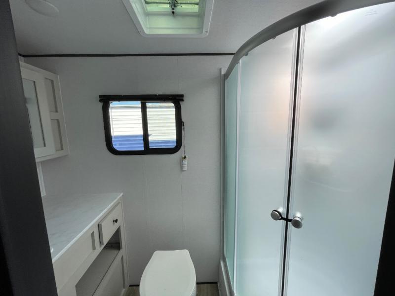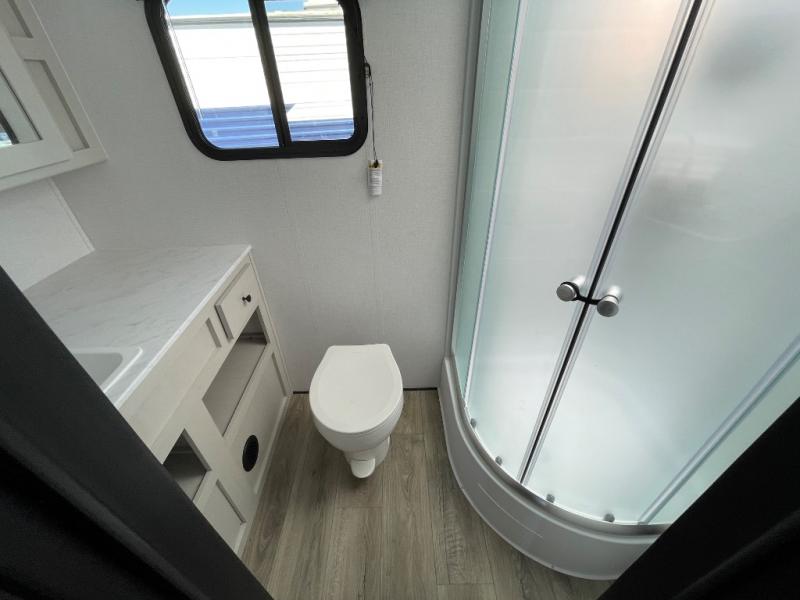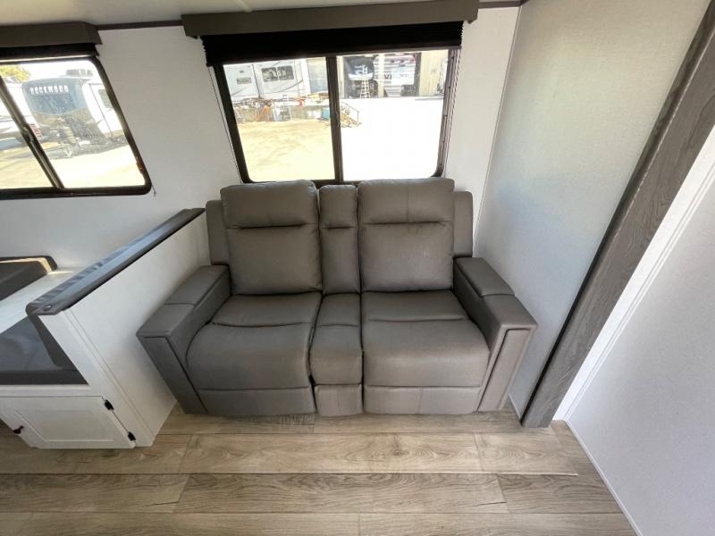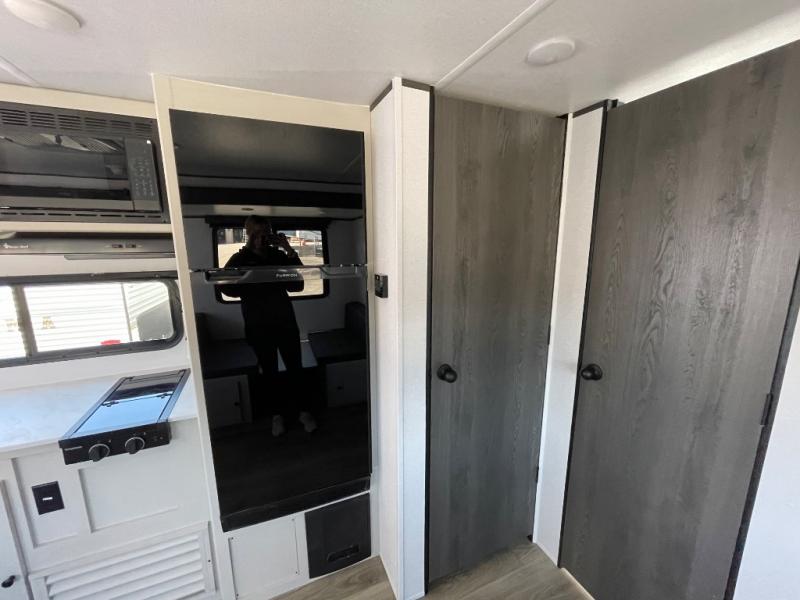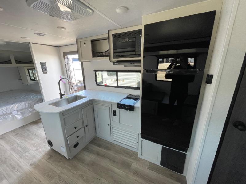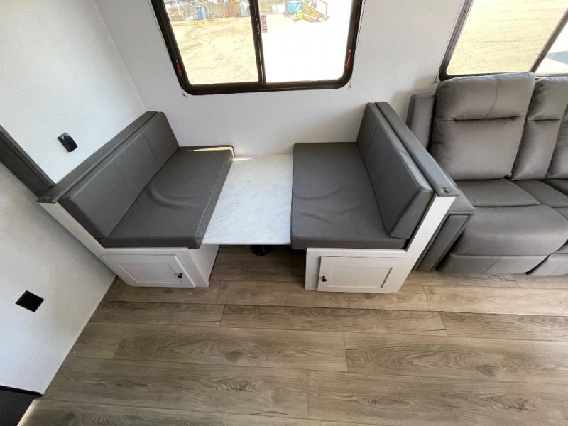 Camping trips just got a whole lot sweeter in this spacious travel trailer! You can wake up feeling refreshed each morning in the front private bedroom that includes a queen bed and underbed storage. The full rear bath will let you start your day with privacy, and the large pantry just outside that bath includes washer/dryer hookups for the option to add these appliances. An L-shaped counter in the kitchen will provide more space as you prep breakfast on the two burner cooktop, and there is a 12V refrigerator to keep the eggs and milk cold. Your crew can dine at the booth dinette, relax on the sofa, or take your plates outdoors under the 14' power awning!