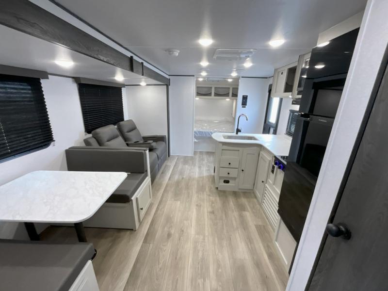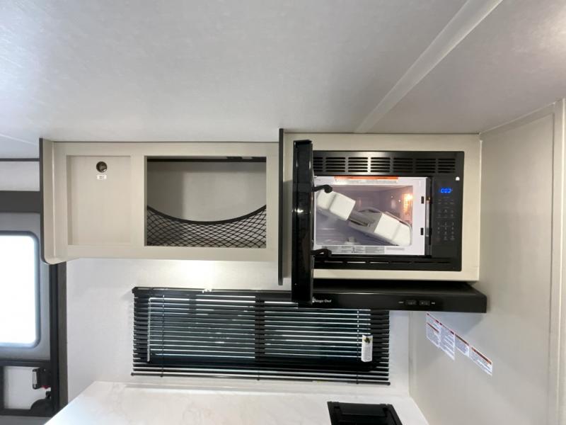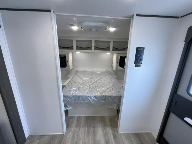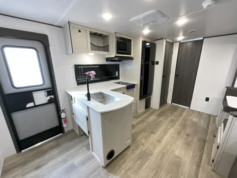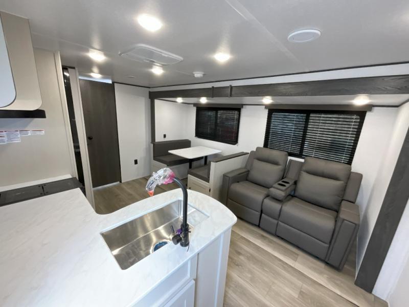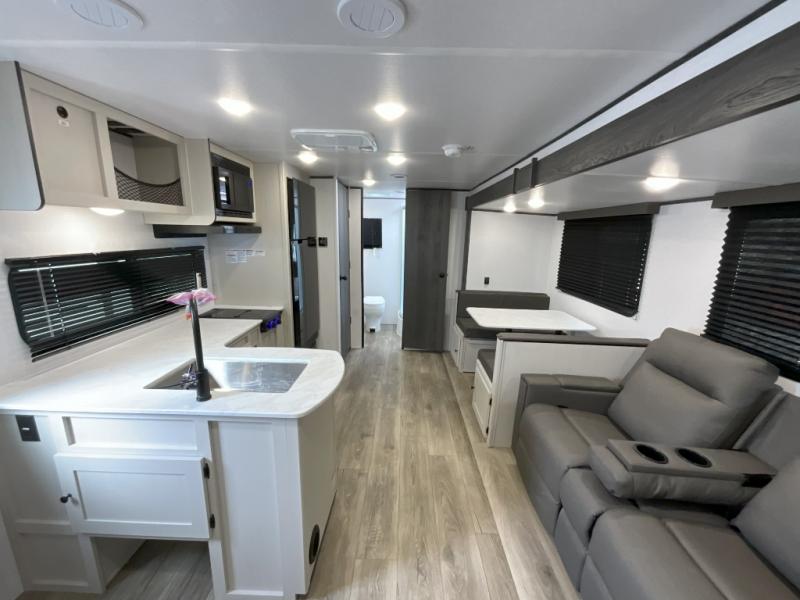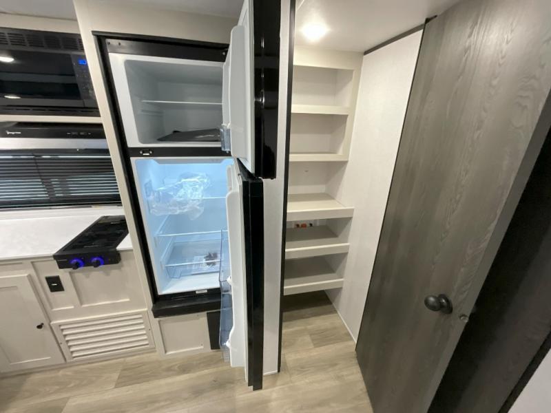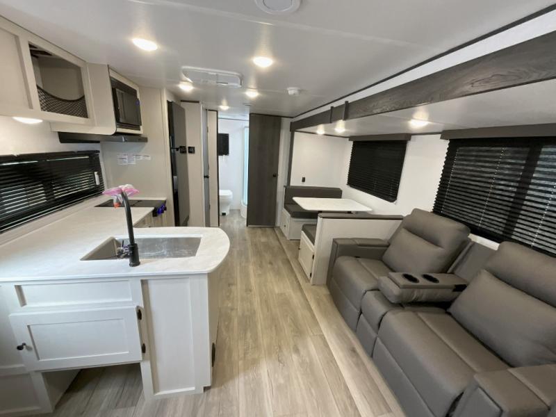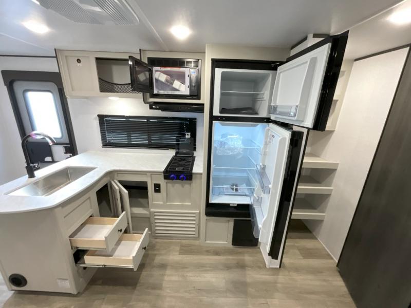 Camping trips just got a whole lot sweeter in this spacious travel trailer! You can wake up feeling refreshed each morning in the front private bedroom that includes a queen bed and underbed storage. The full rear bath will let you start your day with privacy, and the large pantry just outside that bath includes washer/dryer hookups for the option to add these appliances. An L-shaped counter in the kitchen will provide more space as you prep breakfast on the two burner cooktop, and there is a 12V refrigerator to keep the eggs and milk cold. Your crew can dine at the booth dinette, relax on the sofa, or take your plates outdoors under the 14' power awning!