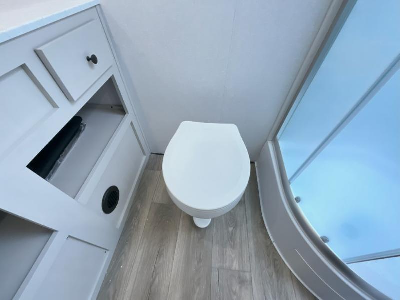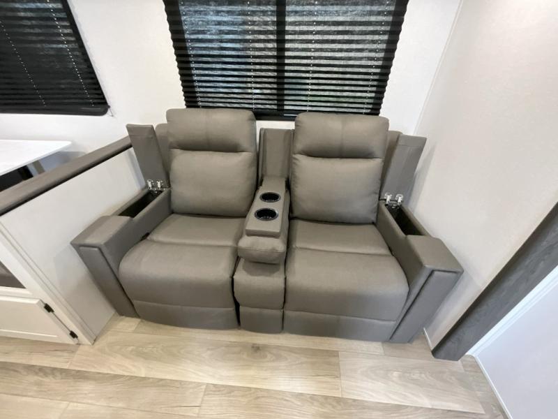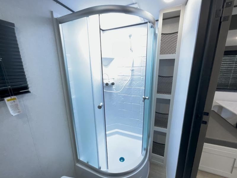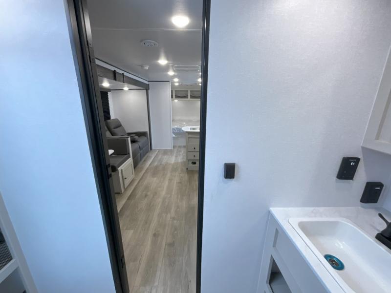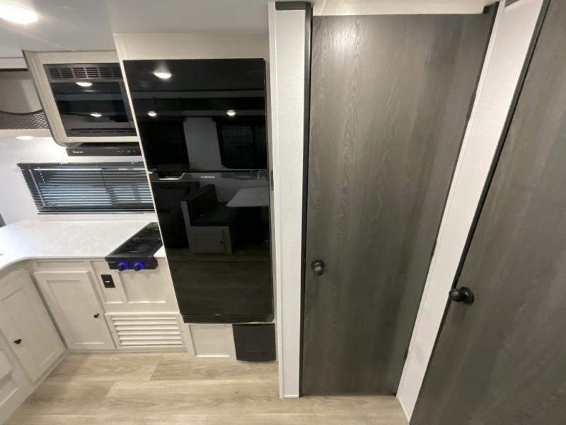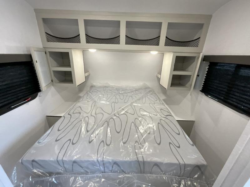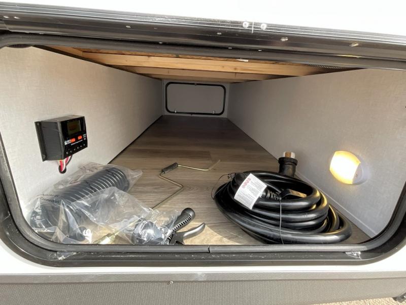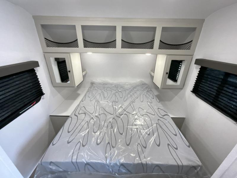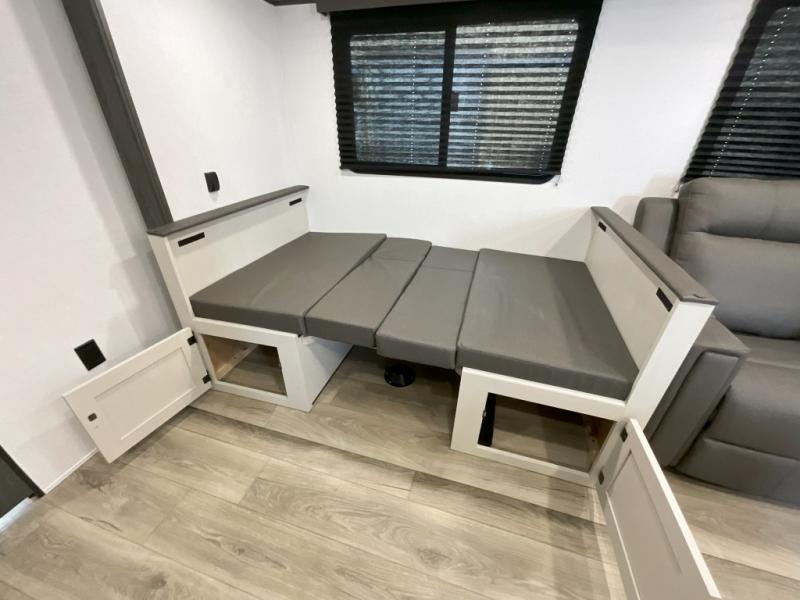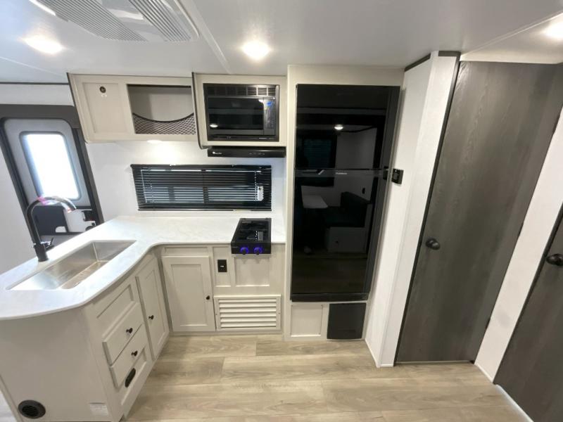 Camping trips just got a whole lot sweeter in this spacious travel trailer! You can wake up feeling refreshed each morning in the front private bedroom that includes a queen bed and underbed storage. The full rear bath will let you start your day with privacy, and the large pantry just outside that bath includes washer/dryer hookups for the option to add these appliances. An L-shaped counter in the kitchen will provide more space as you prep breakfast on the two burner cooktop, and there is a 12V refrigerator to keep the eggs and milk cold. Your crew can dine at the booth dinette, relax on the sofa, or take your plates outdoors under the 14' power awning!