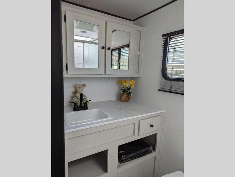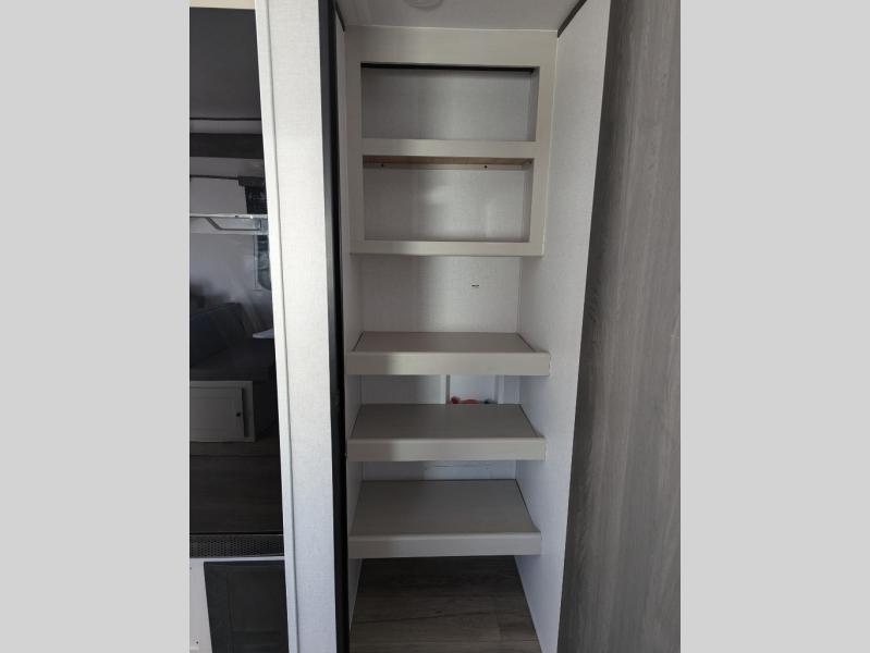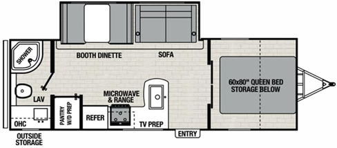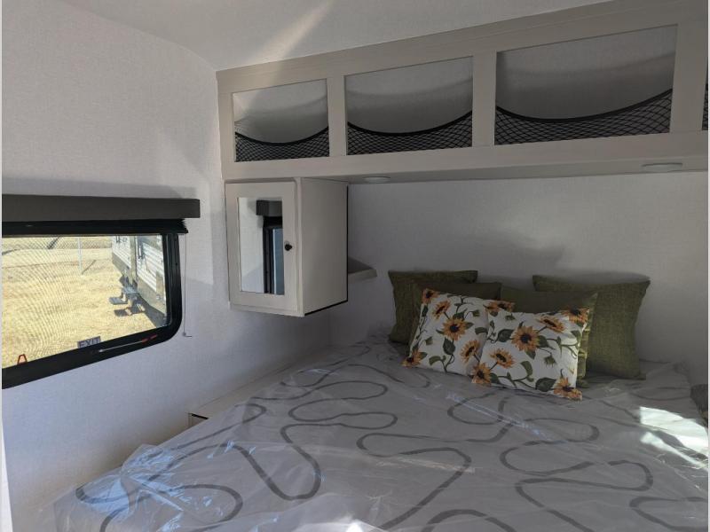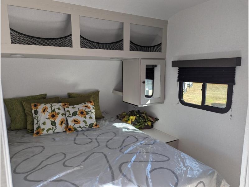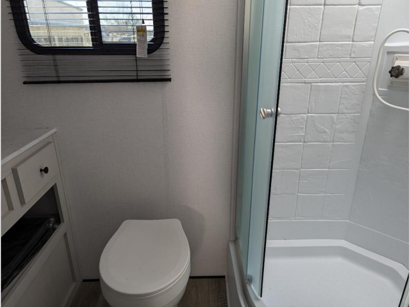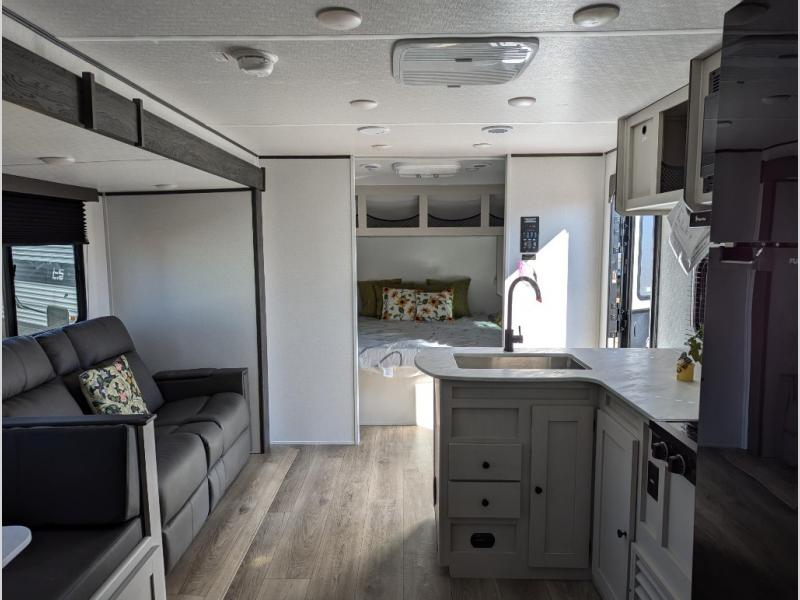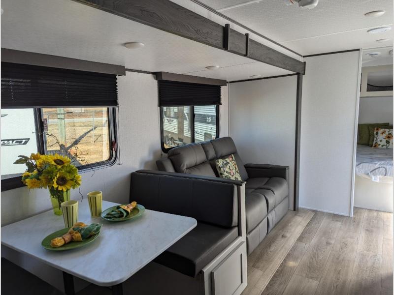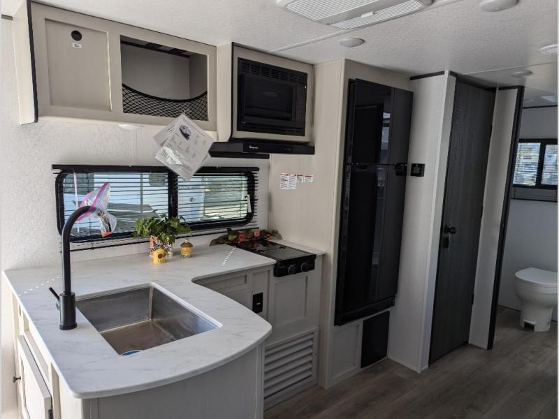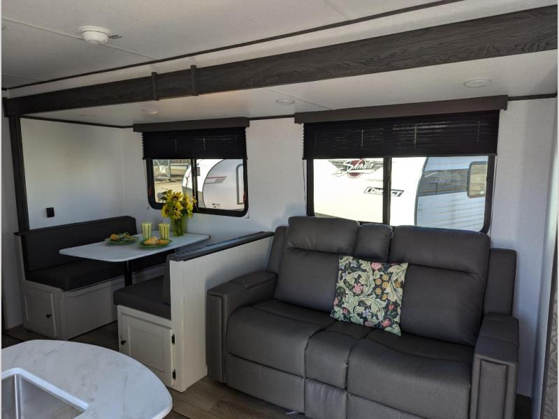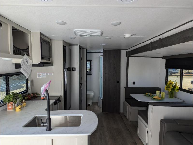 Camping trips just got a whole lot sweeter in this spacious travel trailer! You can wake up feeling refreshed each morning in the front private bedroom that includes a queen bed and underbed storage. The full rear bath will let you start your day with privacy, and the large pantry just outside that bath includes washer/dryer hookups for the option to add these appliances. An L-shaped counter in the kitchen will provide more space as you prep breakfast on the two burner cooktop, and there is a 12V refrigerator to keep the eggs and milk cold. Your crew can dine at the booth dinette, relax on the sofa, or take your plates outdoors under the 14' power awning!