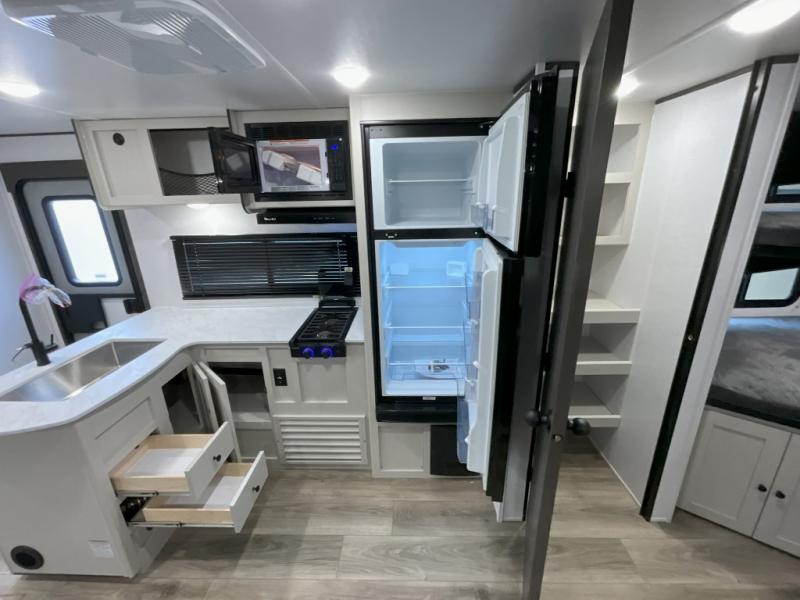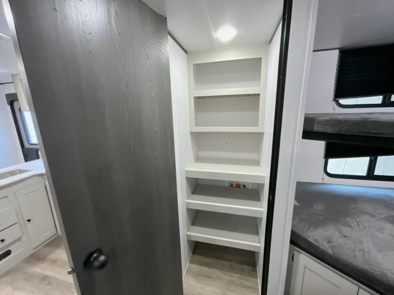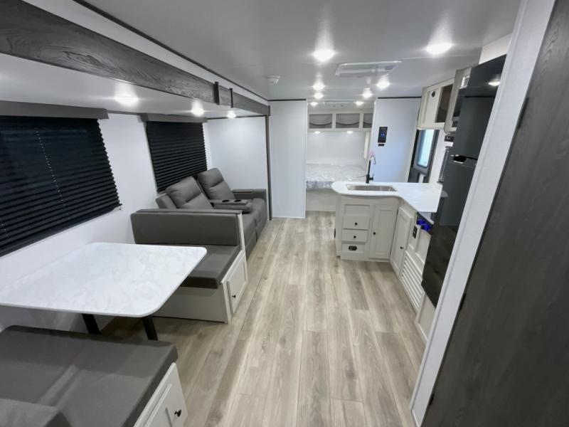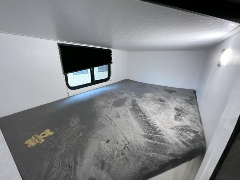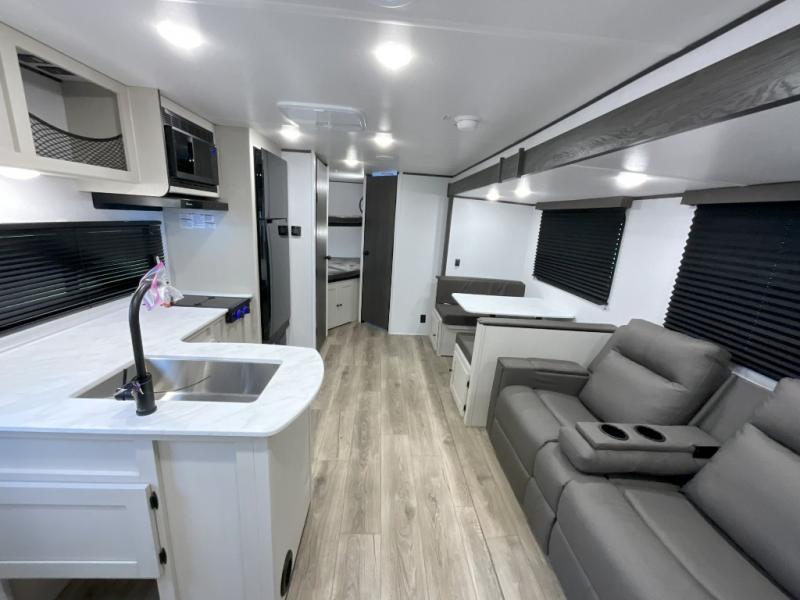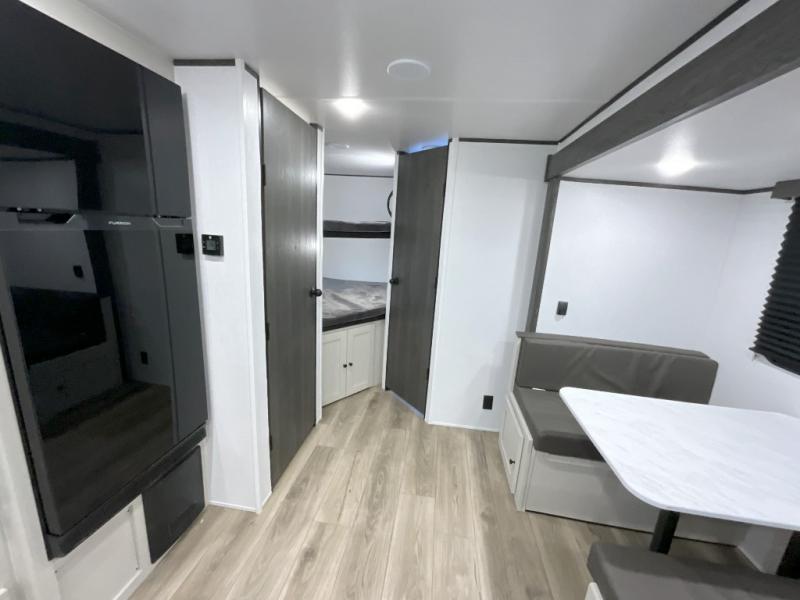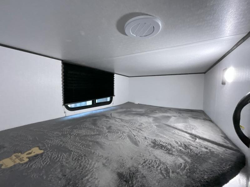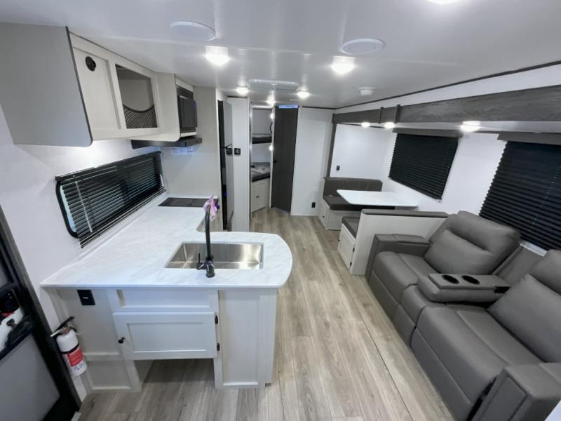 Camping trips are made complete in this spacious travel trailer! You can wake up feeling refreshed each morning in the front private bedroom that includes a queen bed and underbed storage, and there is a full bath towards the back to get ready for your day. The double-size bunks are sure to be a hit with the little ones or your guests, and the large pantry beside the bunks include washer/dryer hookups if you want to add these appliances. An L-shaped counter in the kitchen will provide more space as you prep breakfast on the two burner cooktop, and there is a 12V refrigerator to keep the eggs and milk cold. Your crew can dine at the booth dinette, relax on the sofa, or take your plates outdoors under the 20' power awning!