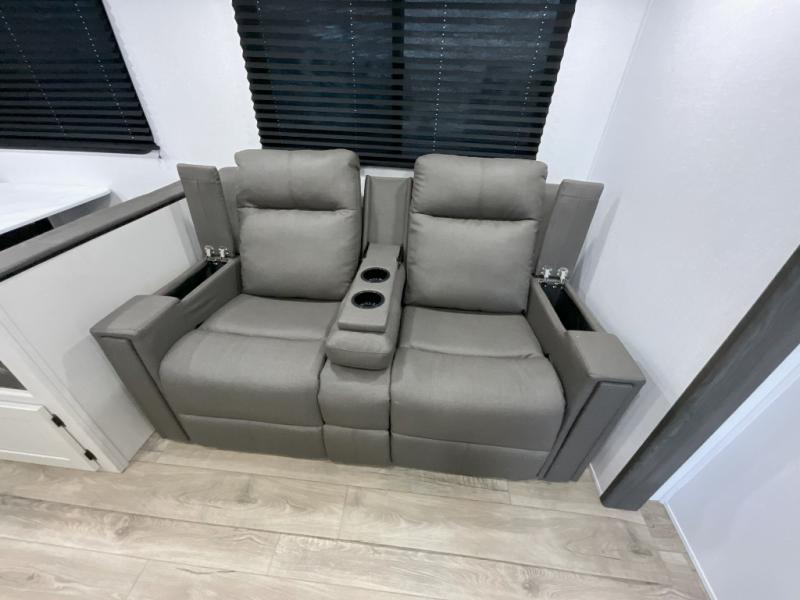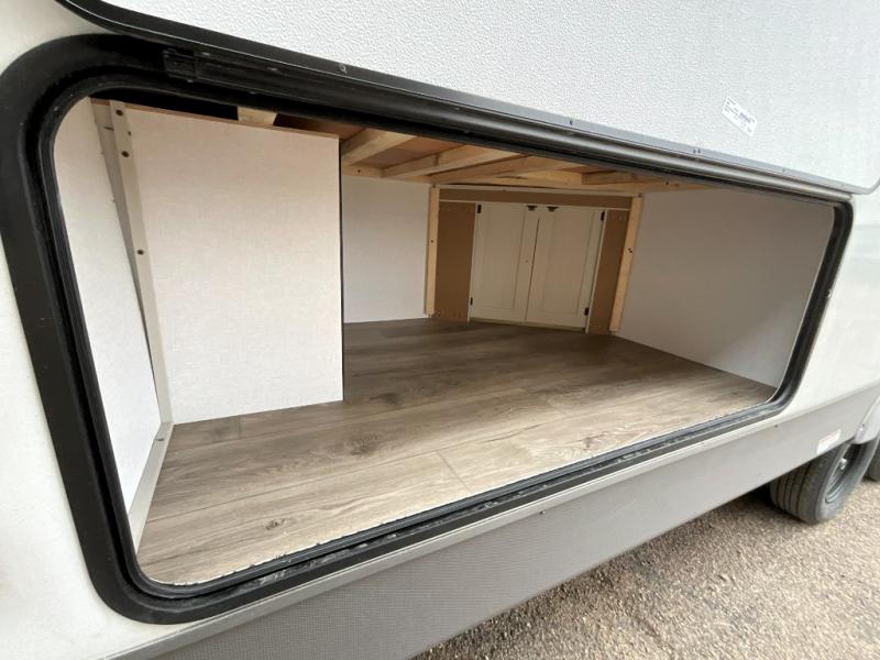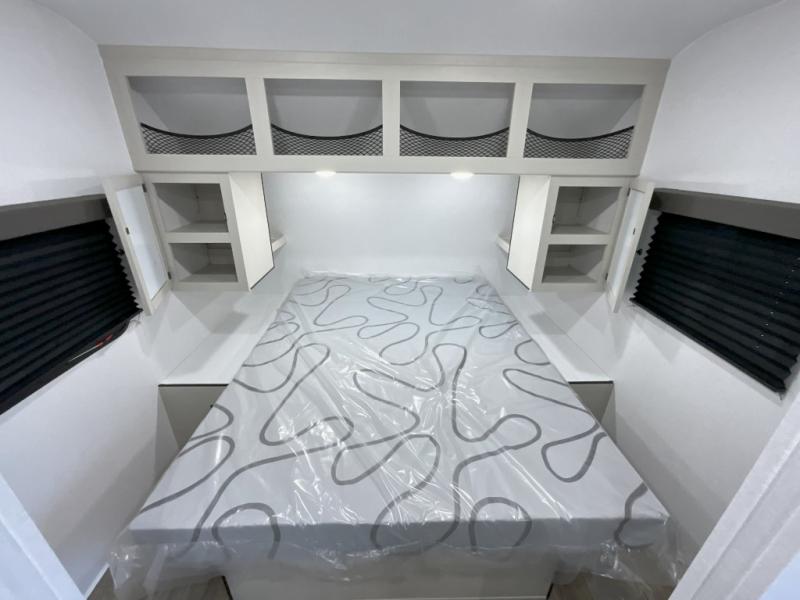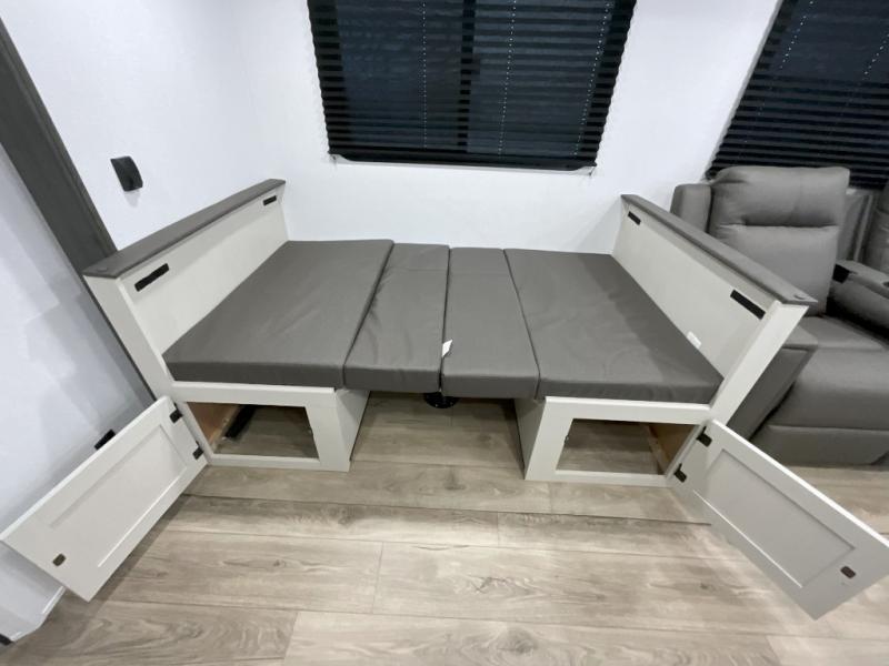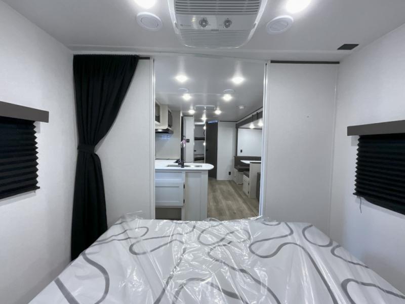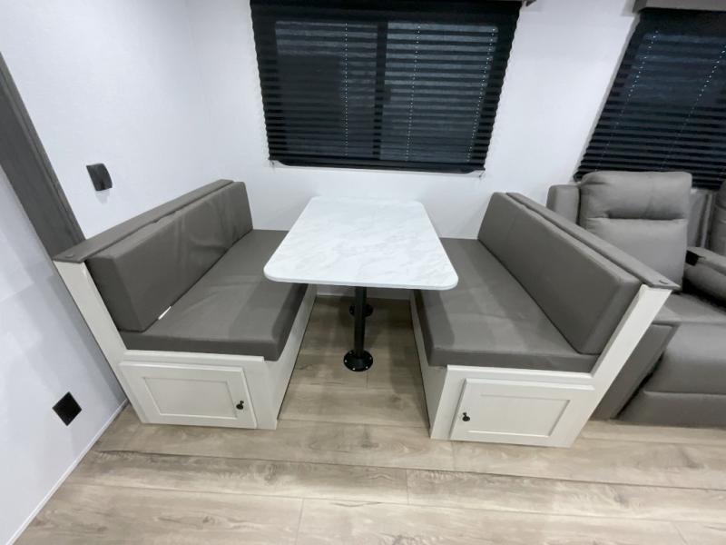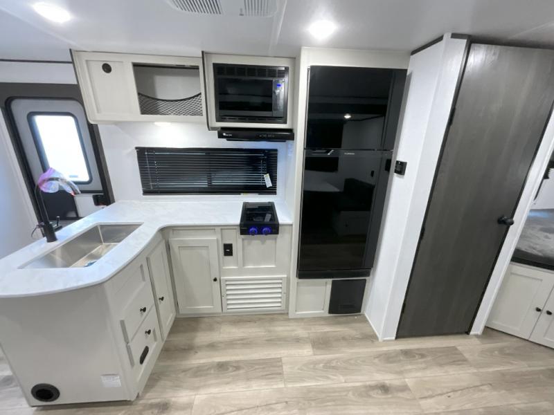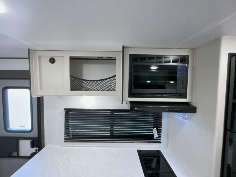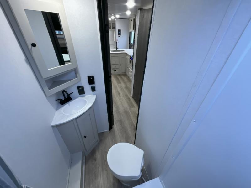 Camping trips are made complete in this spacious travel trailer! You can wake up feeling refreshed each morning in the front private bedroom that includes a queen bed and underbed storage, and there is a full bath towards the back to get ready for your day. The double-size bunks are sure to be a hit with the little ones or your guests, and the large pantry beside the bunks include washer/dryer hookups if you want to add these appliances. An L-shaped counter in the kitchen will provide more space as you prep breakfast on the two burner cooktop, and there is a 12V refrigerator to keep the eggs and milk cold. Your crew can dine at the booth dinette, relax on the sofa, or take your plates outdoors under the 20' power awning!
