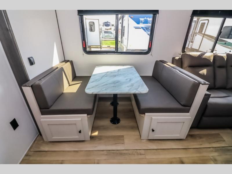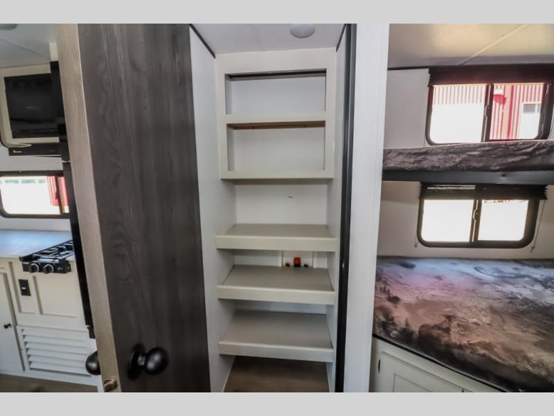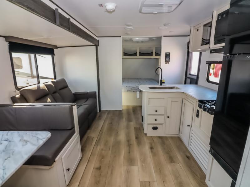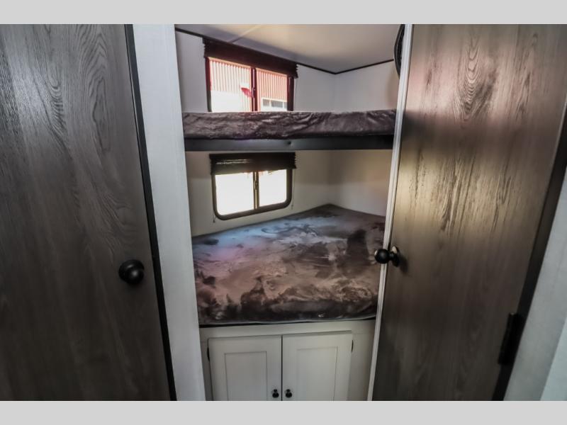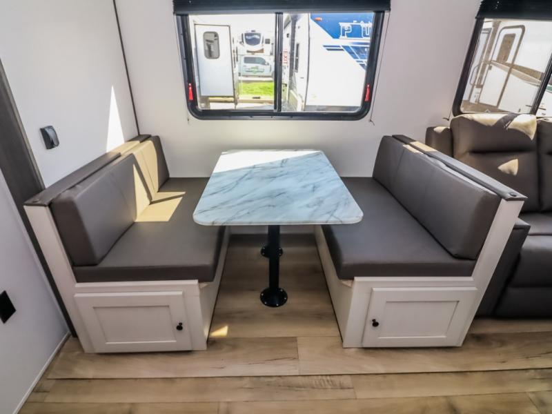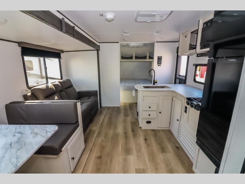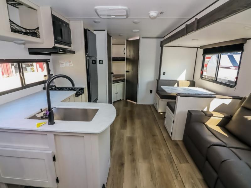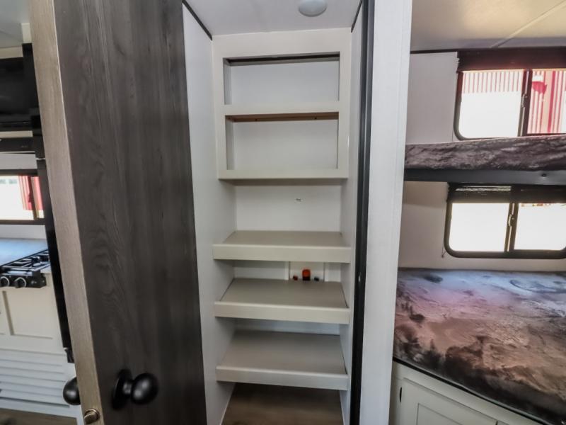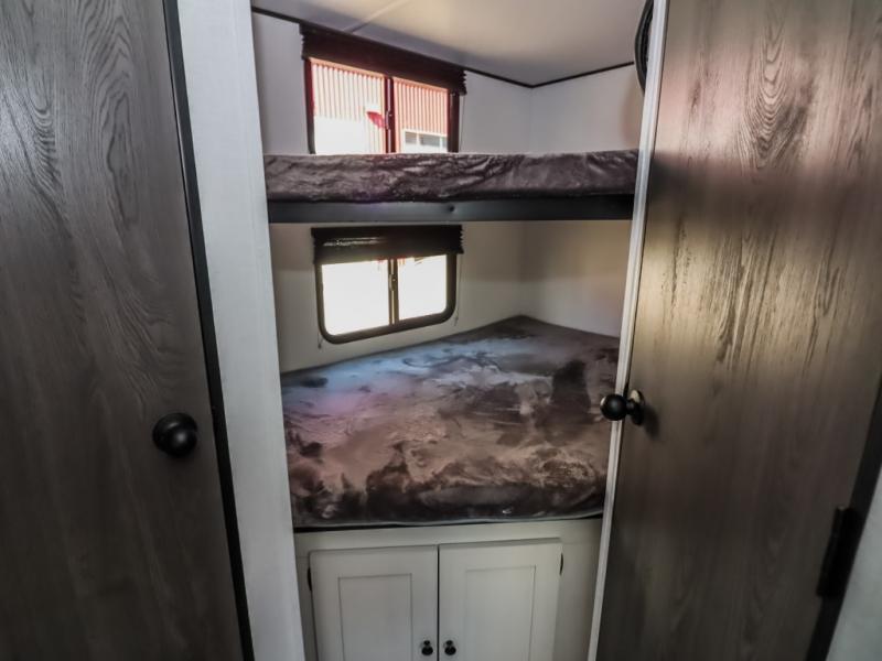 Camping trips are made complete in this spacious travel trailer! You can wake up feeling refreshed each morning in the front private bedroom that includes a queen bed and underbed storage, and there is a full bath towards the back to get ready for your day. The double-size bunks are sure to be a hit with the little ones or your guests, and the large pantry beside the bunks include washer/dryer hookups if you want to add these appliances. An L-shaped counter in the kitchen will provide more space as you prep breakfast on the two burner cooktop, and there is a 12V refrigerator to keep the eggs and milk cold. Your crew can dine at the booth dinette, relax on the sofa, or take your plates outdoors under the 20' power awning!
