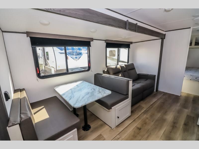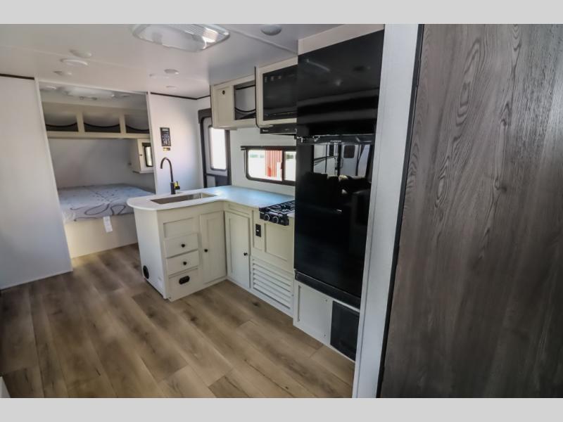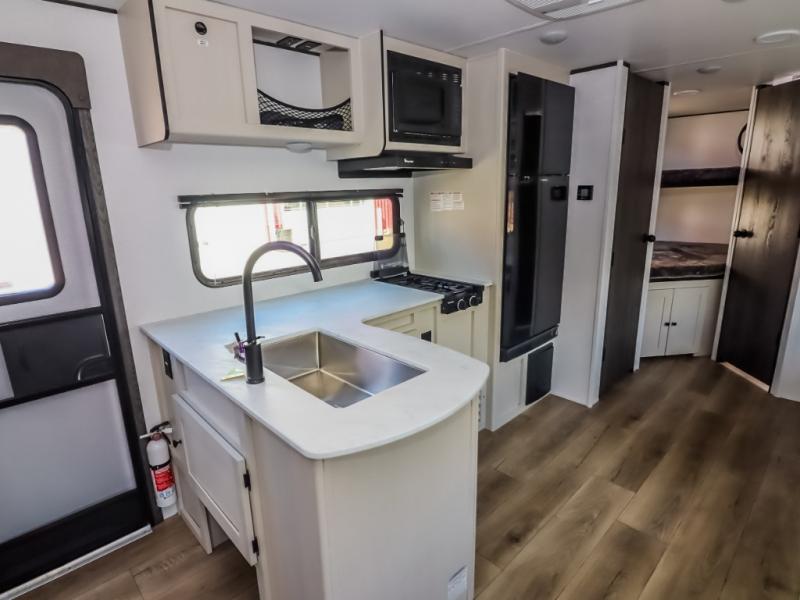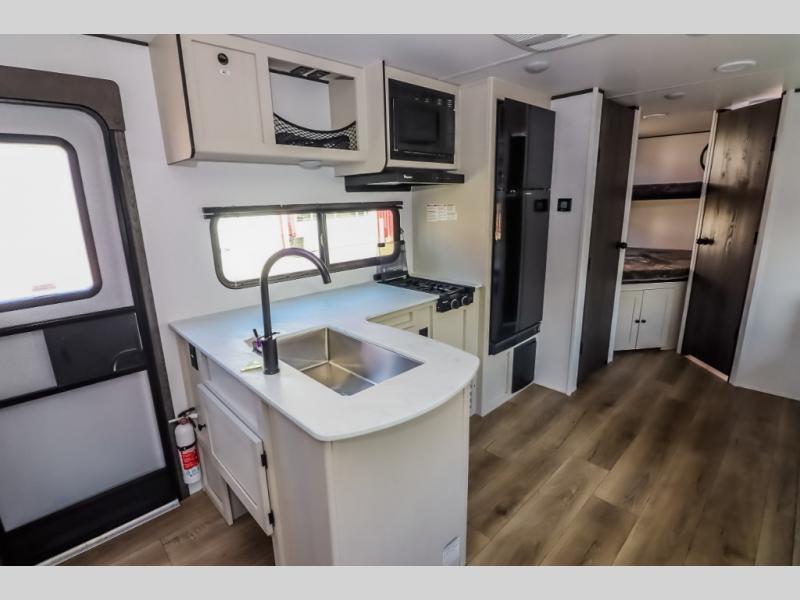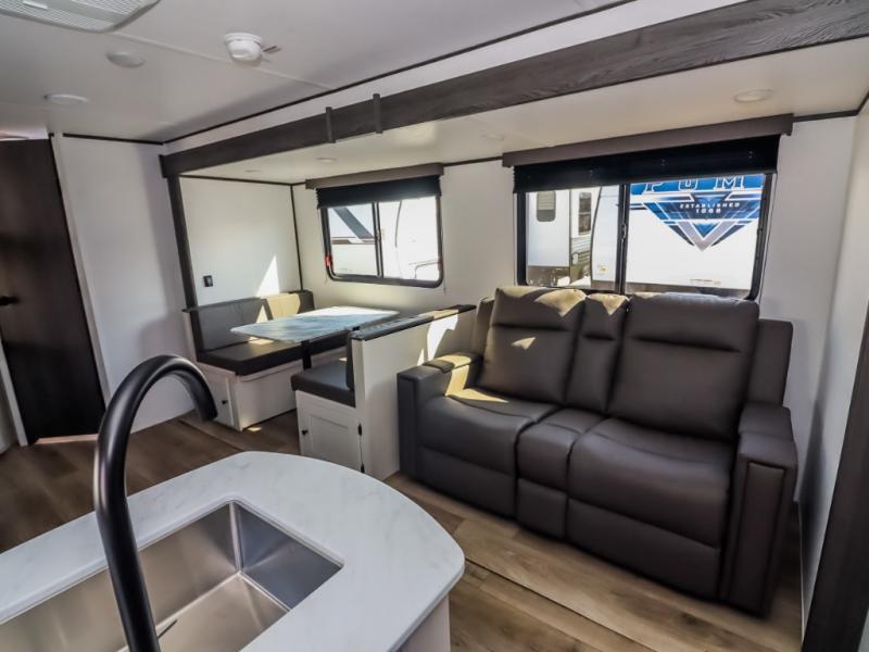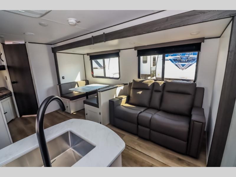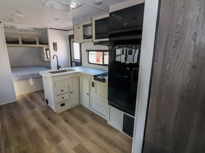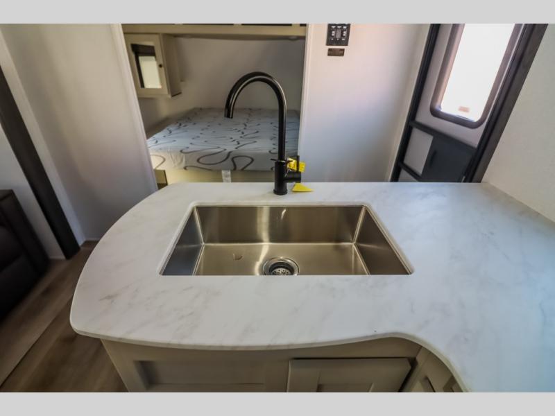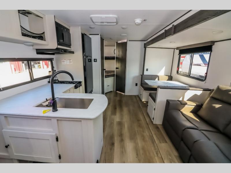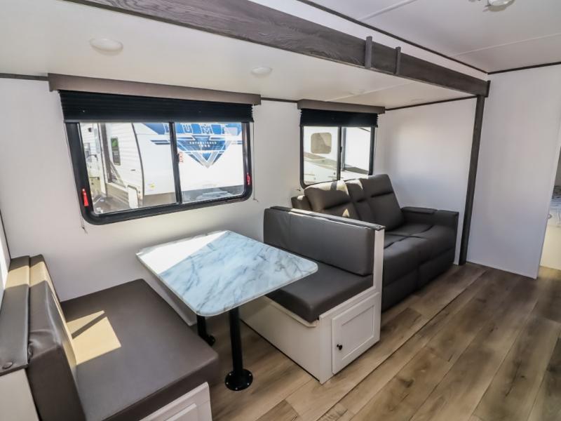 Camping trips are made complete in this spacious travel trailer! You can wake up feeling refreshed each morning in the front private bedroom that includes a queen bed and underbed storage, and there is a full bath towards the back to get ready for your day. The double-size bunks are sure to be a hit with the little ones or your guests, and the large pantry beside the bunks include washer/dryer hookups if you want to add these appliances. An L-shaped counter in the kitchen will provide more space as you prep breakfast on the two burner cooktop, and there is a 12V refrigerator to keep the eggs and milk cold. Your crew can dine at the booth dinette, relax on the sofa, or take your plates outdoors under the 20' power awning!
