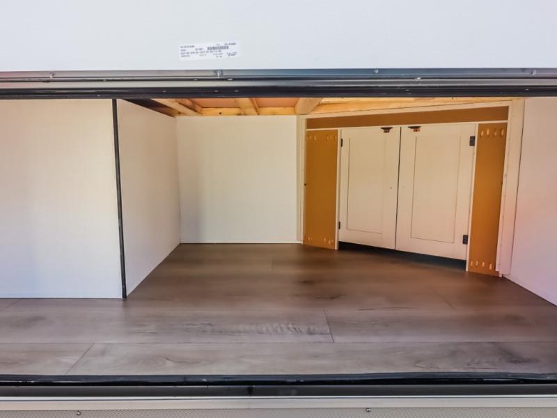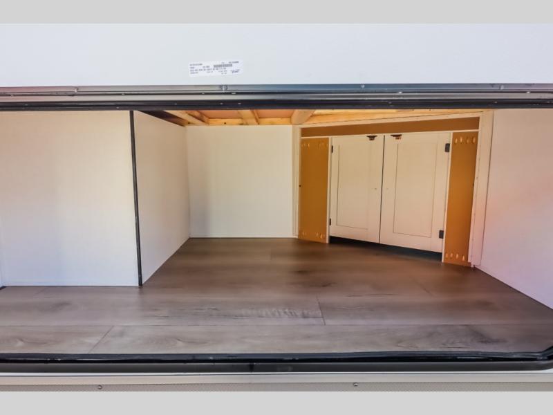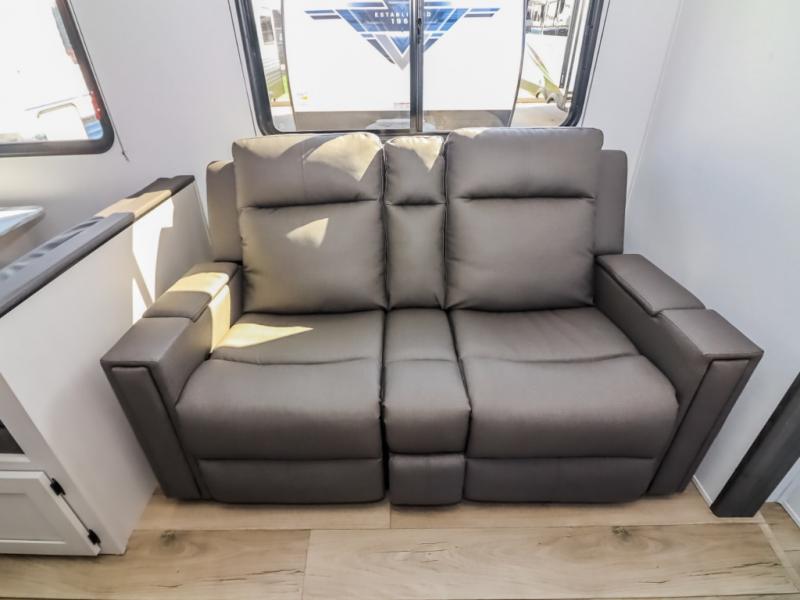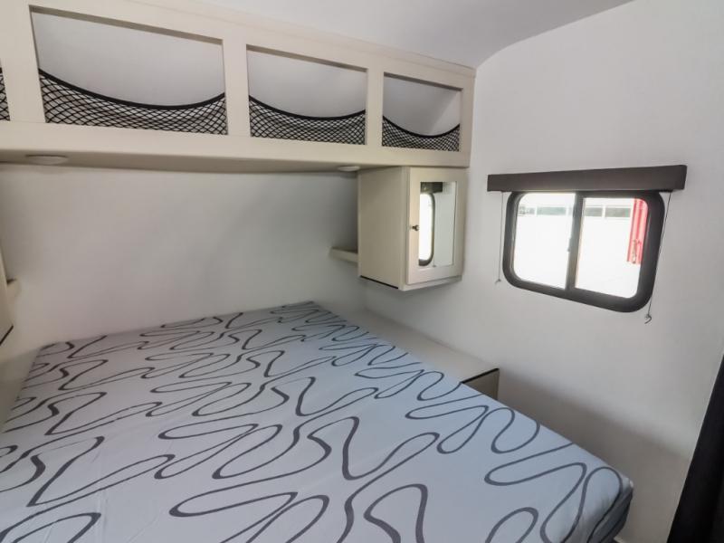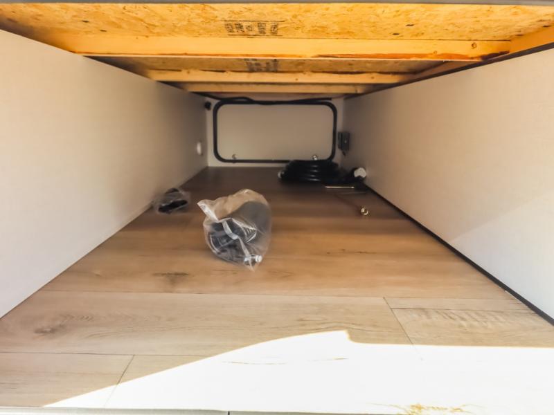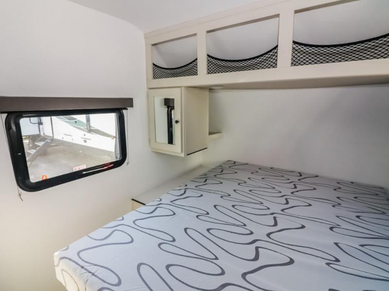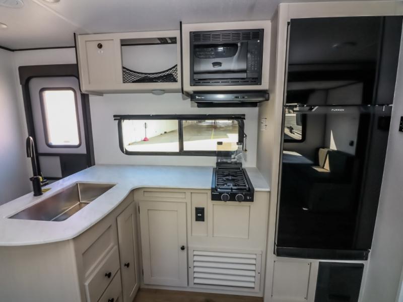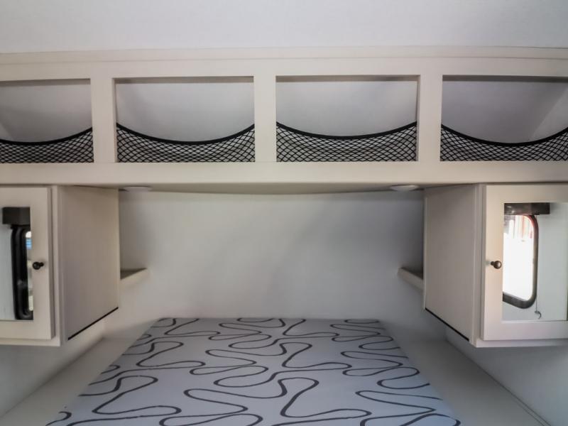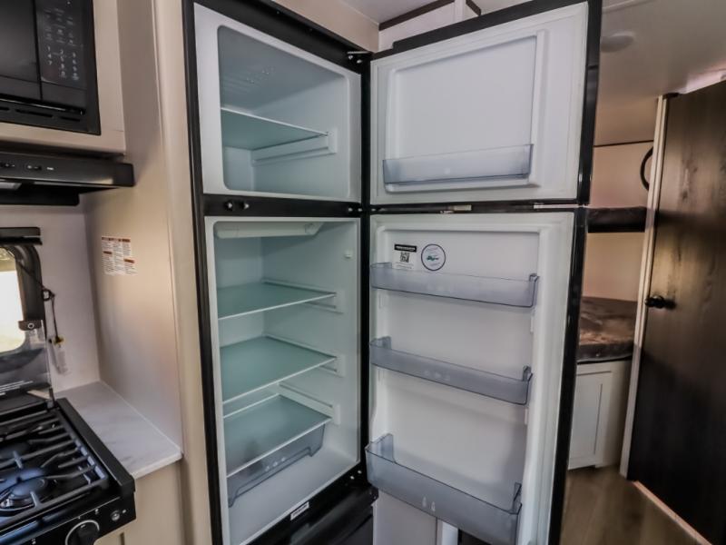 Camping trips are made complete in this spacious travel trailer! You can wake up feeling refreshed each morning in the front private bedroom that includes a queen bed and underbed storage, and there is a full bath towards the back to get ready for your day. The double-size bunks are sure to be a hit with the little ones or your guests, and the large pantry beside the bunks include washer/dryer hookups if you want to add these appliances. An L-shaped counter in the kitchen will provide more space as you prep breakfast on the two burner cooktop, and there is a 12V refrigerator to keep the eggs and milk cold. Your crew can dine at the booth dinette, relax on the sofa, or take your plates outdoors under the 20' power awning!