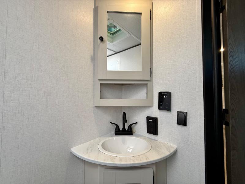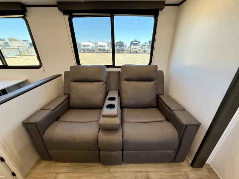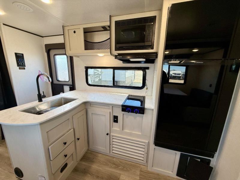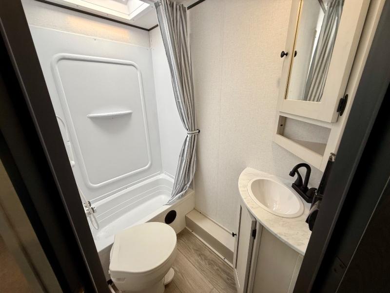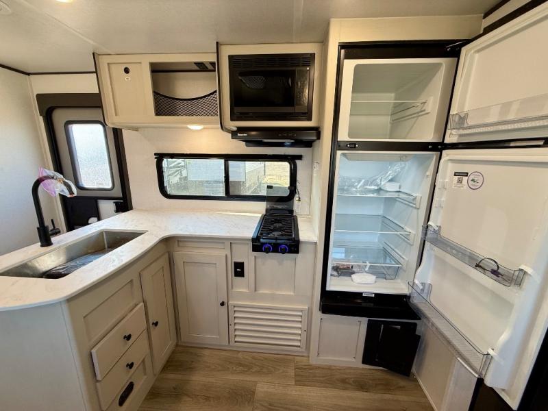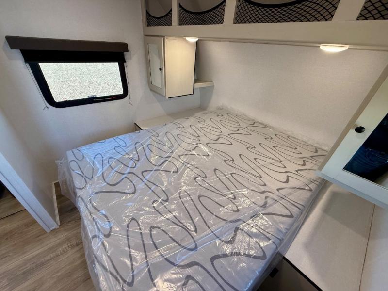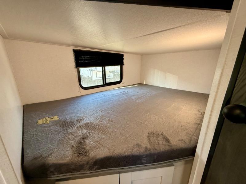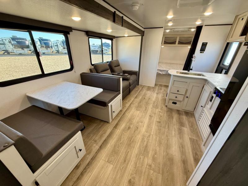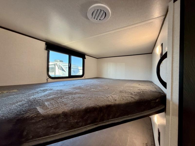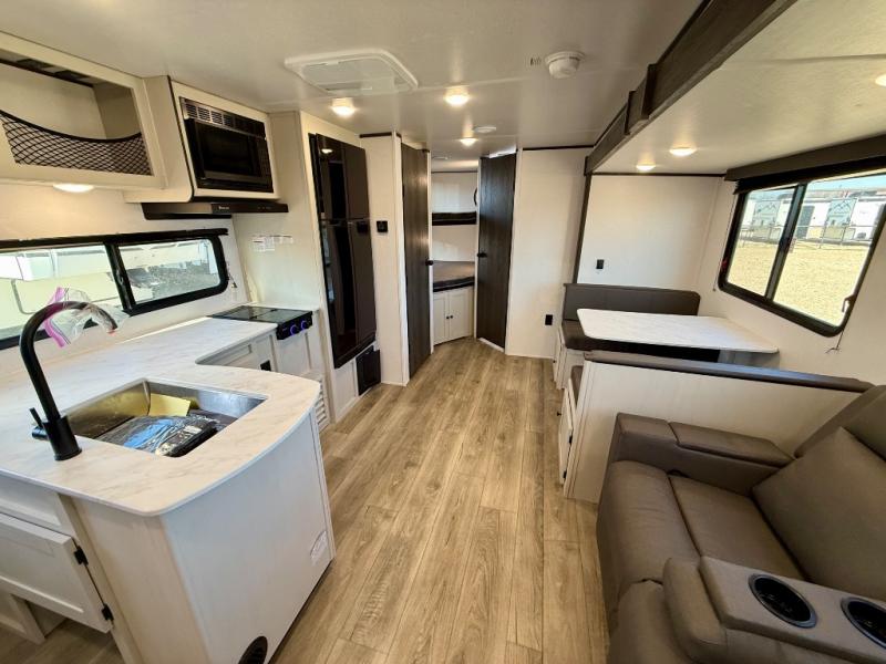 Camping trips are made complete in this spacious travel trailer! You can wake up feeling refreshed each morning in the front private bedroom that includes a queen bed and underbed storage, and there is a full bath towards the back to get ready for your day. The double-size bunks are sure to be a hit with the little ones or your guests, and the large pantry beside the bunks include washer/dryer hookups if you want to add these appliances. An L-shaped counter in the kitchen will provide more space as you prep breakfast on the two burner cooktop, and there is a 12V refrigerator to keep the eggs and milk cold. Your crew can dine at the booth dinette, relax on the sofa, or take your plates outdoors under the 20' power awning!