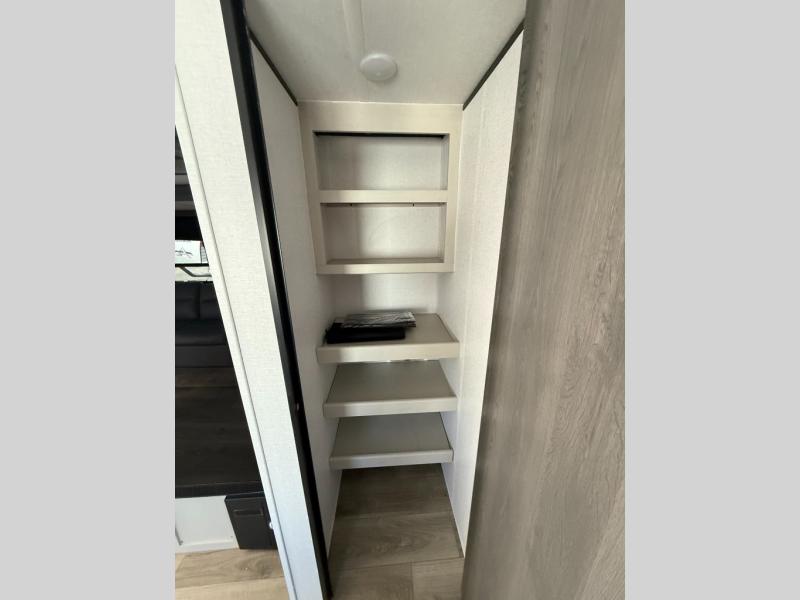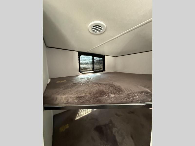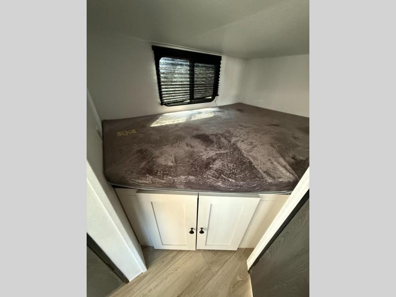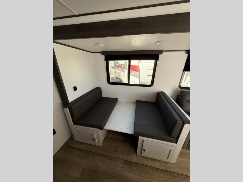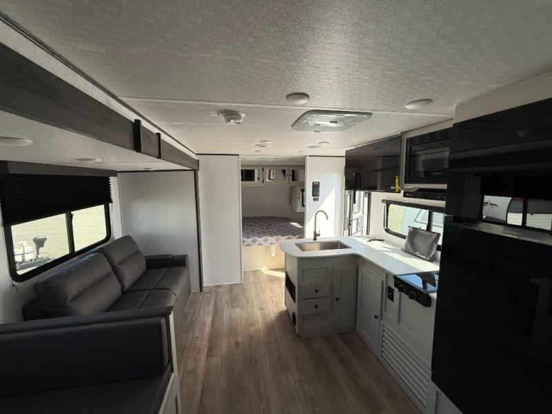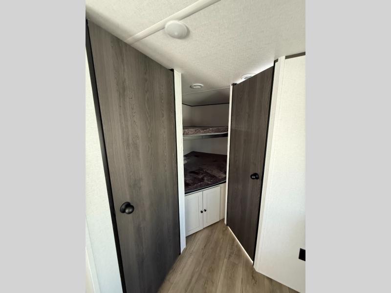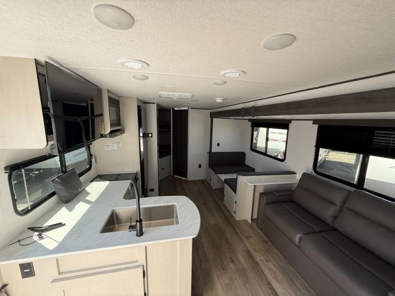 Camping trips are made complete in this spacious travel trailer! You can wake up feeling refreshed each morning in the front private bedroom that includes a queen bed and underbed storage, and there is a full bath towards the back to get ready for your day. The double-size bunks are sure to be a hit with the little ones or your guests, and the large pantry beside the bunks include washer/dryer hookups if you want to add these appliances. An L-shaped counter in the kitchen will provide more space as you prep breakfast on the two burner cooktop, and there is a 12V refrigerator to keep the eggs and milk cold. Your crew can dine at the booth dinette, relax on the sofa, or take your plates outdoors under the 20' power awning!