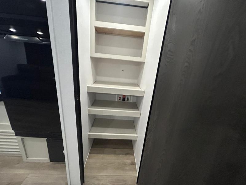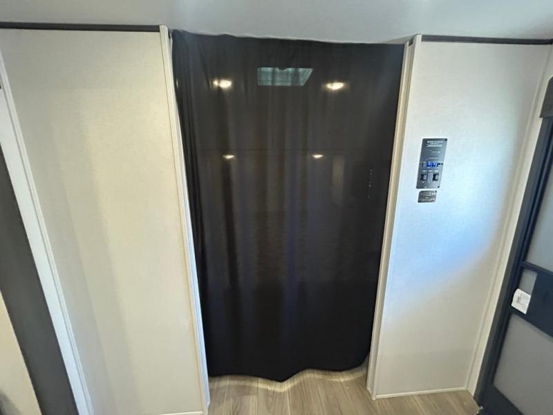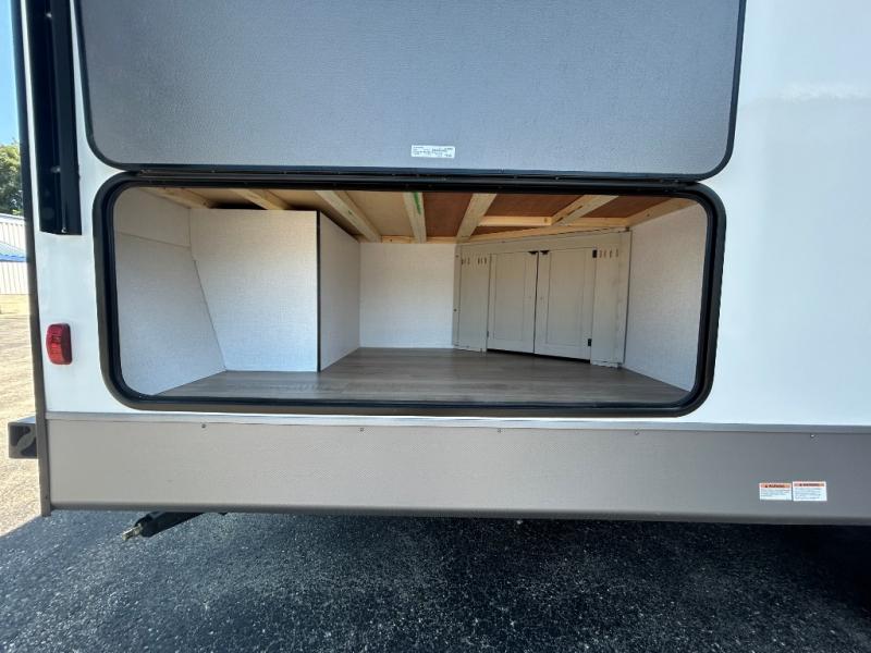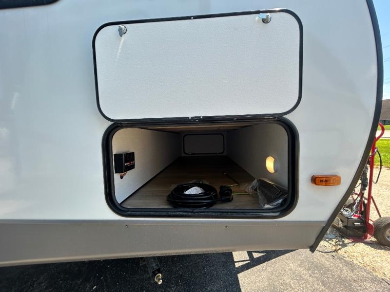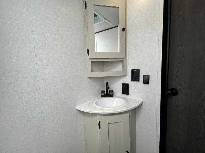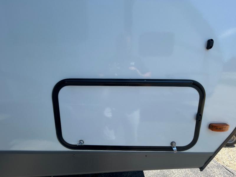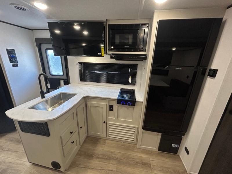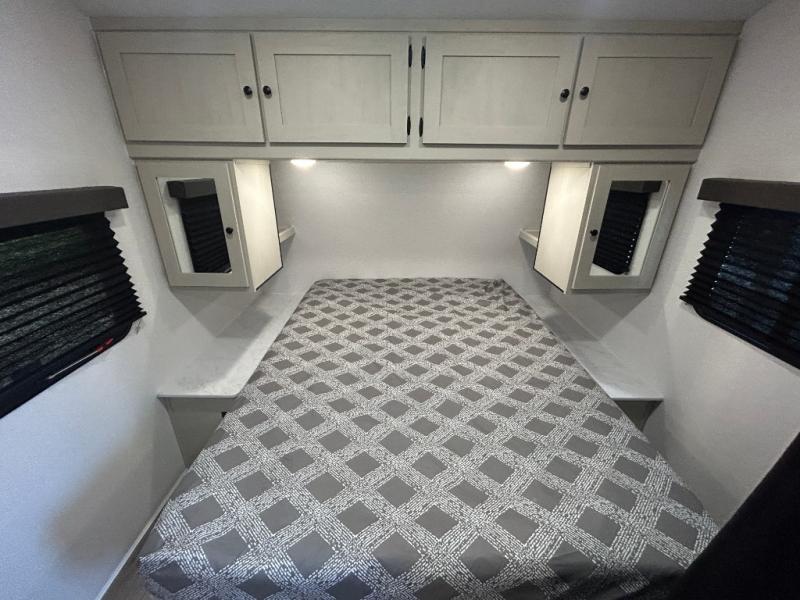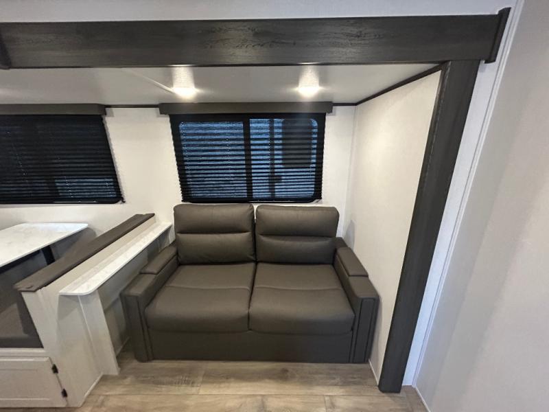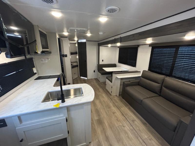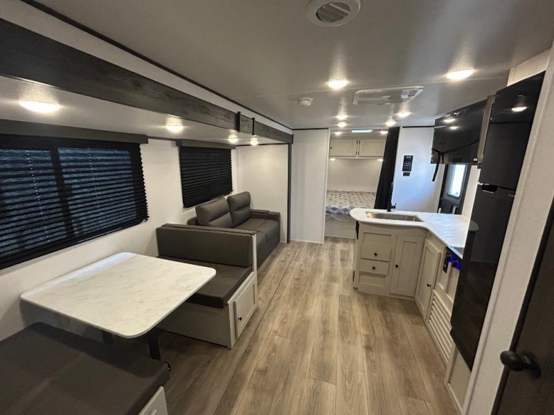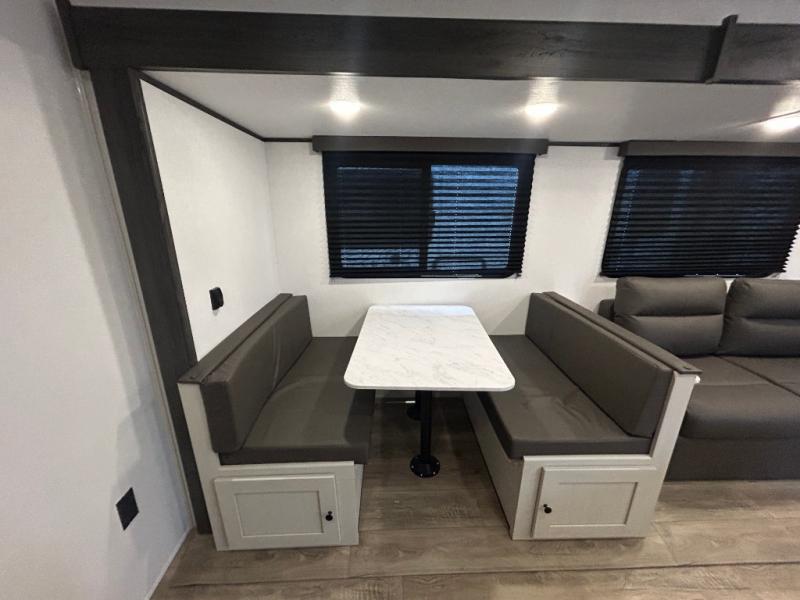 Camping trips are made complete in this spacious travel trailer! You can wake up feeling refreshed each morning in the front private bedroom that includes a queen bed and underbed storage, and there is a full bath towards the back to get ready for your day. The double-size bunks are sure to be a hit with the little ones or your guests, and the large pantry beside the bunks include washer/dryer hookups if you want to add these appliances. An L-shaped counter in the kitchen will provide more space as you prep breakfast on the two burner cooktop, and there is a 12V refrigerator to keep the eggs and milk cold. Your crew can dine at the booth dinette, relax on the sofa with a theater seating option, or take your plates outdoors under the 20' power awning!
