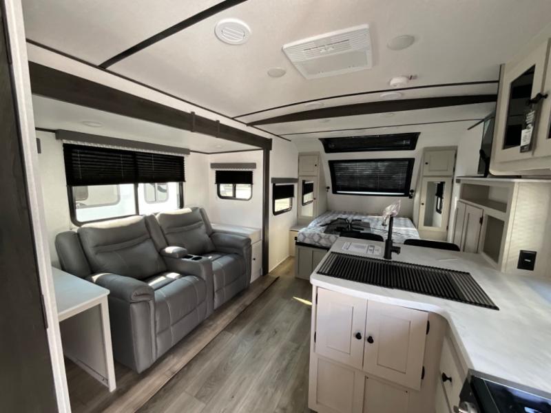 Sleep like royalty at any campsite when you have this trailer setup. You will find the interior is spacious with a slide out sofa including end tables for your drinks and cellphones, and the rear corner bathroom is convenient with a radius shower and linen storage. Your dog can stay clean as well with the exterior dog wash and the dog leash clip will keep them safely at the campsite. While outside you might decide to relax under the 15' awning, and store a few items in the pass-through compartment up front including fishing poles. And the cook will love the L-shaped counter, appliances, the hutch and the bar stools when wanting to take a break or visit with friends.