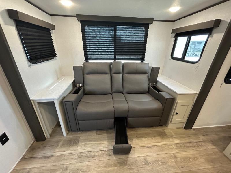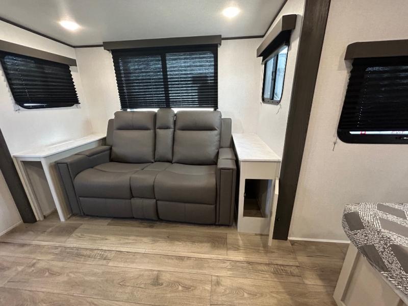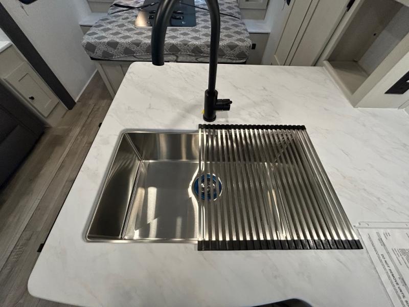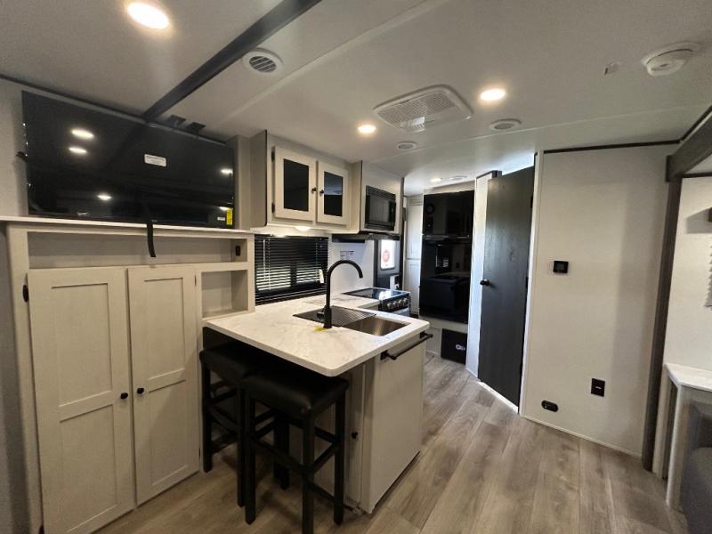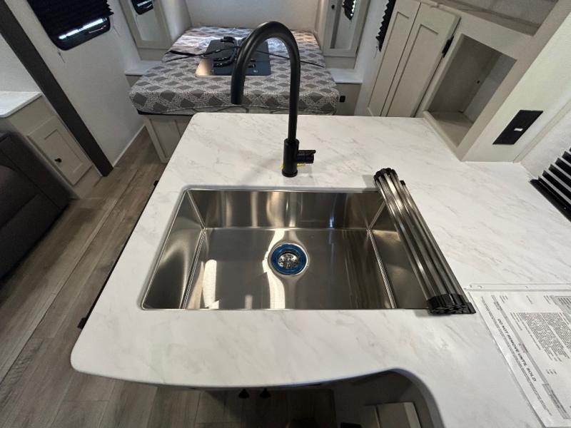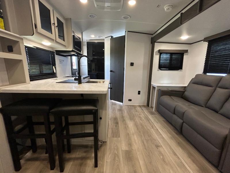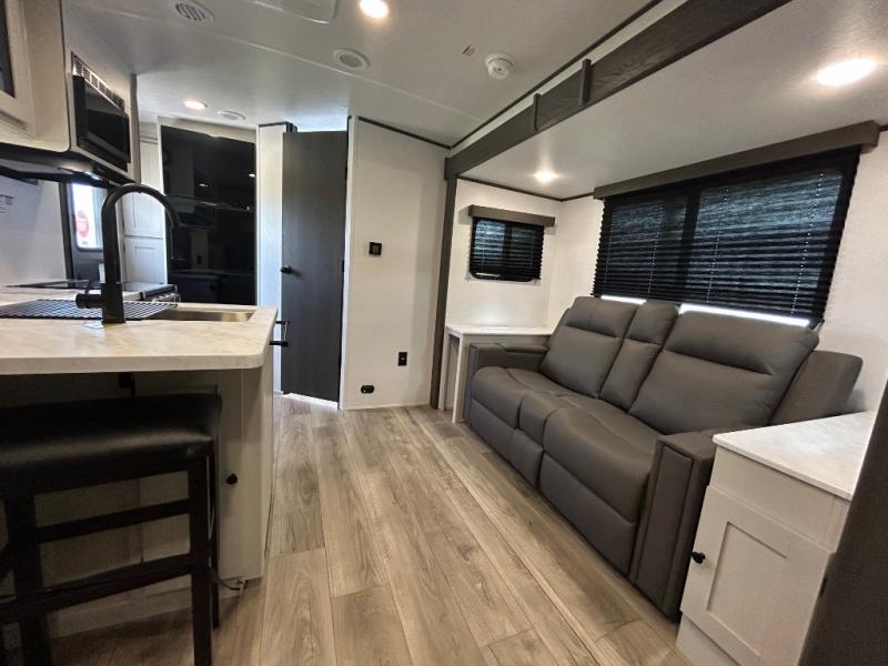 Sleep like royalty at any campsite when you have this trailer setup. You will find the interior is spacious with a slide out sofa including end tables for your drinks and cellphones, and the rear corner bathroom is convenient with a radius shower and linen storage. Your dog can stay clean as well with the exterior dog wash and the dog leash clip will keep them safely at the campsite. While outside you might decide to relax under the 15' awning, and store a few items in the pass-through compartment up front including fishing poles. And the cook will love the L-shaped counter, appliances, the hutch and the bar stools when wanting to take a break or visit with friends.
