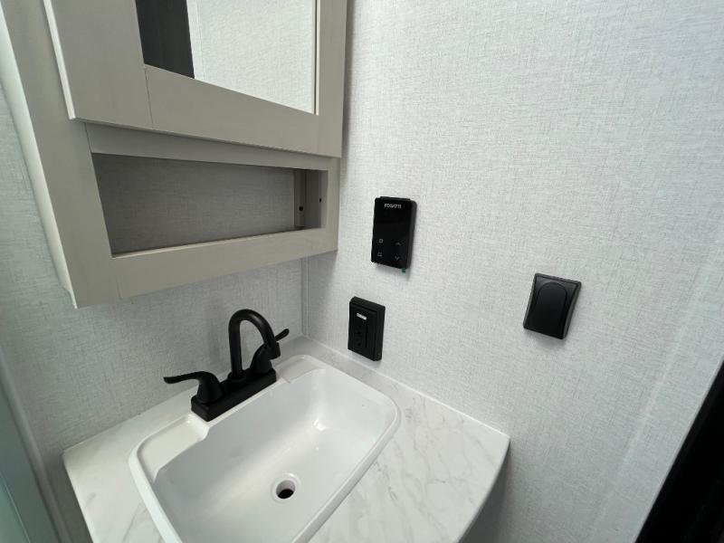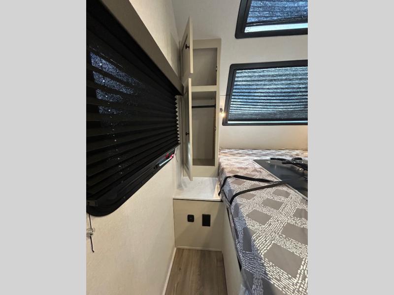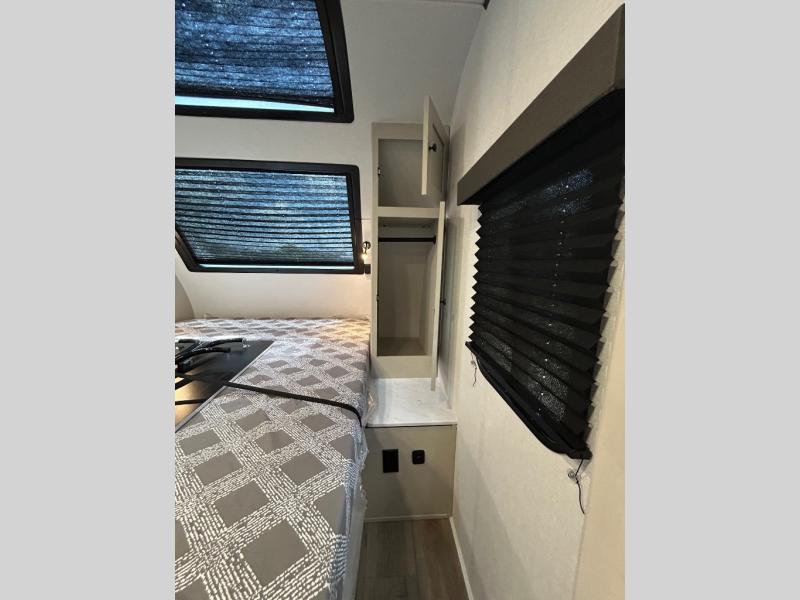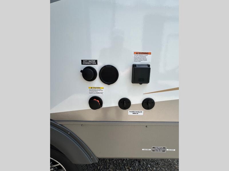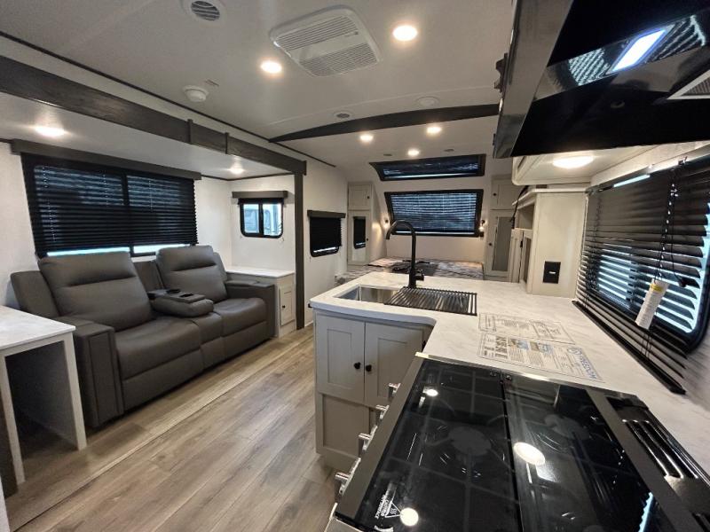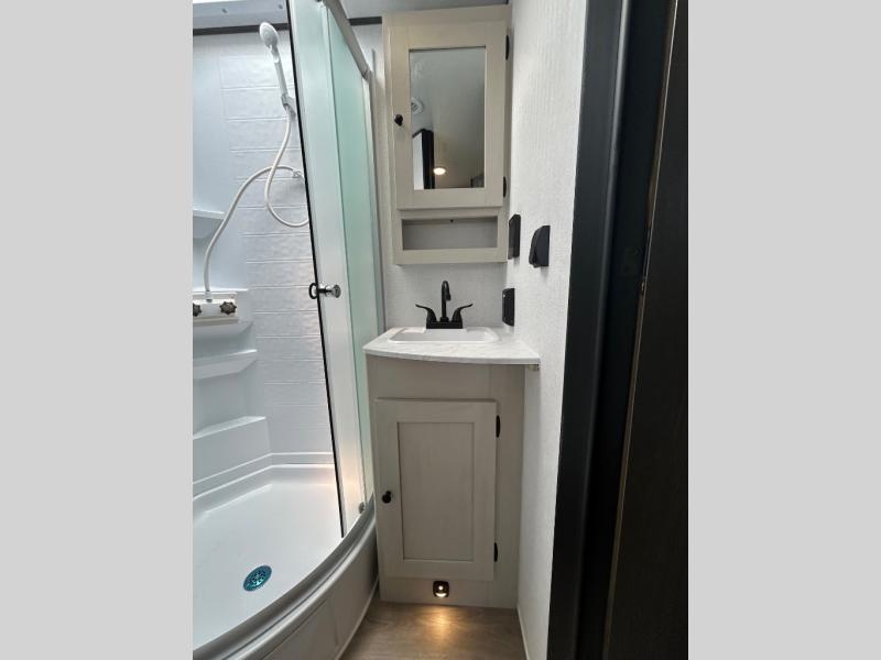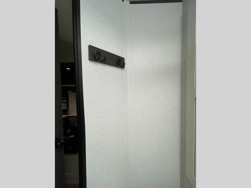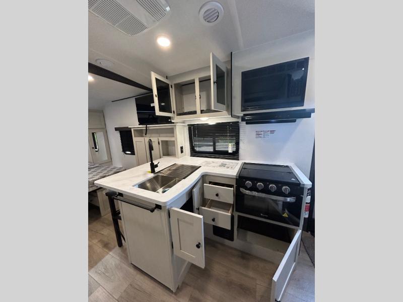 Sleep like royalty at any campsite when you have this trailer setup. You will find the interior is spacious with a slide out sofa including end tables for your drinks and cellphones, and the rear corner bathroom is convenient with a radius shower and linen storage. Your dog can stay clean as well with the exterior dog wash and the dog leash clip will keep them safely at the campsite. While outside you might decide to relax under the 15' awning, and store a few items in the pass-through compartment up front including fishing poles. And the cook will love the L-shaped counter, appliances, the hutch and the bar stools when wanting to take a break or visit with friends.