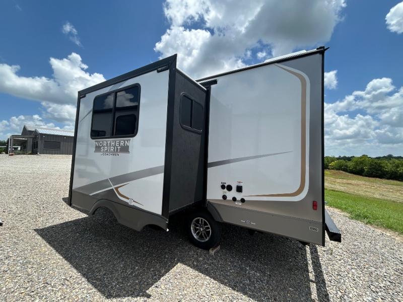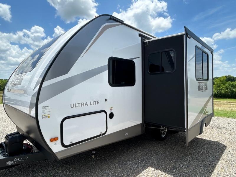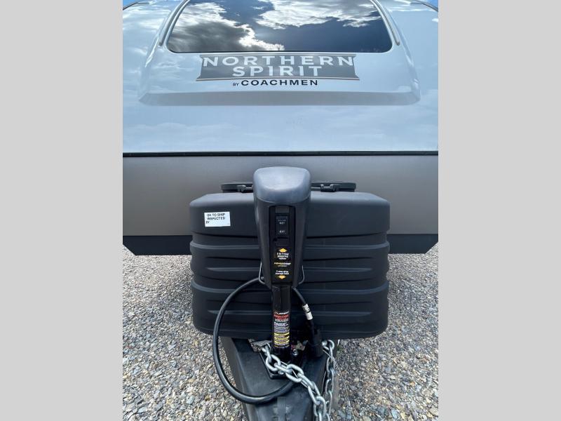 With any Northern Spirit Ultra Lite travel trailer by Coachmen, the "Twice Cool" dual ducted air conditioning system, motion activated floor lights, and the motion activated pass-through storage light plus fishing pole storage, will make your camping experience simplified. The heated and enclosed underbelly provides protection on the road, the 200W solar panel with 30 amp controller provides off-grid camping, and the power tongue jack makes setup easier. Each is built with a front cap with LED strip lights, a laminated, aluminum framed floor, rear wall, and sidewalls, plus a fully walkable roof with seamless Tufflex PVC covering. Make your decision today, and camp with everything in its place!