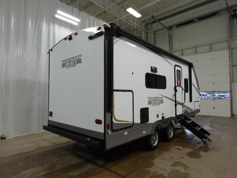 With any Northern Spirit Ultra Lite travel trailer by Coachmen, the "Twice Cool" dual ducted air conditioning system, motion activated floor lights, and the motion activated pass-through storage light plus fishing pole storage, will make your camping experience simplified. The heated and enclosed underbelly provides protection on the road, the 200W solar panel with 30 amp controller provides off-grid camping, and the power tongue jack makes setup easier. Each is built with a front cap with LED strip lights, a laminated, aluminum framed floor, rear wall, and sidewalls, plus a fully walkable roof with seamless Tufflex PVC covering. Make your decision today, and camp with everything in its place!