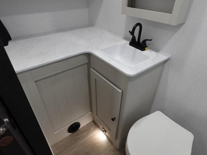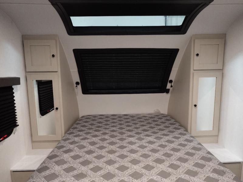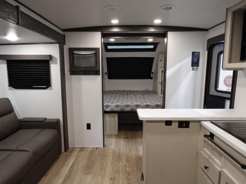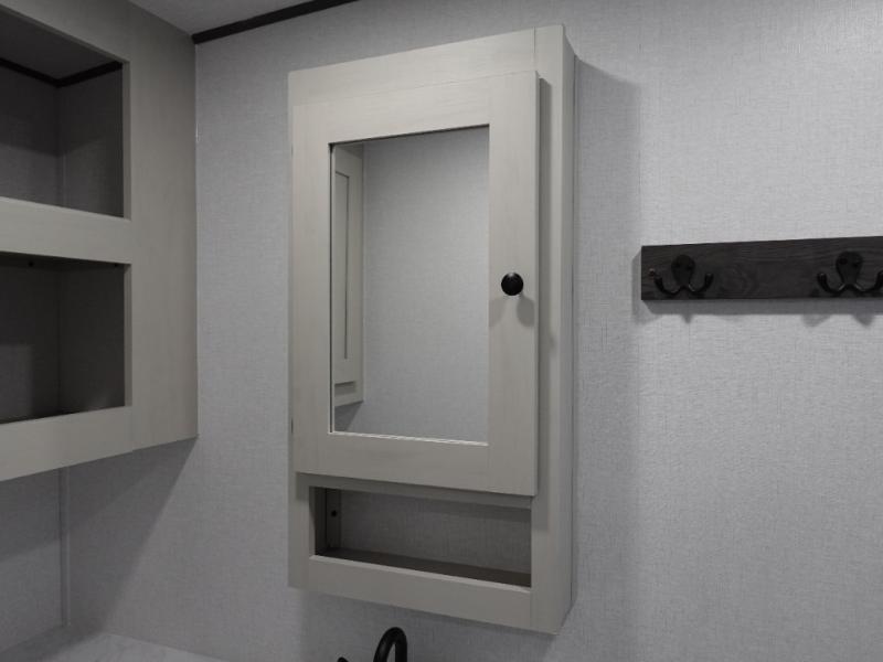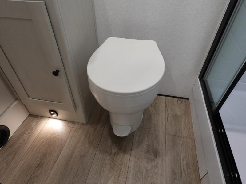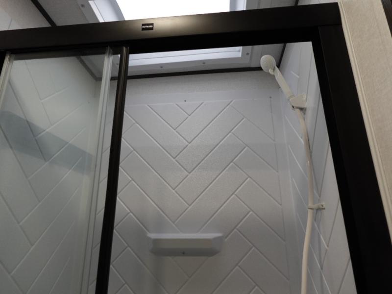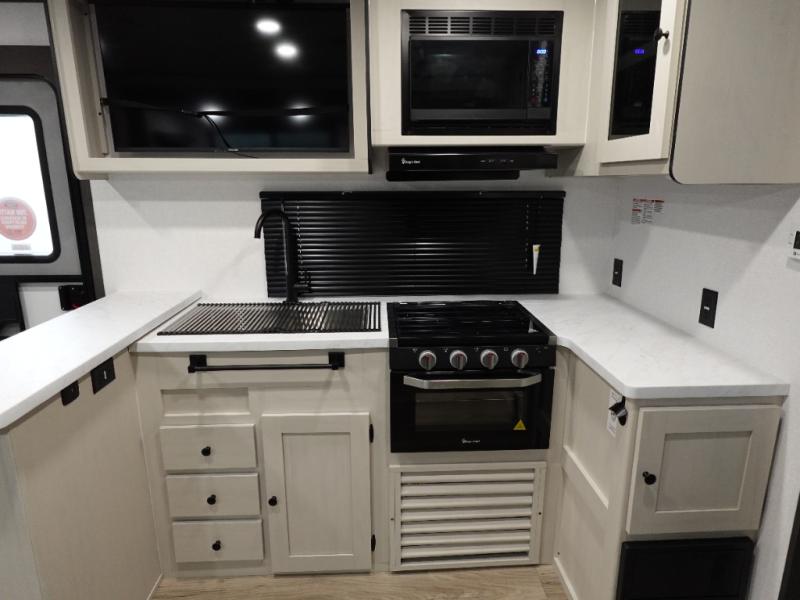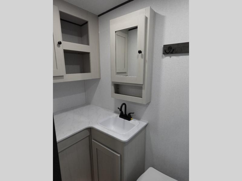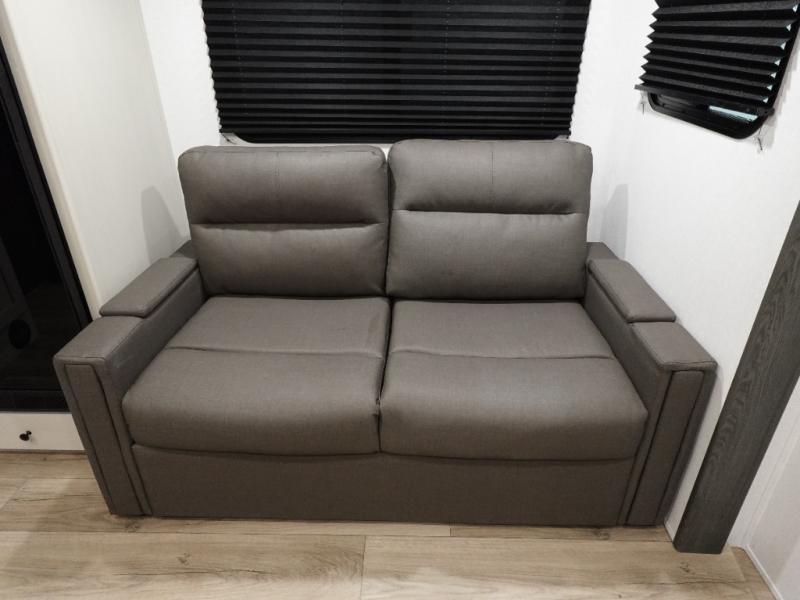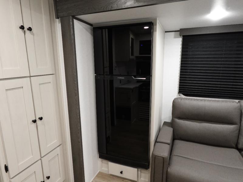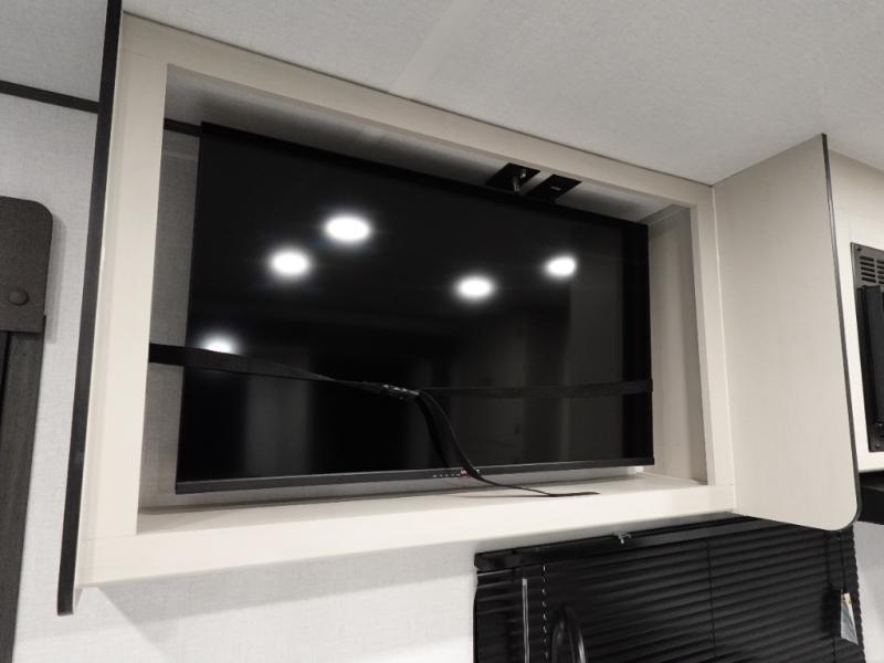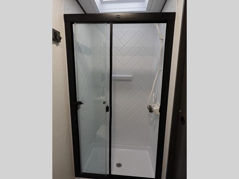 This travel trailer is the perfect match for a couple. It offers comfort and space thanks to the queen size bed with storage below, dual wardrobes and night stands beside the bed. Spend days of fun with the entertainment center which has a 40"TV and theater seats. Also, the rear bathroom is perfect to take a shower after a long day of adventures.