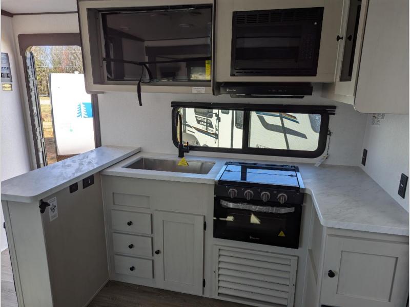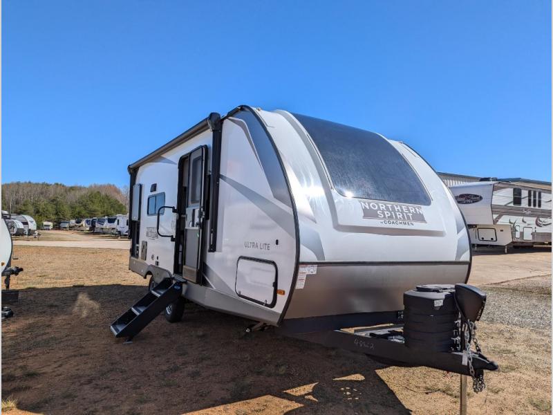 With any Northern Spirit Ultra Lite travel trailer by Coachmen, the "Twice Cool" dual ducted air conditioning system, motion activated floor lights in the bedroom and bathroom, and the motion activated pass-through storage light plus fishing pole storage, will make your camping experience simplified. The heated and enclosed underbelly provides protection on the road and allows you to camp during any season, the 200W solar panel with 30 amp controller provides off-grid camping, and the power tongue jack makes setup easier. Each is built with a front cap with LED strip lights, a laminated, aluminum framed floor, rear wall, and sidewalls, plus 5" trusses with an interior vault. Make your decision today, and camp with everything in its place!