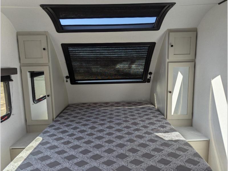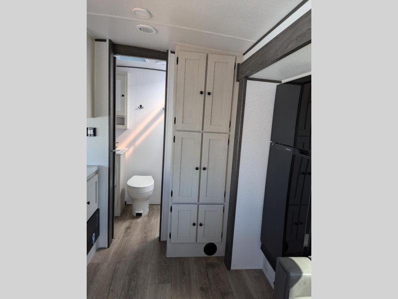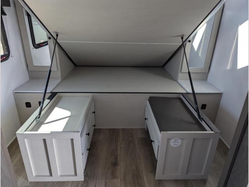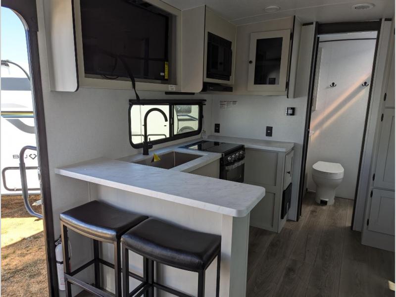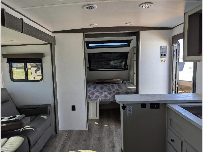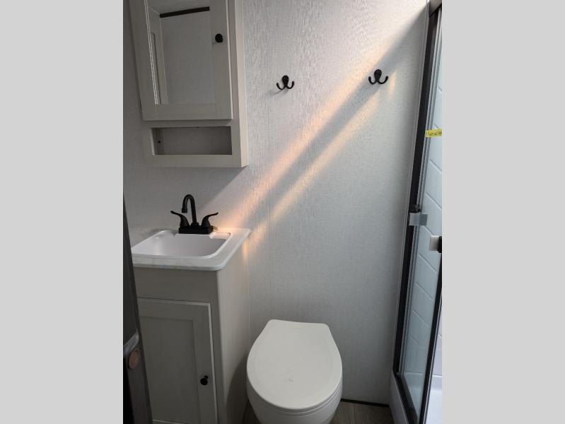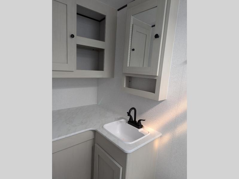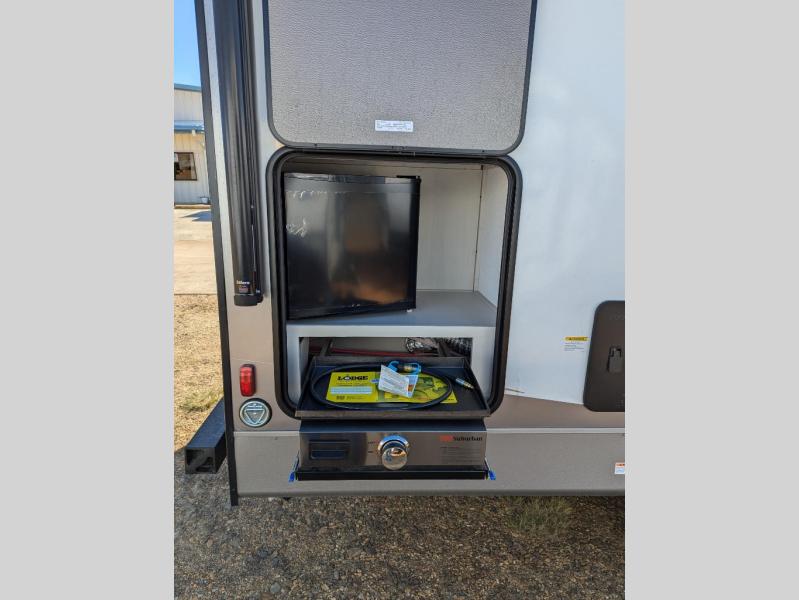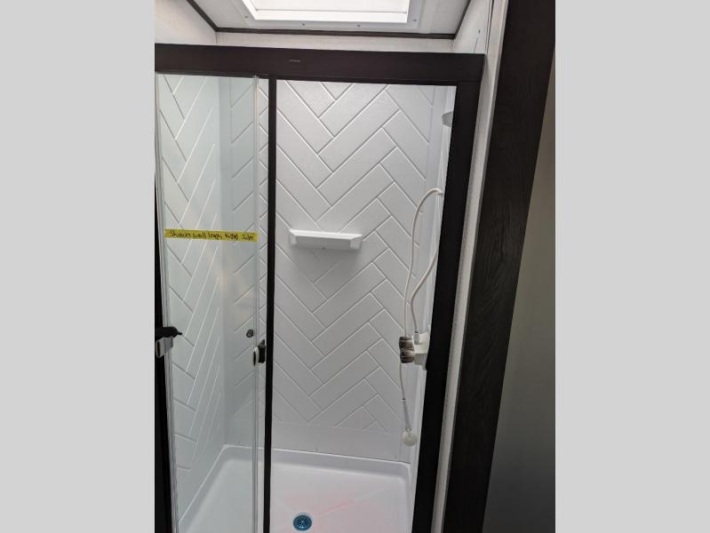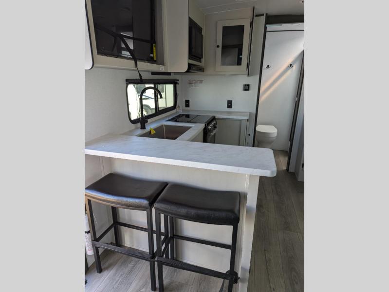 This travel trailer is the perfect match for a couple. It offers comfort and space thanks to the queen size bed with storage below, dual wardrobes and night stands beside the bed. Spend days of fun with the entertainment center which has a 40"TV and theater seats. Also, the rear bathroom is perfect to take a shower after a long day of adventures.