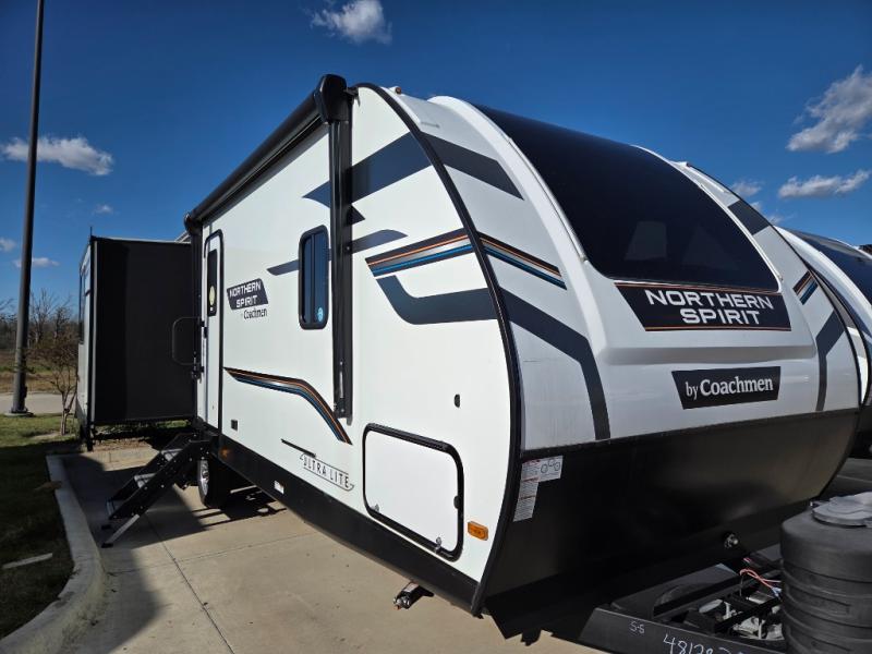 With any Northern Spirit Ultra Lite travel trailer by Coachmen, the "Twice Cool" dual ducted air conditioning system, motion activated floor lights in the bedroom and bathroom, and the motion activated pass-through storage light plus fishing pole storage, will make your camping experience simplified. The heated and enclosed underbelly provides protection on the road and allows you to camp during any season, the 200W solar panel with 30 amp controller provides off-grid camping, and the power tongue jack makes setup easier. Each is built with a front cap with LED strip lights, a laminated, aluminum framed floor, rear wall, and sidewalls, plus 5" trusses with an interior vault. Make your decision today, and camp with everything in its place!