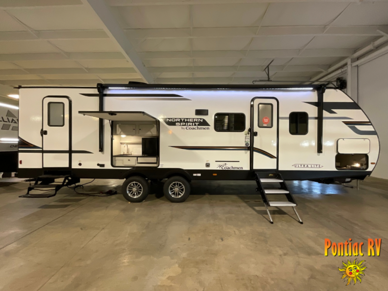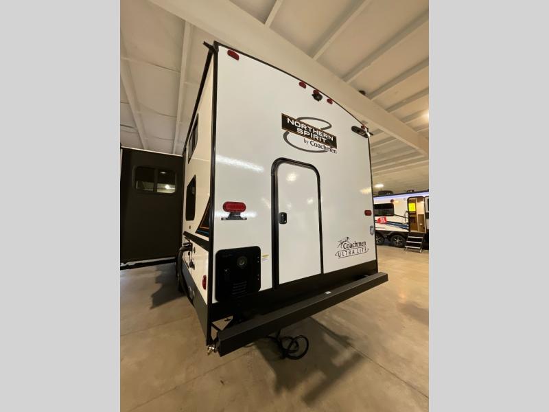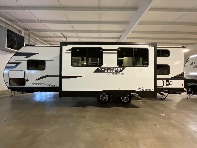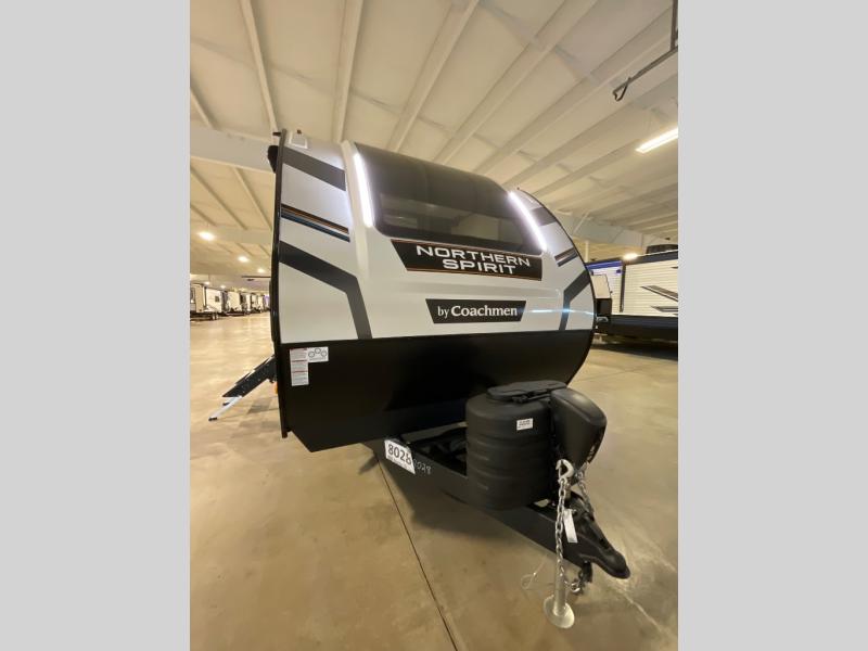 With any Northern Spirit Ultra Lite travel trailer by Coachmen, the "Twice Cool" dual ducted air conditioning system, the motion activated floor lights in the bedroom and bathroom, the lighted USB ports, the digital level, and the motion activated pass-through storage light plus fishing pole storage, will make your camping experience simplified. The heated and enclosed underbelly provides protection on the road and allows you to camp during any season, the 200W solar panel with 30 amp controller provides off-grid camping, and the power tongue jack makes setup easier. Each is built with a 3/4 painted fiberglass front cap with LED strip lights, a laminated, aluminum framed floor, rear wall, and sidewalls, plus 5" trusses with an interior vault. Make your decision today, and camp with everything in its place!