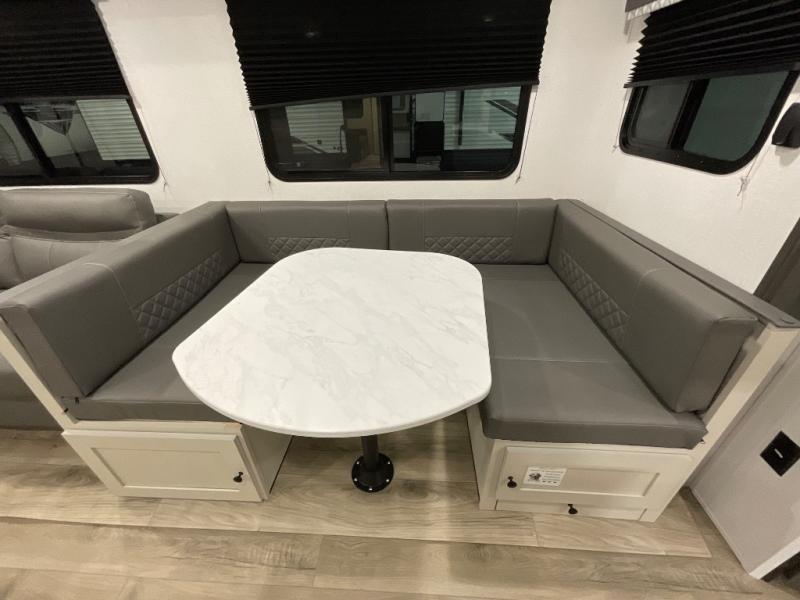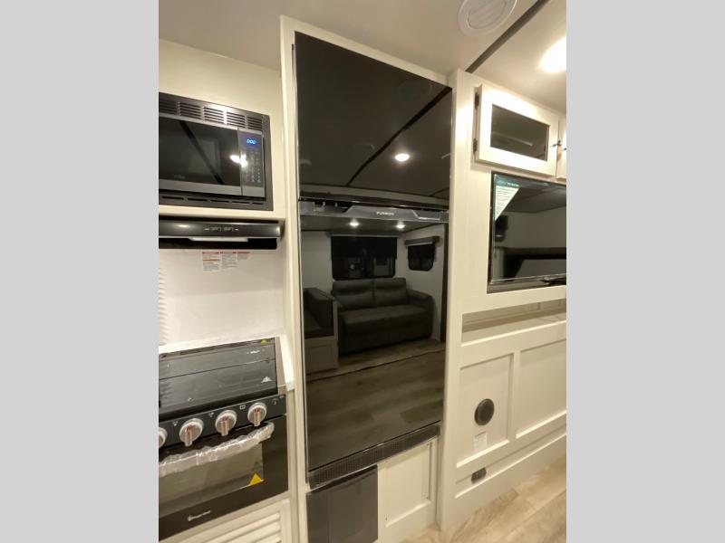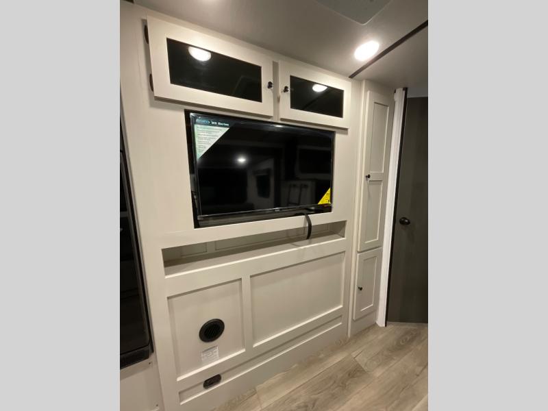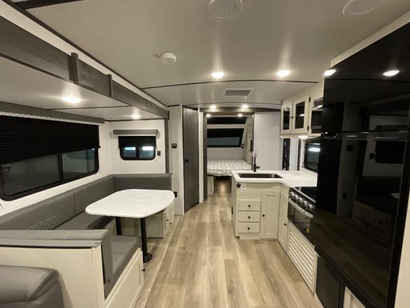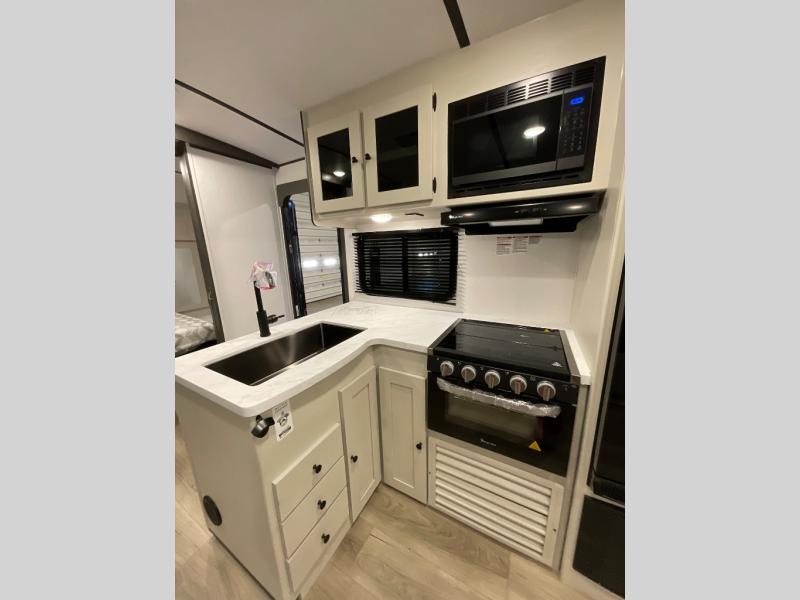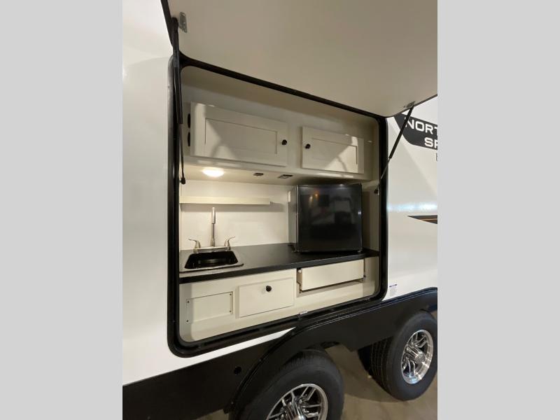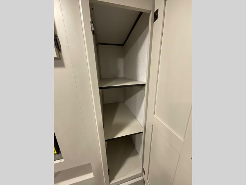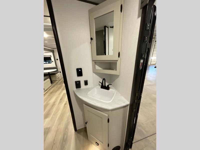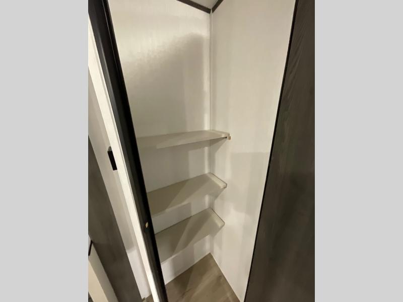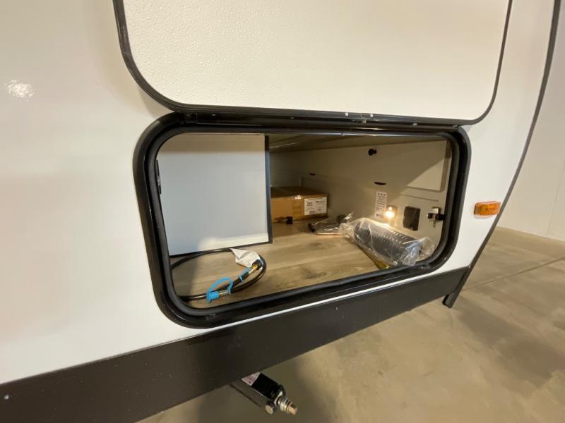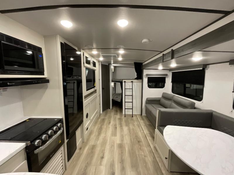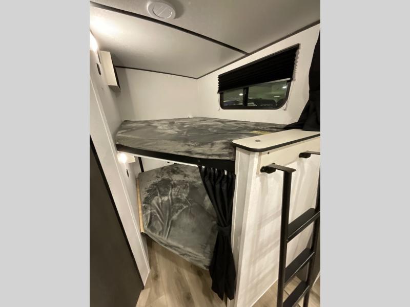 This is a popular bunk trailer for a larger family thanks to having the convenience of dual entry doors allowing access to the main living and kitchen area and near the front bedroom, and into the full bathroom for a quick in and out when playing outside. The bathroom also includes a hamper for convenience. The Stor-More cargo door allows you to place items from the exterior to the interior under the lower flip bunk for safe travels to your destinations and back home. The kids will surely love the convenience centers when playing or sleeping in a bunk. There is a sofa and U-shaped slide including a pet center for relaxing and feeding your pet. The kitchen includes full amenities plus a pantry to store lots of goodies for everyone. Along the exterior, the outside camp kitchen will come in handy when you have everyone at the campsite for dinner and the power awning offers some protection from the elements.