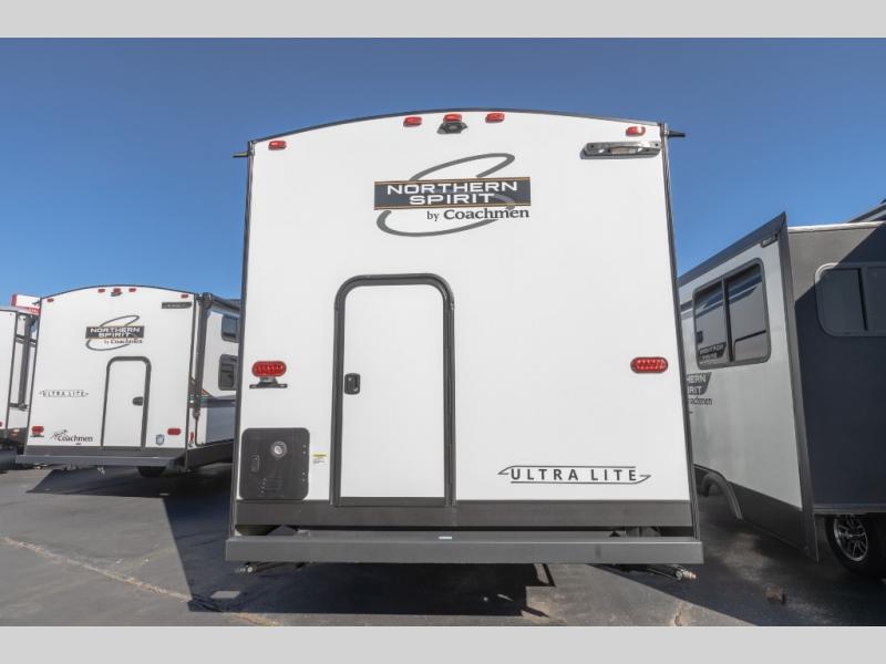 With any Northern Spirit Ultra Lite travel trailer by Coachmen, the "Twice Cool" dual ducted air conditioning system, motion activated floor lights in the bedroom and bathroom, and the motion activated pass-through storage light plus fishing pole storage, will make your camping experience simplified. The heated and enclosed underbelly provides protection on the road and allows you to camp during any season, the 200W solar panel with 30 amp controller provides off-grid camping, and the power tongue jack makes setup easier. Each is built with a front cap with LED strip lights, a laminated, aluminum framed floor, rear wall, and sidewalls, plus 5" trusses with an interior vault. Make your decision today, and camp with everything in its place!