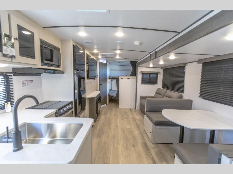 This is a popular bunk trailer for a larger family thanks to having the convenience of dual entry doors allowing access to the main living and kitchen area and near the front bedroom, and into the full bathroom for a quick in and out when playing outside. The bathroom also includes a hamper for convenience. The Stor-More cargo door allows you to place items from the exterior to the interior under the lower flip bunk for safe travels to your destinations and back home. The kids will surely love the convenience centers when playing or sleeping in a bunk. There is a sofa and U-shaped slide including a pet center for relaxing and feeding your pet. The kitchen includes full amenities plus a pantry to store lots of goodies for everyone. Along the exterior, the outside camp kitchen will come in handy when you have everyone at the campsite for dinner and the 18' awning offers some protection from the elements.
