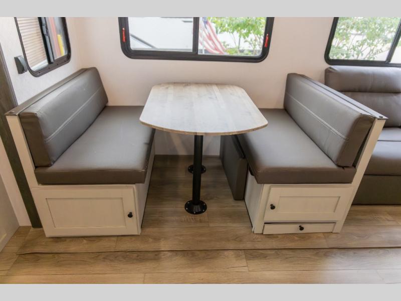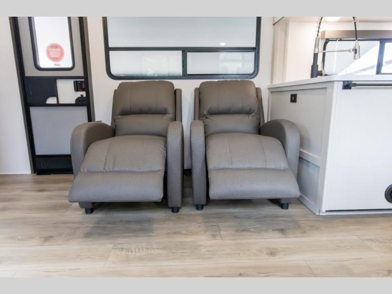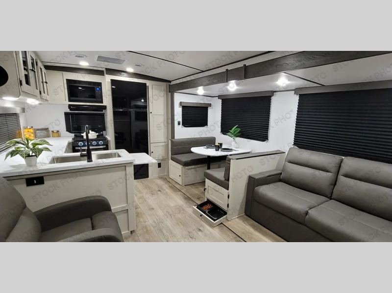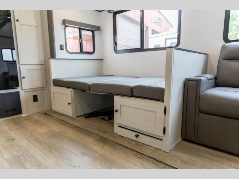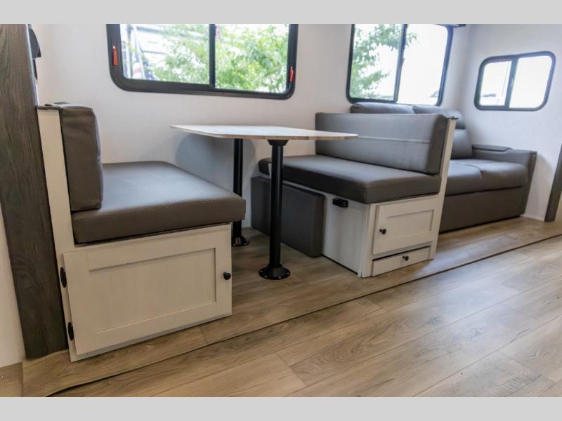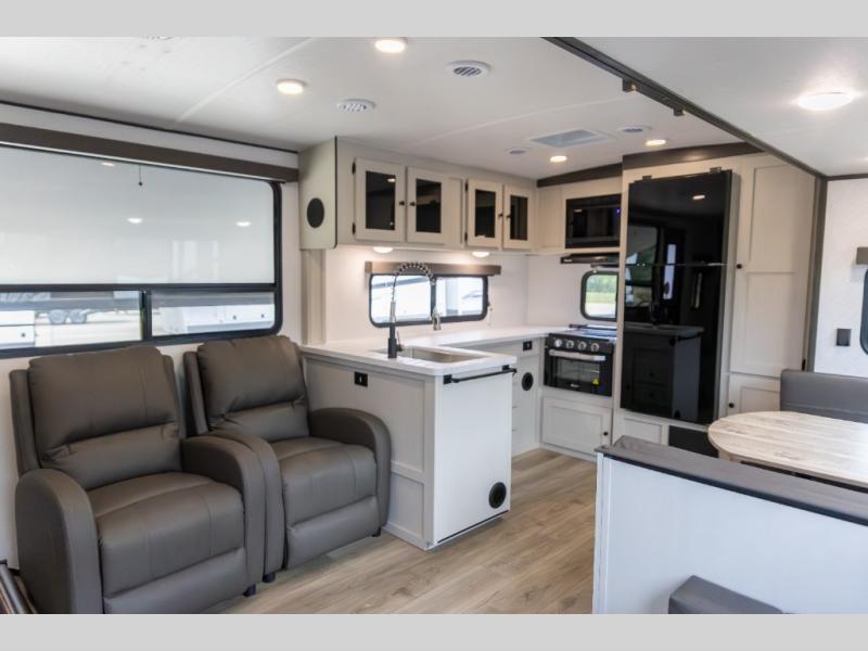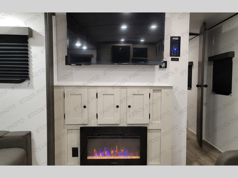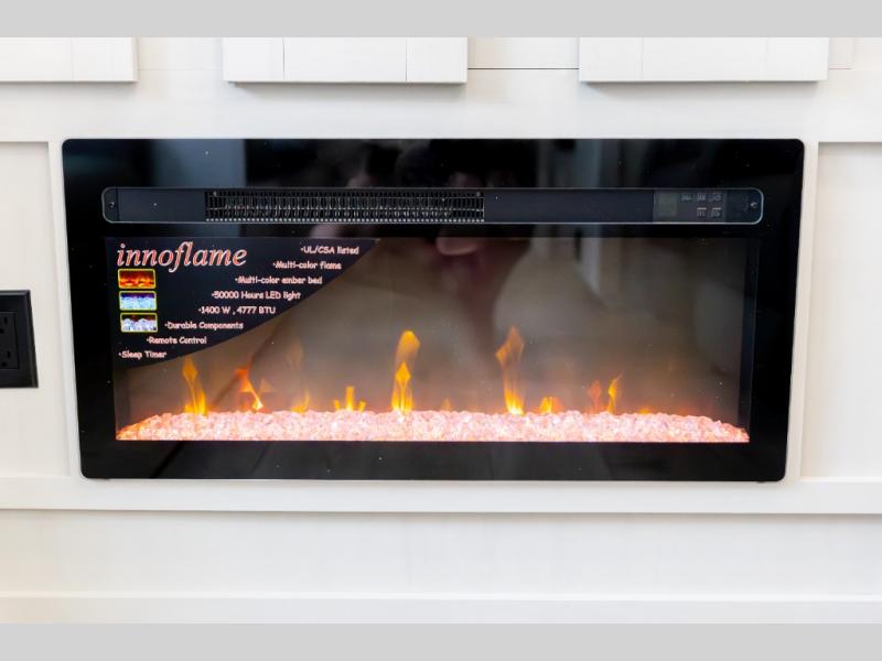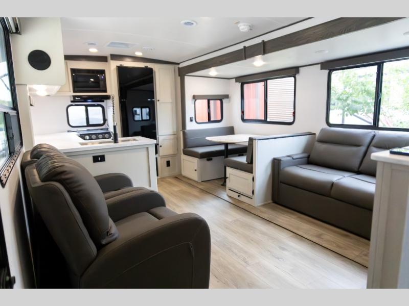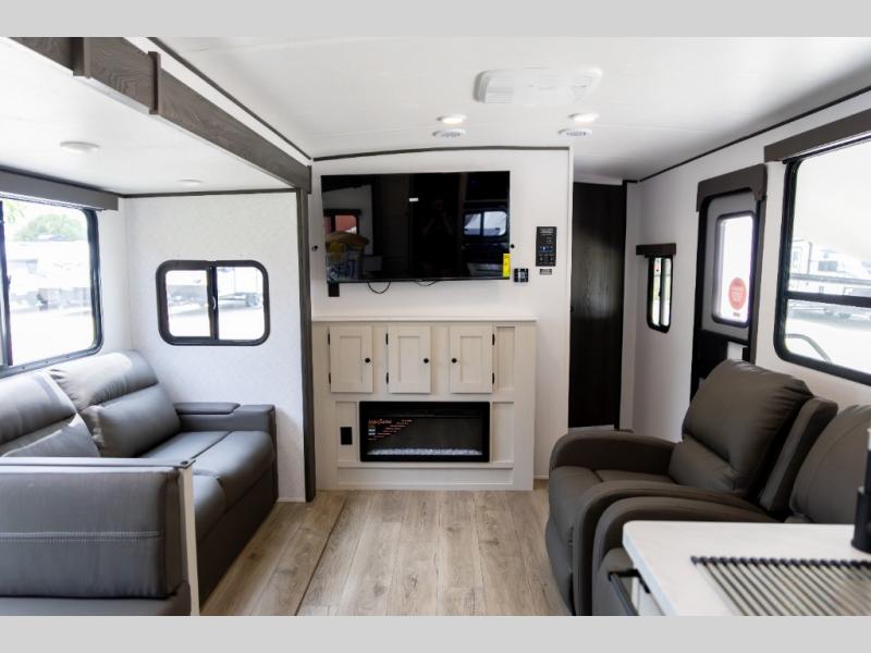 You'll love the space you have in this travel trailer thanks to the large slide out, spacious full bath, and front private bedroom. The booth dinette and tri-fold sofa within the slide out will provide a place to relax and sleep additional guests, and the two recliners are close to the fireplace to make this area feel more like home. The chef will love the rear kitchen with ample counter space and a pantry, plus there is an exterior camp kitchen to make breakfast at. You'll also find a 20' power awning outdoors, a pass-through storage, plus a dog wash that will come in handy after hiking.