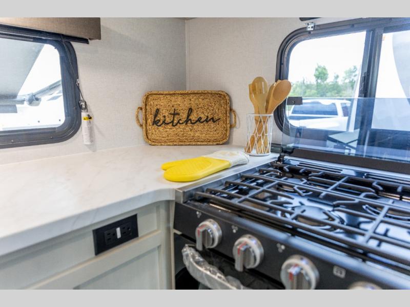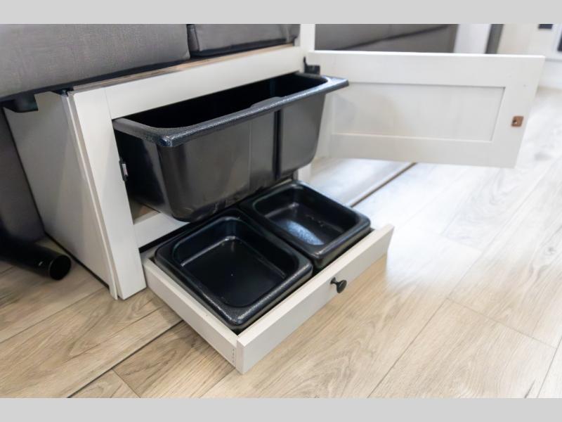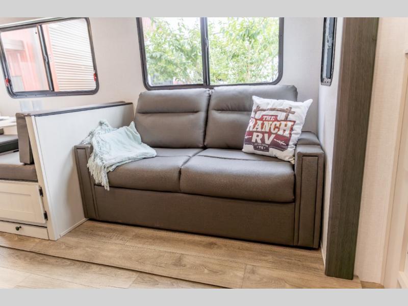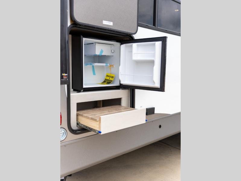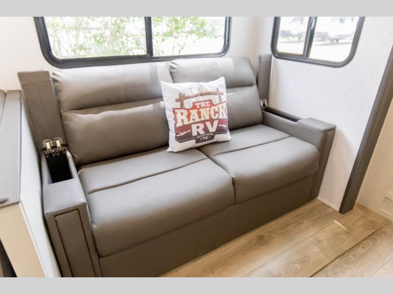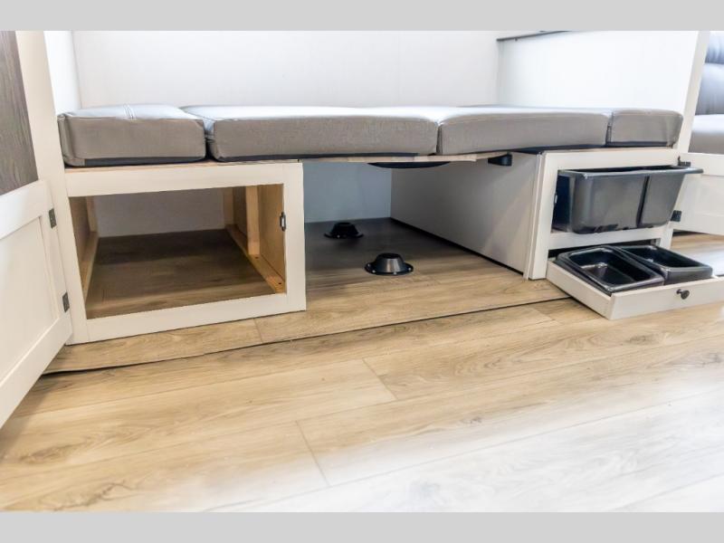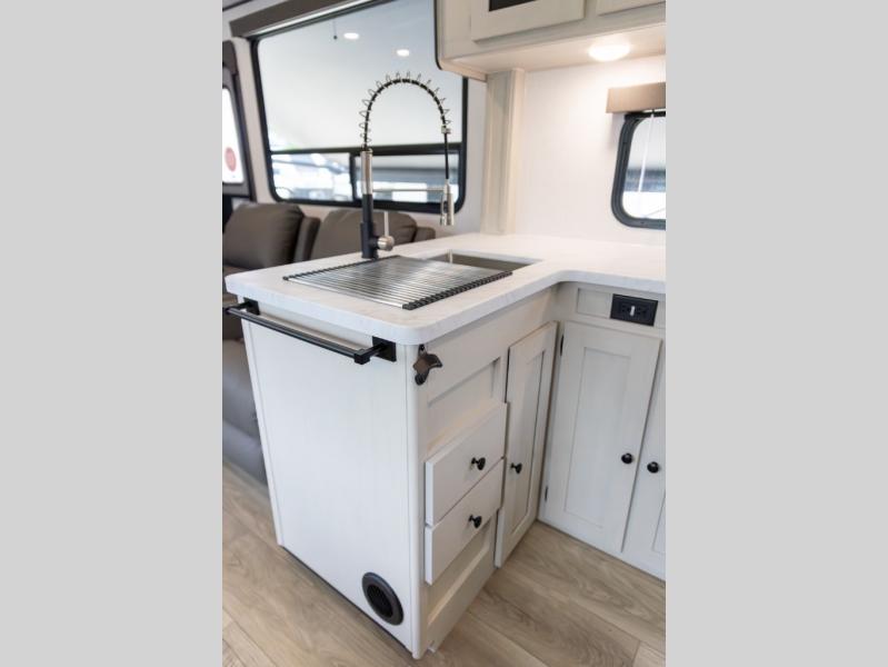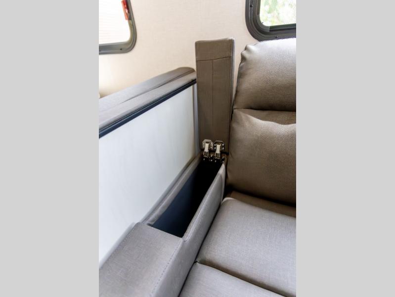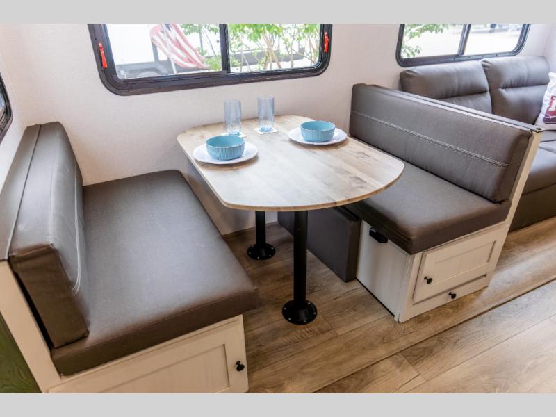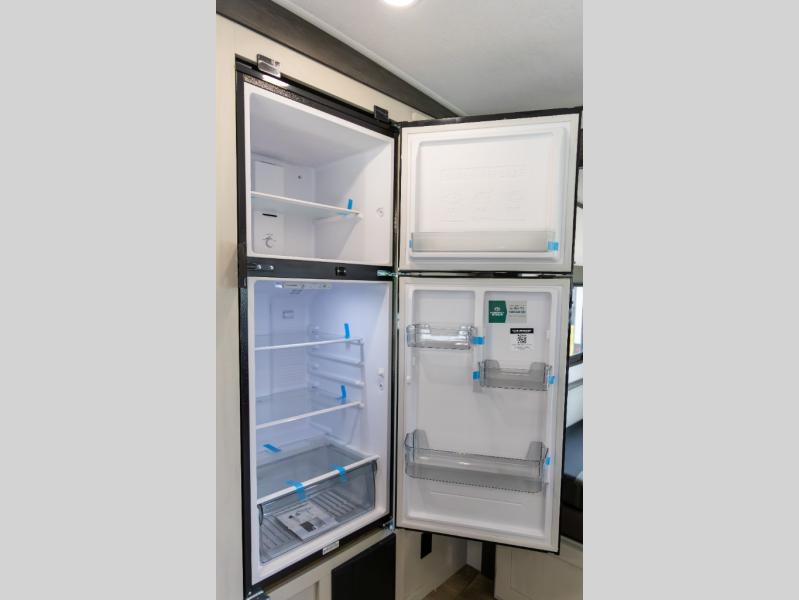 You'll love the space you have in this travel trailer thanks to the large slide out, spacious full bath, and front private bedroom. The booth dinette and tri-fold sofa within the slide out will provide a place to relax and sleep additional guests, and the two recliners are close to the fireplace to make this area feel more like home. The chef will love the rear kitchen with ample counter space and a pantry, plus there is an exterior camp kitchen to make breakfast at. You'll also find a 20' power awning outdoors, a pass-through storage, plus a dog wash that will come in handy after hiking.