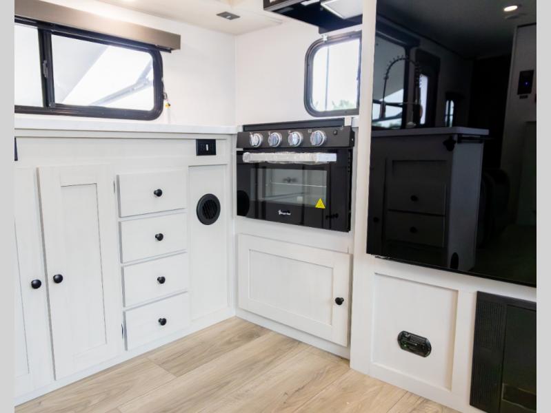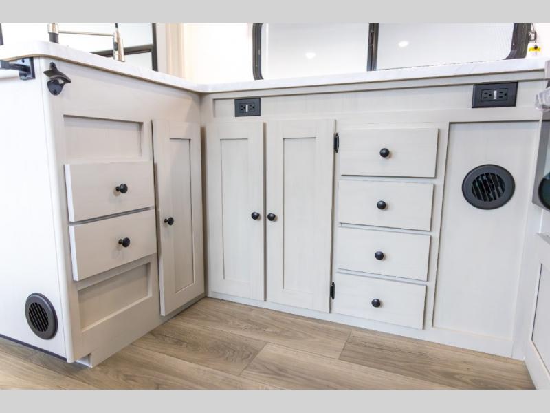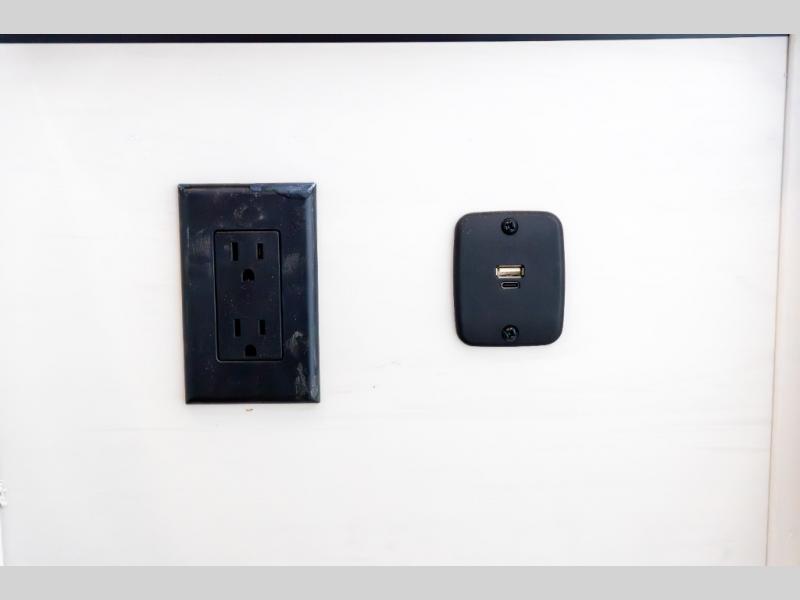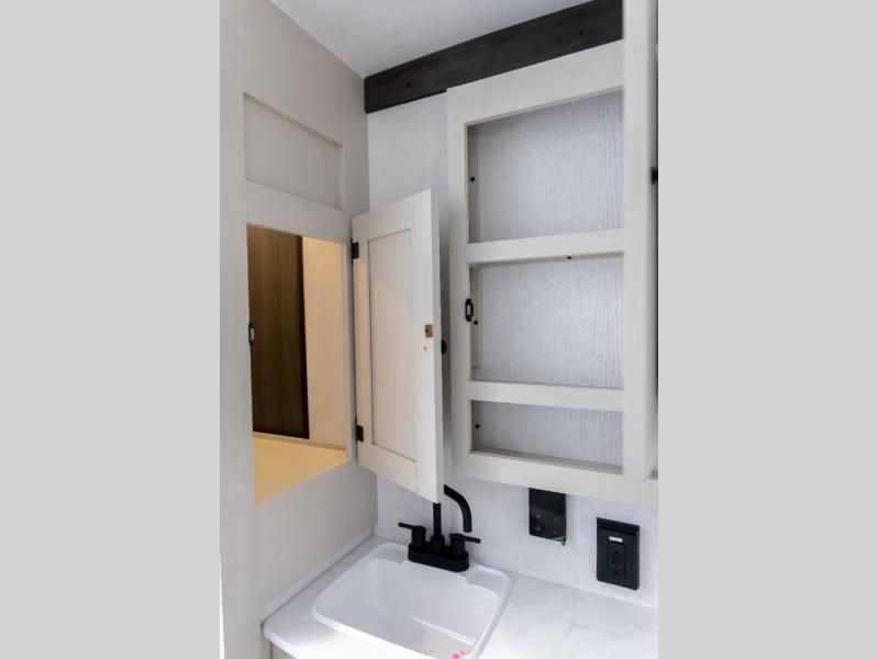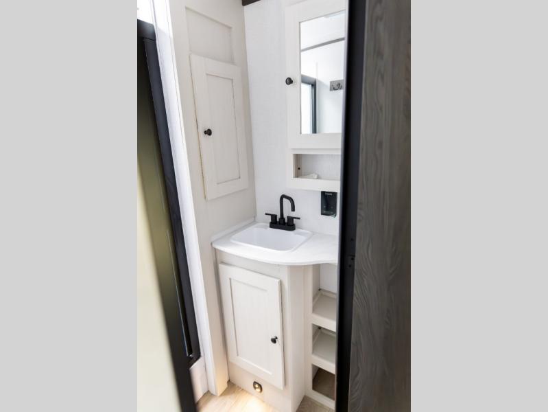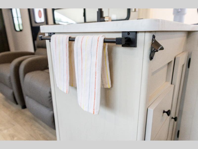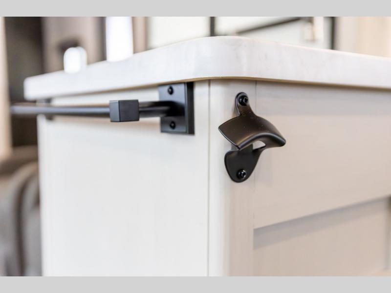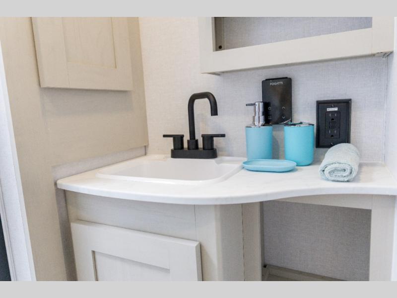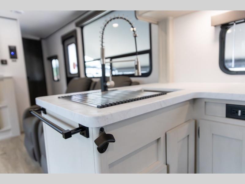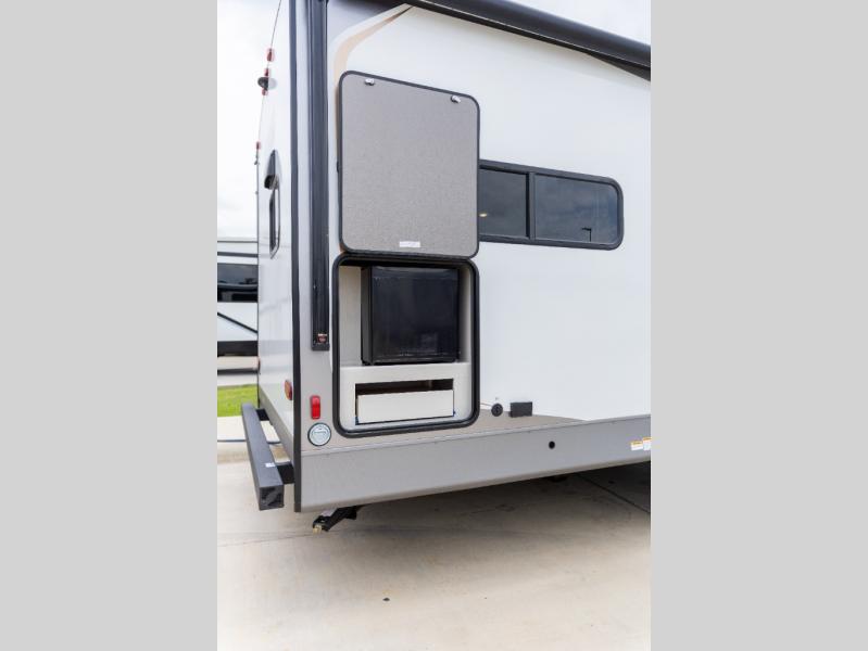 You'll love the space you have in this travel trailer thanks to the large slide out, spacious full bath, and front private bedroom. The booth dinette and tri-fold sofa within the slide out will provide a place to relax and sleep additional guests, and the two recliners are close to the fireplace to make this area feel more like home. The chef will love the rear kitchen with ample counter space and a pantry, plus there is an exterior camp kitchen to make breakfast at. You'll also find a 20' power awning outdoors, a pass-through storage, plus a dog wash that will come in handy after hiking.