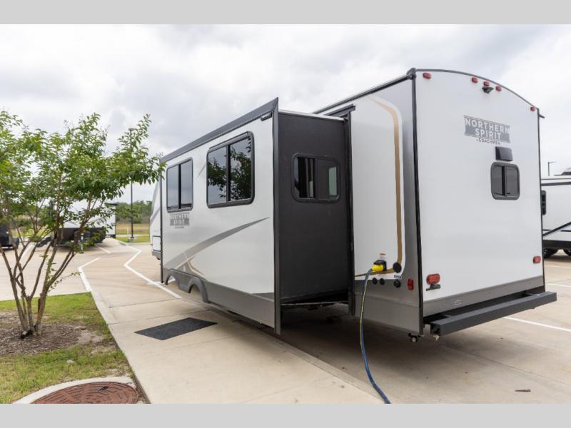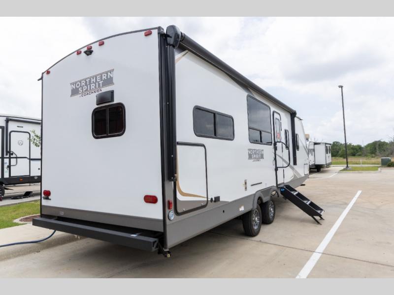With any Northern Spirit Ultra Lite travel trailer by Coachmen, the "Twice Cool" dual ducted air conditioning system, motion activated floor lights, and the motion activated pass-through storage light plus fishing pole storage, will make your camping experience simplified. The heated and enclosed underbelly provides protection on the road, the 200W solar panel with 30 amp controller provides off-grid camping, and the power tongue jack makes setup easier. Each is built with a front cap with LED strip lights, a laminated, aluminum framed floor, rear wall, and sidewalls, plus a fully walkable roof with seamless Tufflex PVC covering. Make your decision today, and camp with everything in its place!
