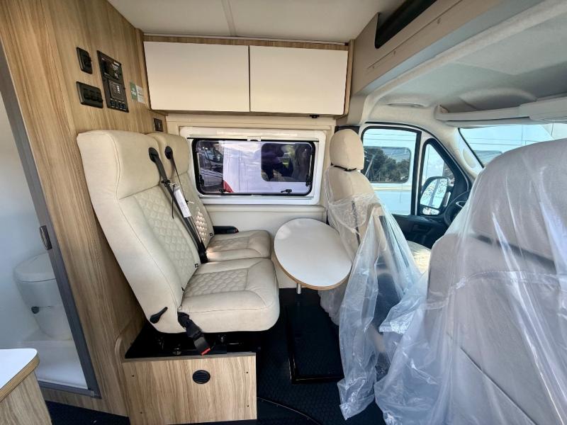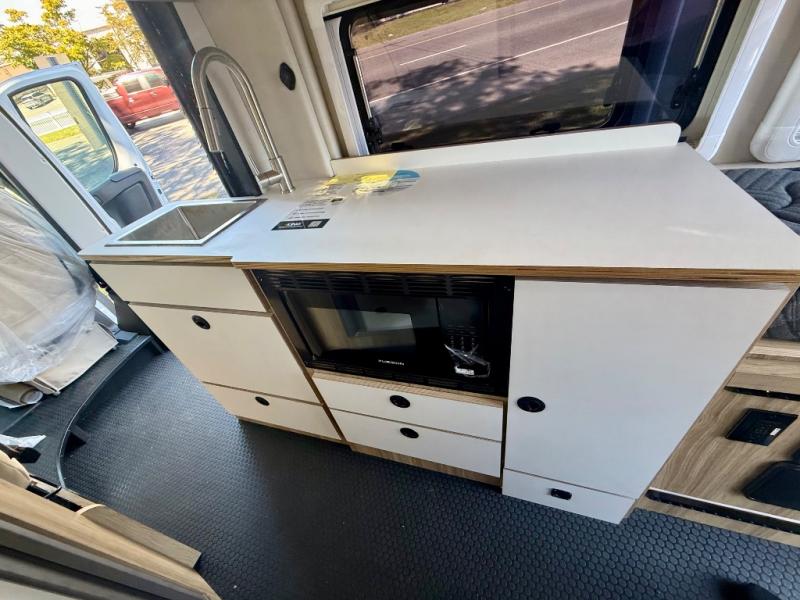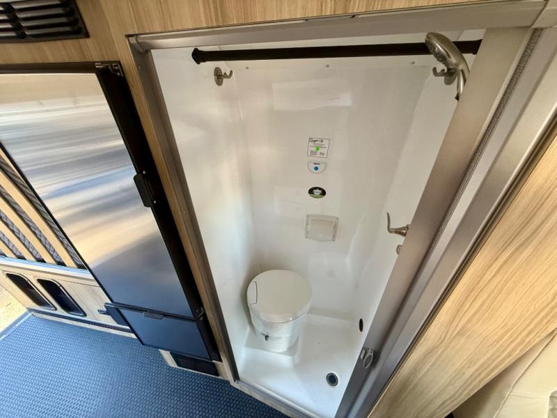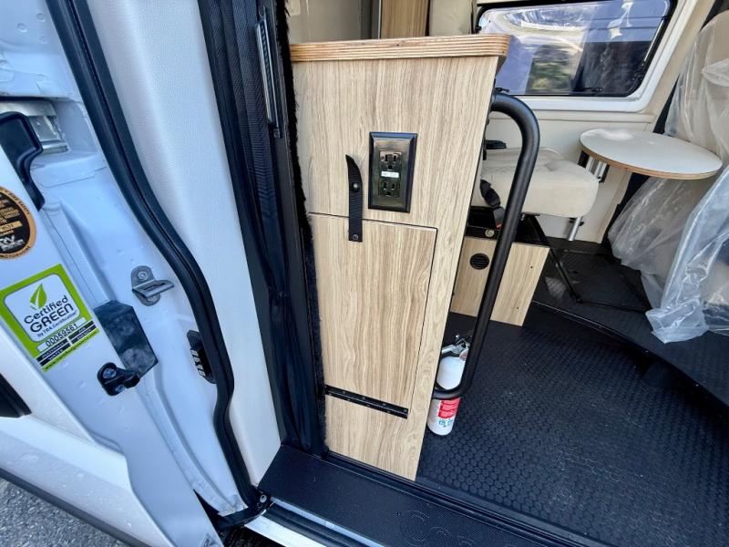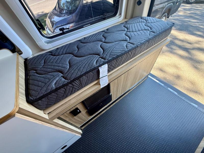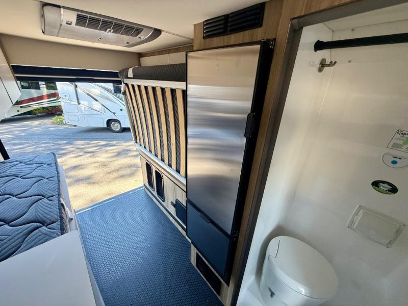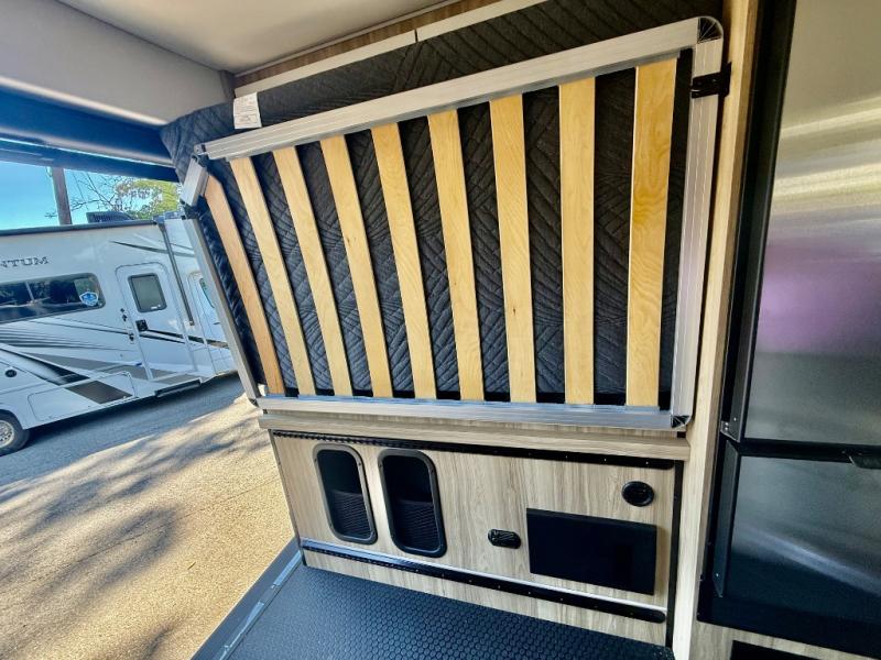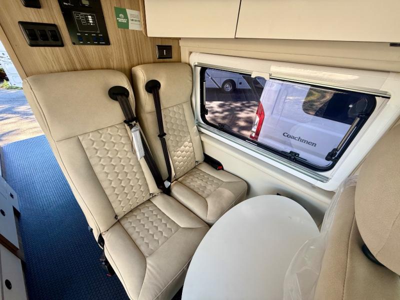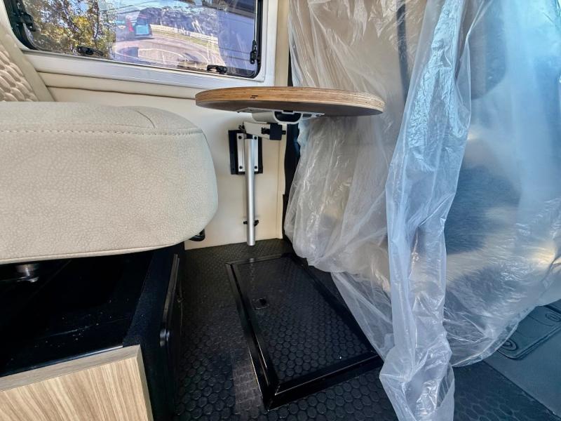 Start a new adventure across the states in this cozy coach! Once you arrive at the campground, you can make lunch on the induction cooktop or in the air fryer/convection microwave. There is also a 7.3 cu. ft. refrigerator with a pull-out freezer drawer to keep your food fresh. You'll find multiple overhead cabinets to keep your belongings tucked out of the way, and the compact wet bath will let you freshen up after a day outdoors. Up front, you'll find two captains seats plus two additional cab seats with a removable table and storage boxes. The 56" x 77" Murphy bed provides versatile sleeping space when you're ready to get some shut-eye. If you're needing additional sleeping space, you can choose the optional pop-top. When the optional pop-top is chosen, the standard Truma A/C is changed out for a Coleman Mach 10 A/C; see dealer for more details.