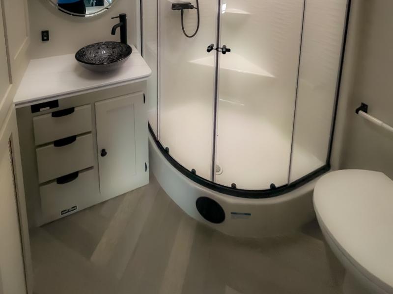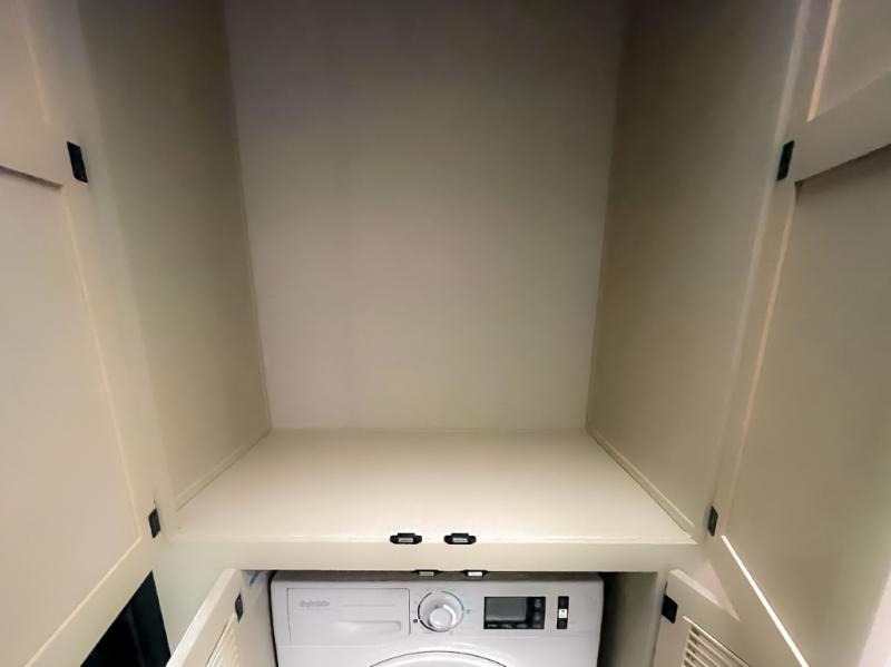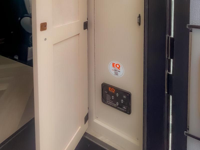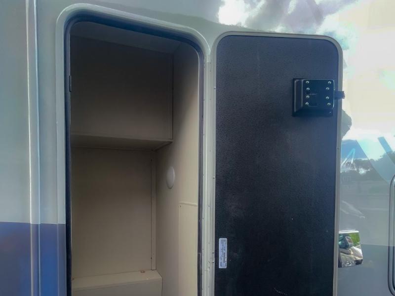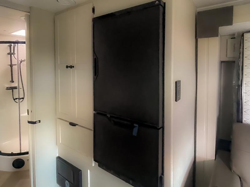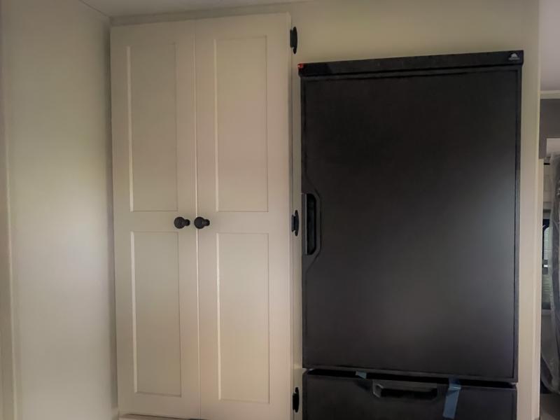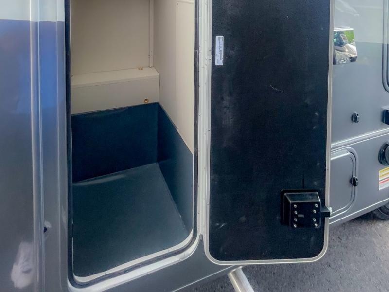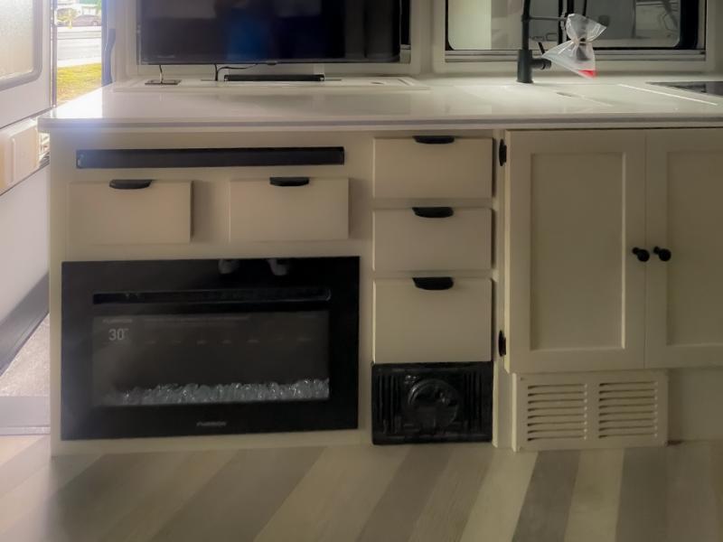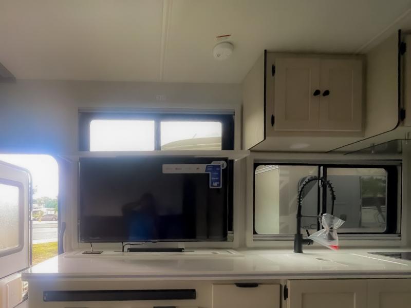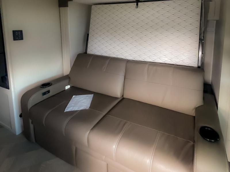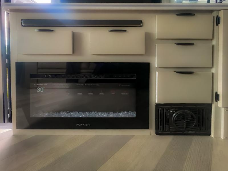 You will enjoy the versatility that this Murphy bed model provides. Depending on whether it is daytime or evening will determine if you have a 60" x 74" bed that slides out or a 62" sofa to enjoy. There is a 45" x 76" cab over bunk that can be used for added sleeping for two more guests, or to be used as added storage space. The rear full bath is spacious and private and includes a 32" x 32" angled shower, toilet, vanity with sink, plus linen cabinet, and wardrobe. The kitchen features everything needed to create meals while on the go, and a cozy fireplace is included beneath the coach TV for your enjoyment. Outside, you will find a second TV beneath the armless awning so you can enjoy watching your favorite movies and games whenever you like.