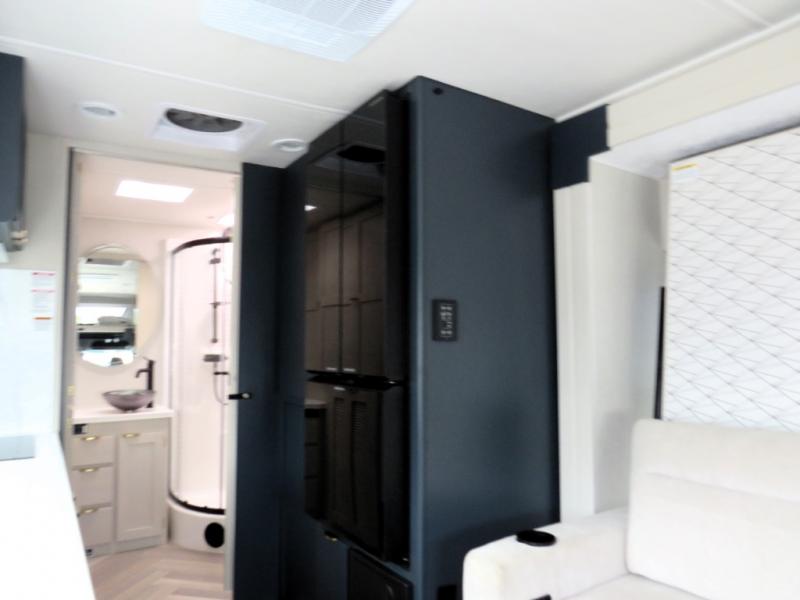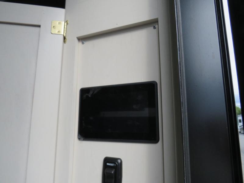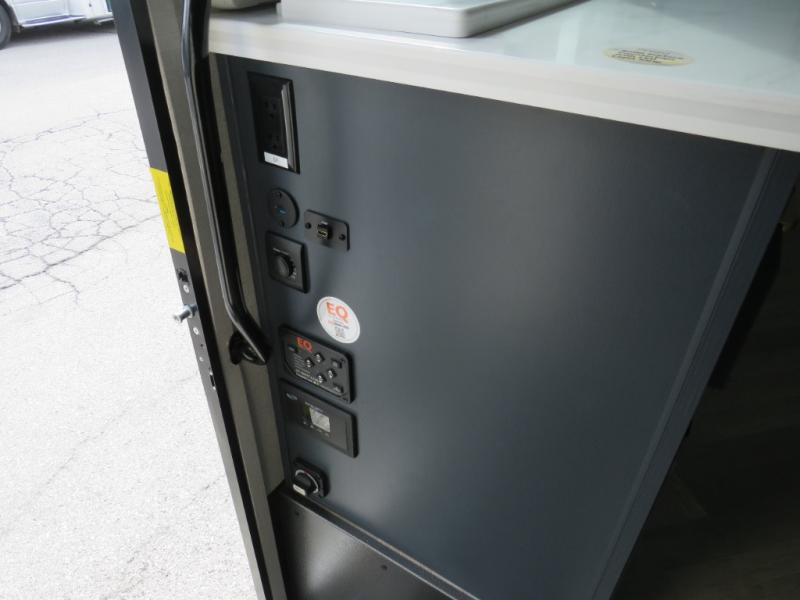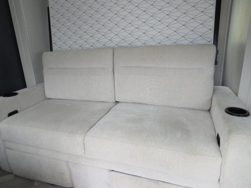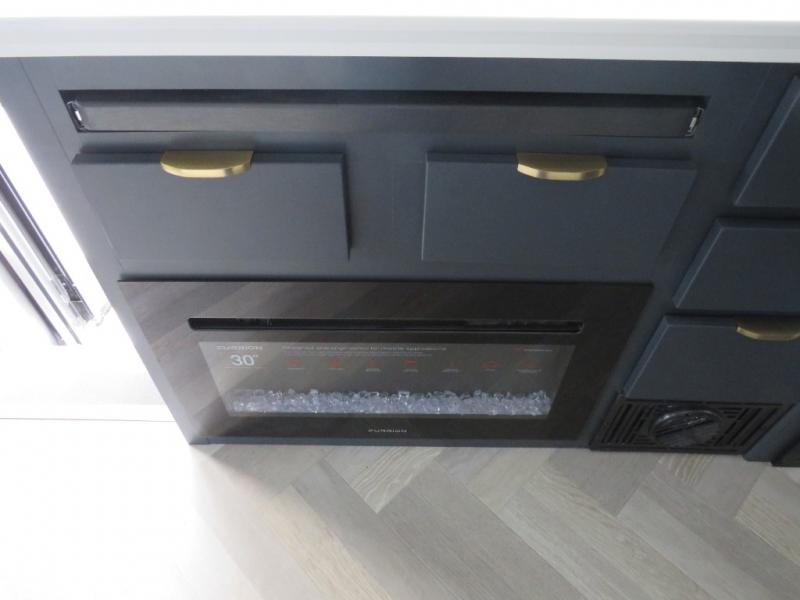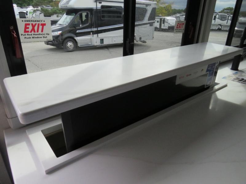 You will enjoy the versatility that this Murphy bed model provides. Depending on whether it is daytime or evening will determine if you have a 60" x 74" bed that slides out or a 62" sofa to enjoy. There is a 45" x 76" cab over bunk that can be used for added sleeping for two more guests, or to be used as added storage space. The rear full bath is spacious and private and includes a 32" x 32" angled shower, toilet, vanity with sink, plus linen cabinet, and wardrobe. The kitchen features everything needed to create meals while on the go, and a cozy fireplace is included beneath the coach TV for your enjoyment. Outside, you will find a second TV beneath the armless awning so you can enjoy watching your favorite movies and games whenever you like.