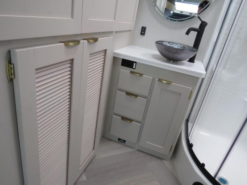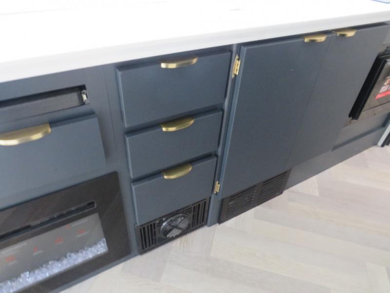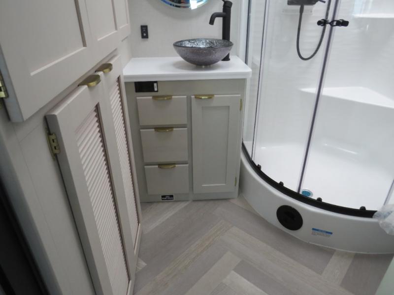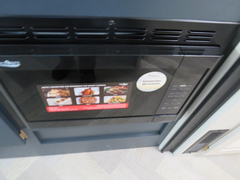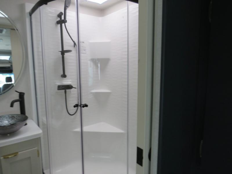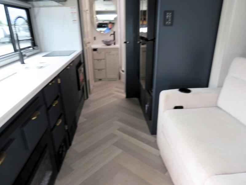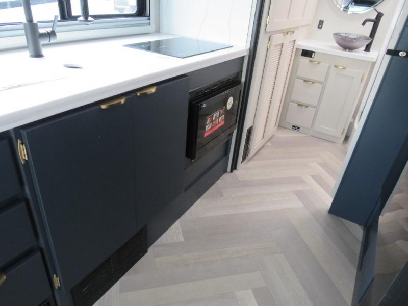 You will enjoy the versatility that this Murphy bed model provides. Depending on whether it is daytime or evening will determine if you have a 60" x 74" bed that slides out or a 62" sofa to enjoy. There is a 45" x 76" cab over bunk that can be used for added sleeping for two more guests, or to be used as added storage space. The rear full bath is spacious and private and includes a 32" x 32" angled shower, toilet, vanity with sink, plus linen cabinet, and wardrobe. The kitchen features everything needed to create meals while on the go, and a cozy fireplace is included beneath the coach TV for your enjoyment. Outside, you will find a second TV beneath the armless awning so you can enjoy watching your favorite movies and games whenever you like.