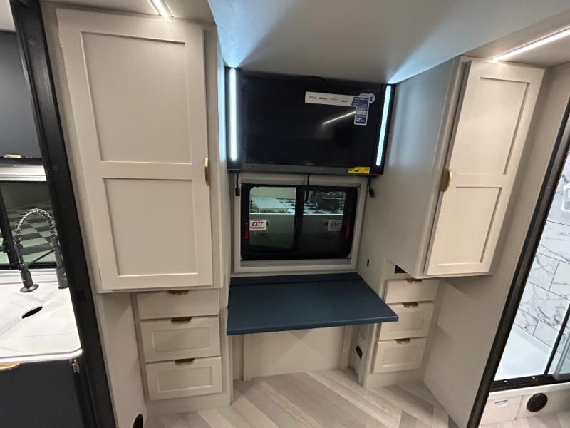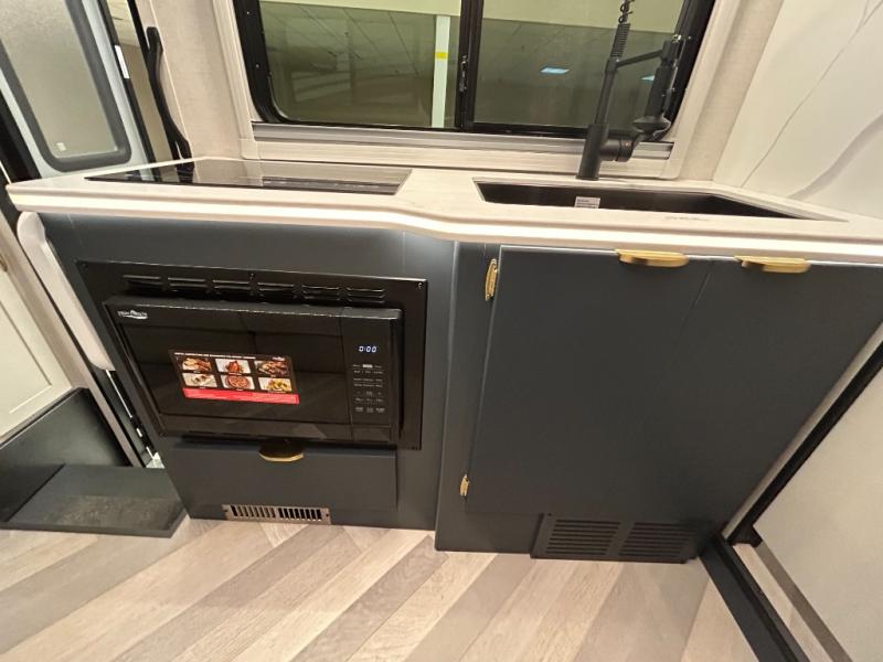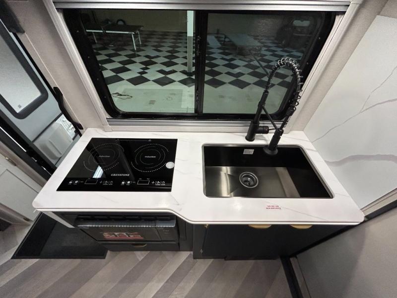 You'll love traveling in this luxury coach with friends or family. Once you stop for the day, you can make dinner on the two burner induction cooktop, grab a cold drink from the refrigerator, and relax on the sofa with recliners. The master bedroom includes a queen bed slide out, dual wardrobes, and a workstation if you need to get some work done. And don't overlook the full rear bath, complete with a 24" x 36" shower, toilet, sink, and linen closet for clean towels.