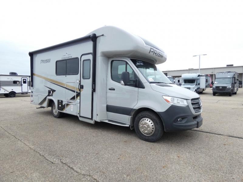 With any of the Prism Elite Class C diesel motorhomes, the Coachmen legacy of upscale luxury with Mercedes-Benz drivability is found throughout. With the aerodynamic and stylish molded fiberglass front and rear caps plus three full body paint choices, you are sure to turn heads as you travel to your destination. There is also solar prep outside, along with exterior storage and an armless awning. The interior provides solid surface countertops, large closets to store your things, day/night shades for added privacy, plus a soft touch ceiling. A Truma Aqua Go on-demand water heater will provide endless hot showers and the Even Cool A/C ducting system will keep you cool all summer long. Choose a reliable and luxurious Prism Elite today!