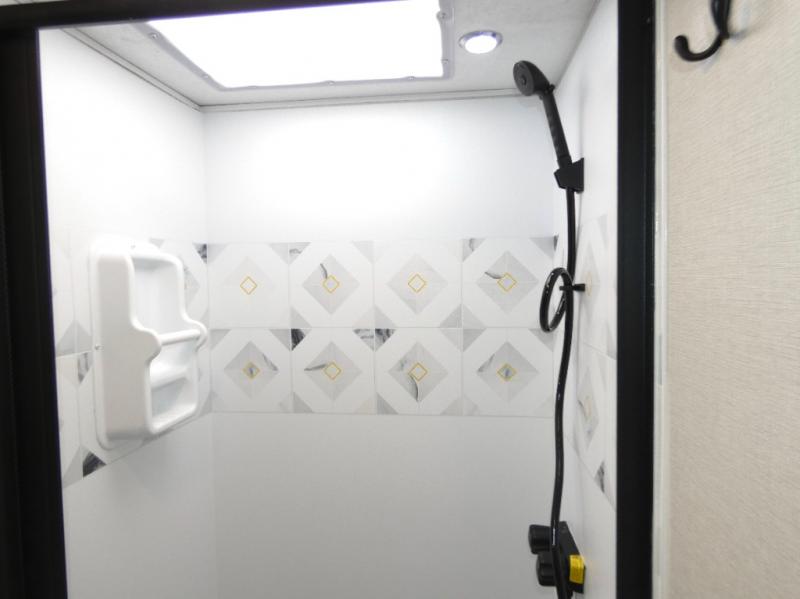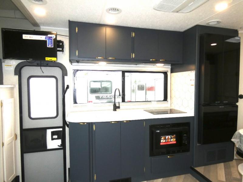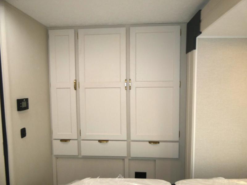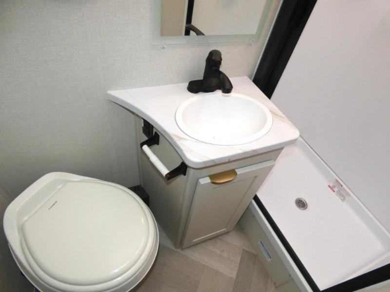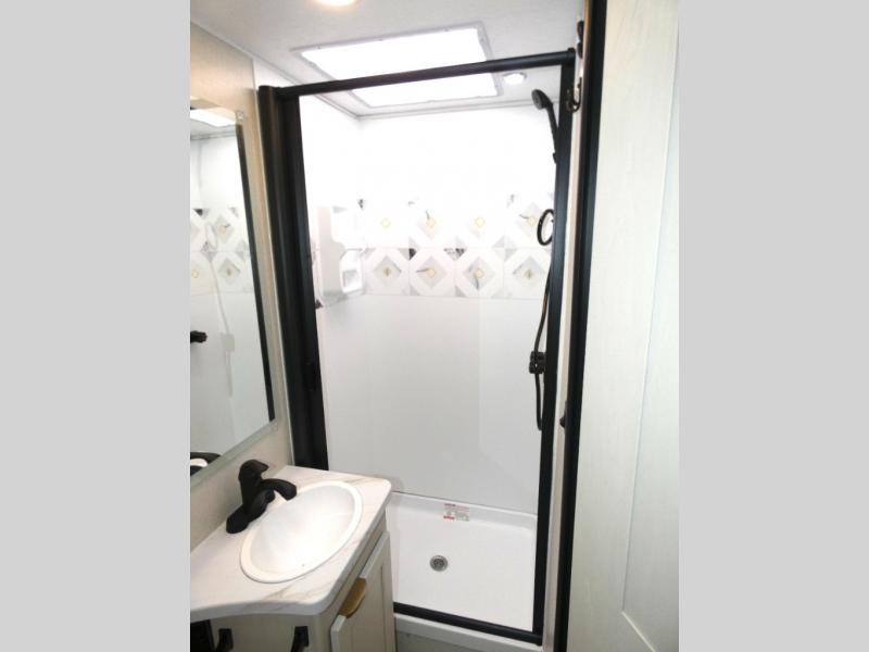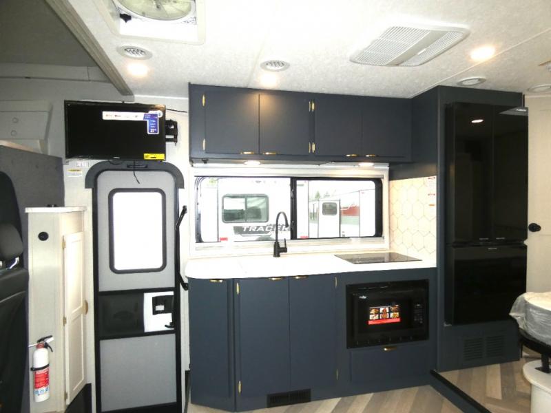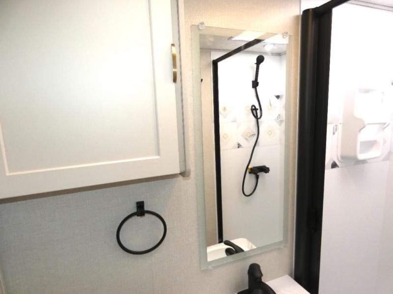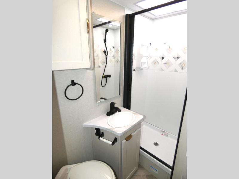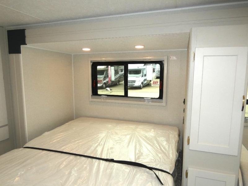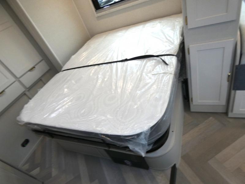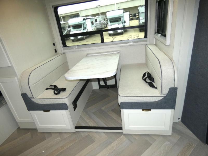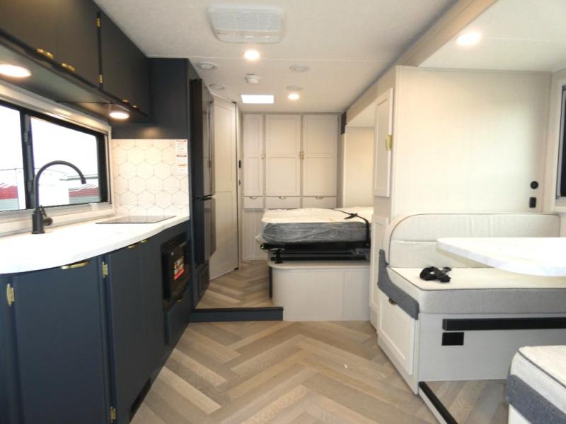 After enjoying the ride, you will love the destination while you relax inside at the booth dinette or choose the optional recliners in this coach. The front 36" x 76" cab over bunk provides sleeping or storage space, and the full galley kitchen allows you to make warm meals and store leftovers. You will also have overhead cabinets to stow away your dishes and dry goods. There is an RV queen bed, a nightstand, and a large back wall wardrobe and linen storage, plus a full bathroom in the rear corner of this coach to be able to sleep comfortably and get refreshed each day wherever you are.