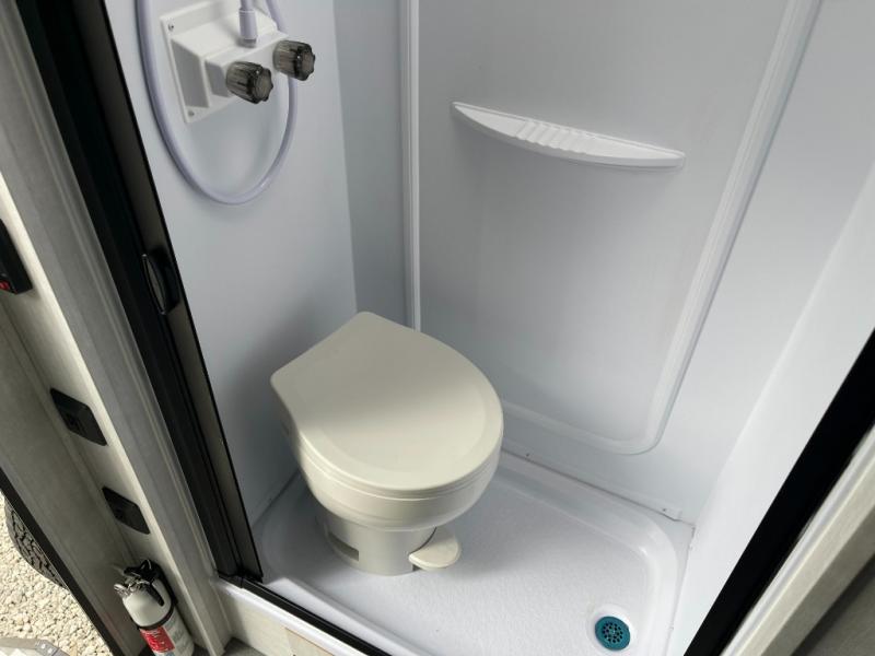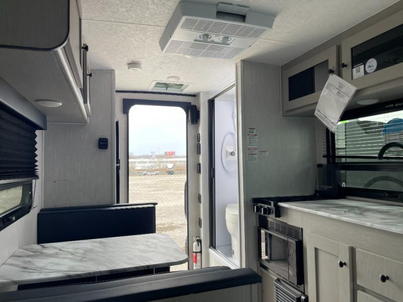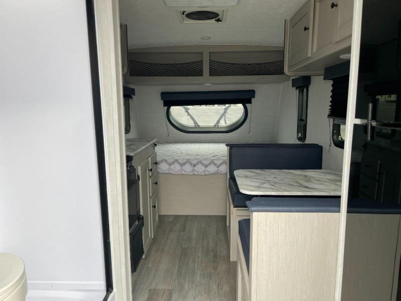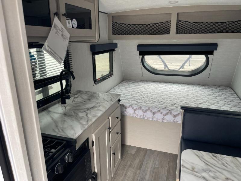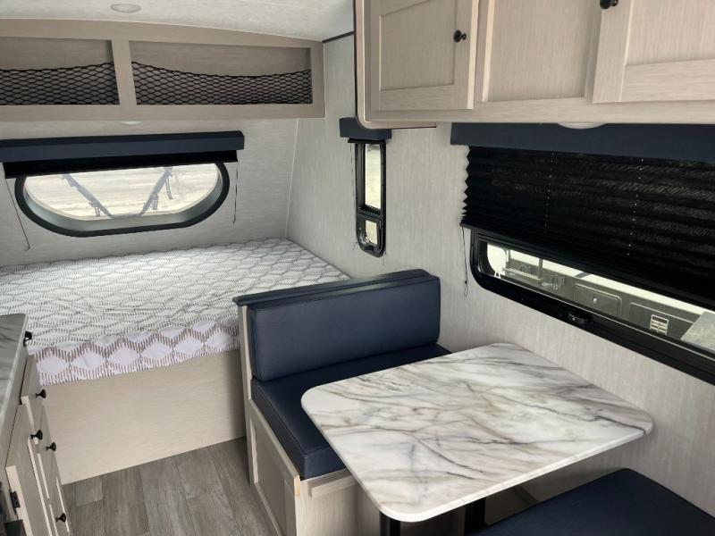 This cute Remote trailer for two or three features a rear entry/exit door, a comfortable queen bed up front with an overhead cabinet, and a wet bath to freshen up after a hike. For meals you can choose to cook inside or out with a two burner cooktop and microwave oven indoors, or use the outside griddle for a fun breakfast lunch or dinner outside. And a booth dinette will provide a place to dine at, or you can take your plate outdoors to sit under the 10' power awning with an LED light.