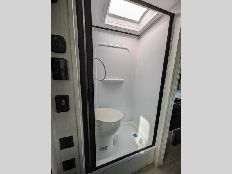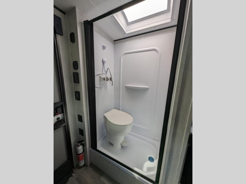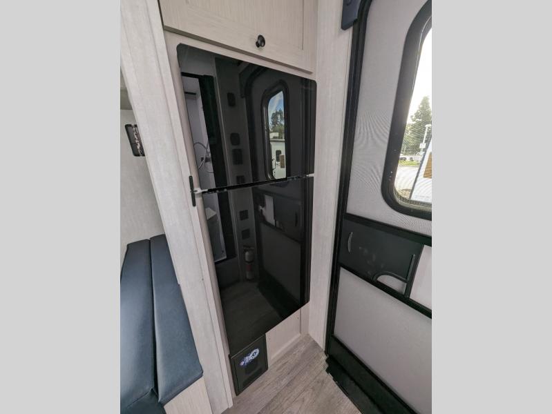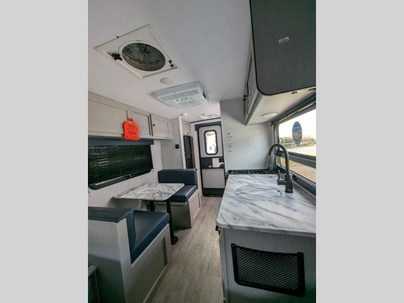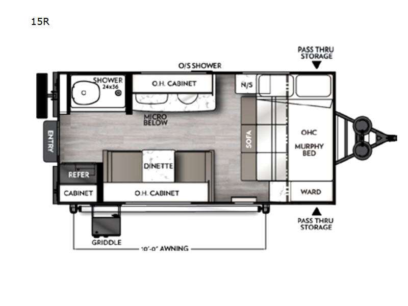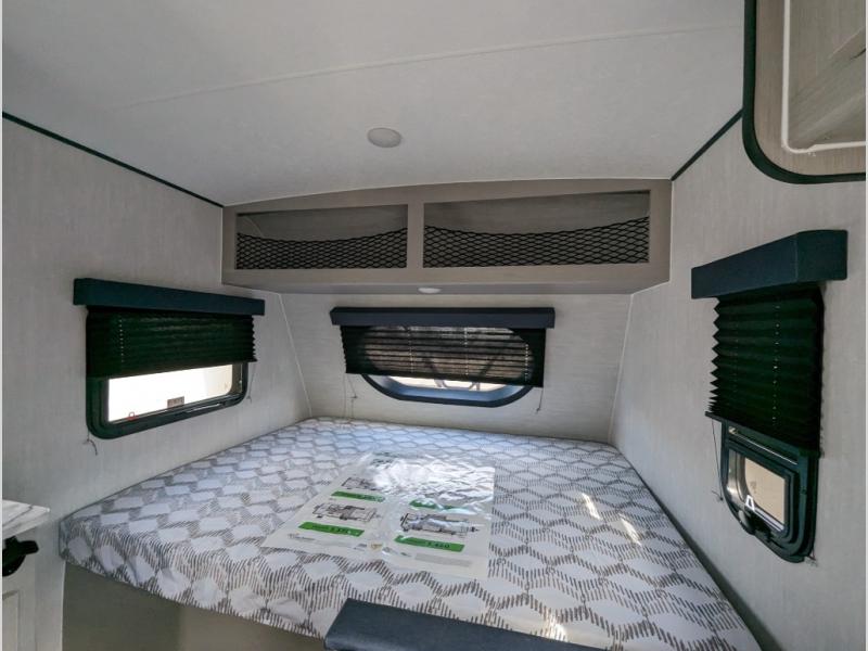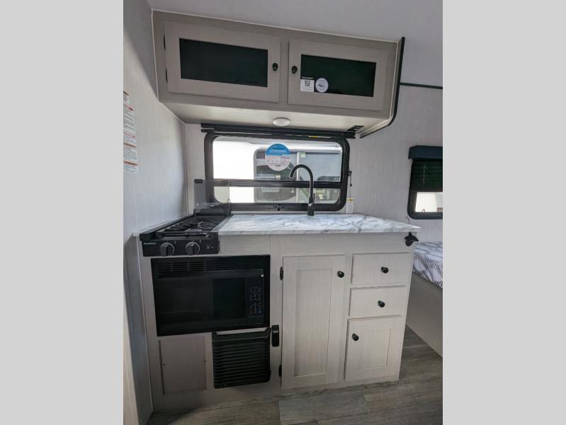 This cute Remote trailer for two or three features a rear entry/exit door, a comfortable queen bed up front with an overhead cabinet, and a wet bath to freshen up after a hike. For meals you can choose to cook inside or out with a two burner cooktop and microwave oven indoors, or use the outside griddle for a fun breakfast lunch or dinner outside. And a booth dinette will provide a place to dine at, or you can take your plate outdoors to sit under the 10' power awning with an LED light.