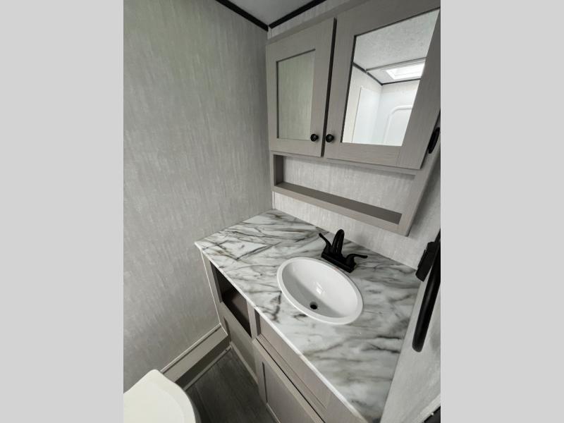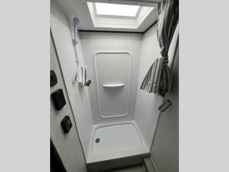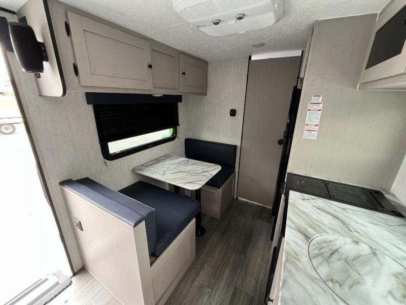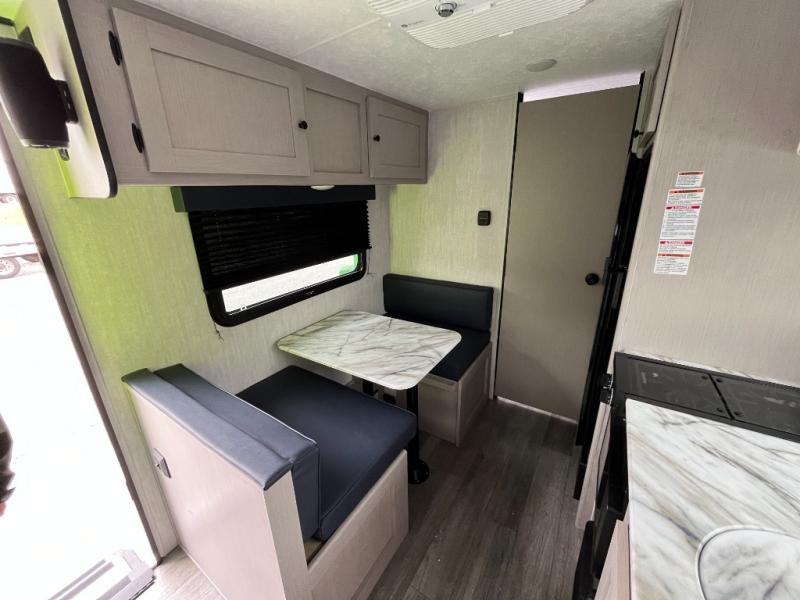 Enjoy camping in this cute Remote trailer features a rear full bath including shower with skylight for more natural lighting, a vanity with sink, and overhead storage. A 54" x 74" bed will be waiting for two of you to provide a comfortable night's rest, and if you have a third camper you can convert the booth dinette for sleeping for one more, or maybe two small children. Dine inside at the booth dinette and play card games at the table, or enjoy spending time outside under the 13' power awning with LED light. You can even cook burgers and dogs while enjoying nice weather with the help of the outdoor cast iron griddle.