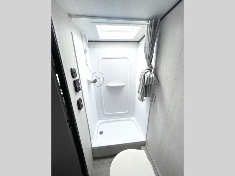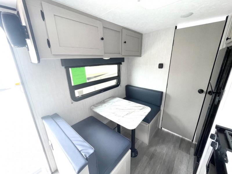 Enjoy camping in this cute Remote trailer features a rear full bath including shower with skylight for more natural lighting, a vanity with sink, and overhead storage. A 54" x 74" bed will be waiting for two of you to provide a comfortable night's rest, and if you have a third camper you can convert the booth dinette for sleeping for one more, or maybe two small children. Dine inside at the booth dinette and play card games at the table, or enjoy spending time outside under the 13' power awning with LED light. You can even cook burgers and dogs while enjoying nice weather with the help of the outdoor cast iron griddle.